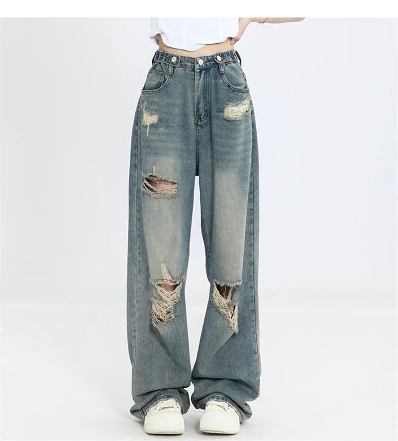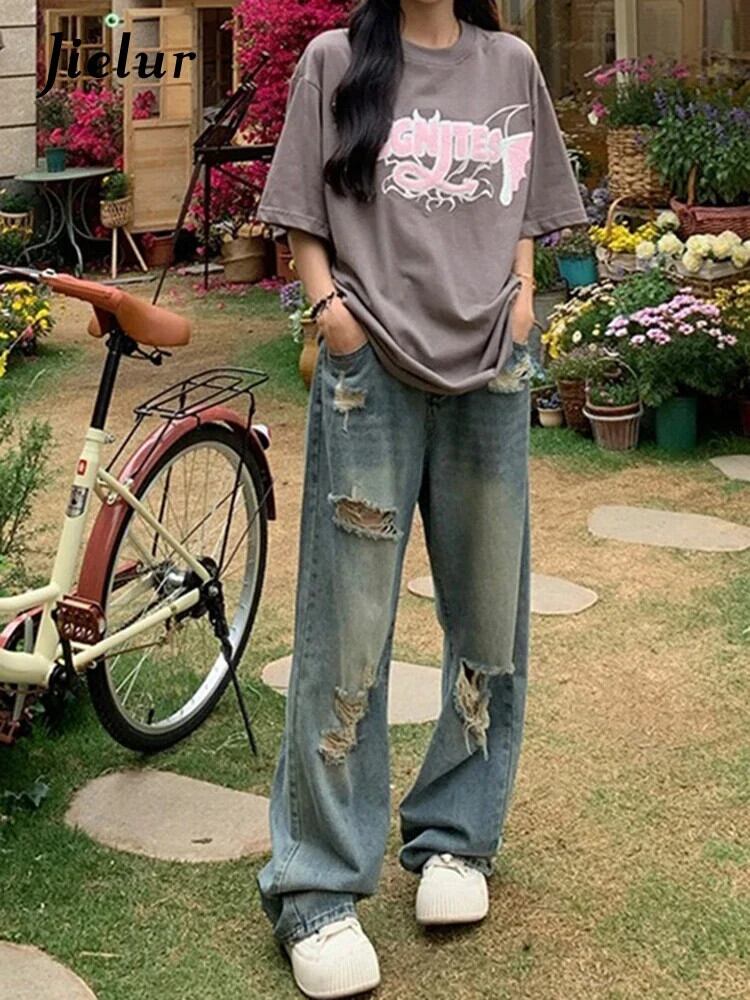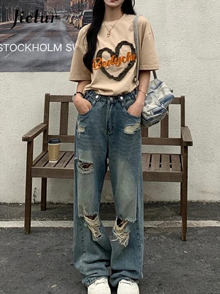 送料無料 Jielur 秋ウエストルーズスリムジーンズ女性アメリカンレトロ穴ジーンズブルーストリート Chicly ジーンズ女性 オータム 秋物 AE12188787814101008080