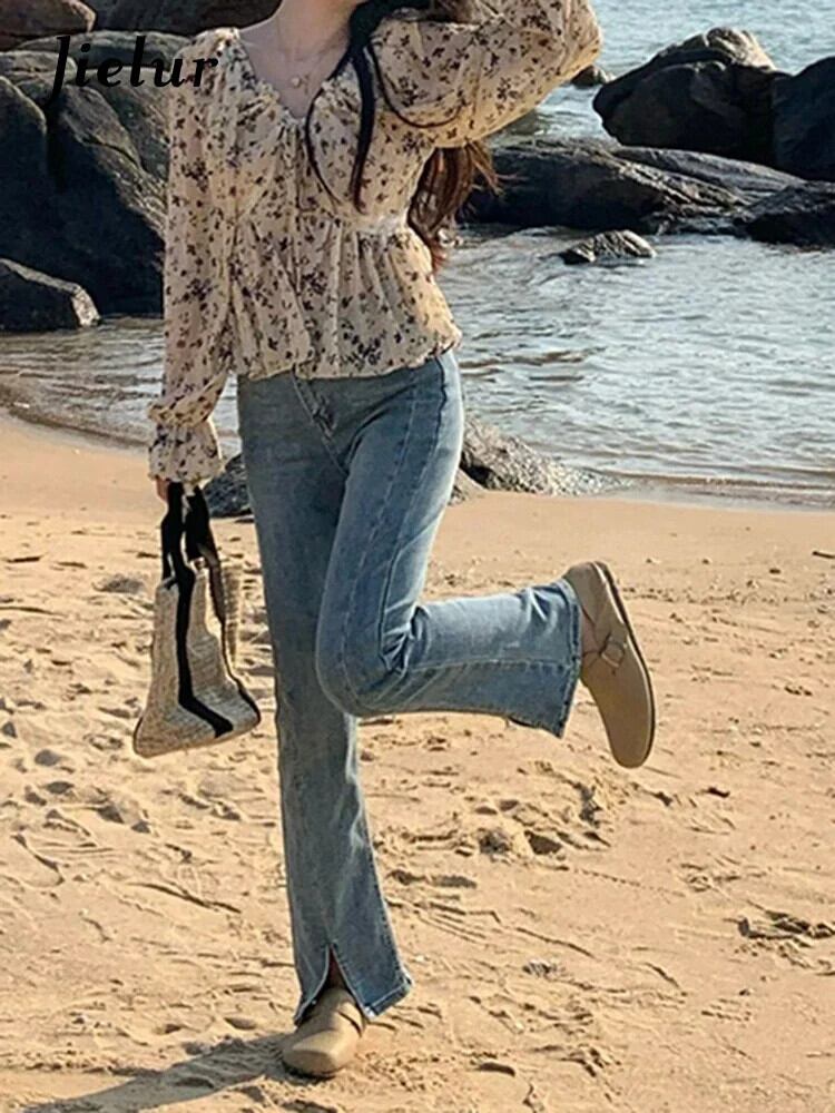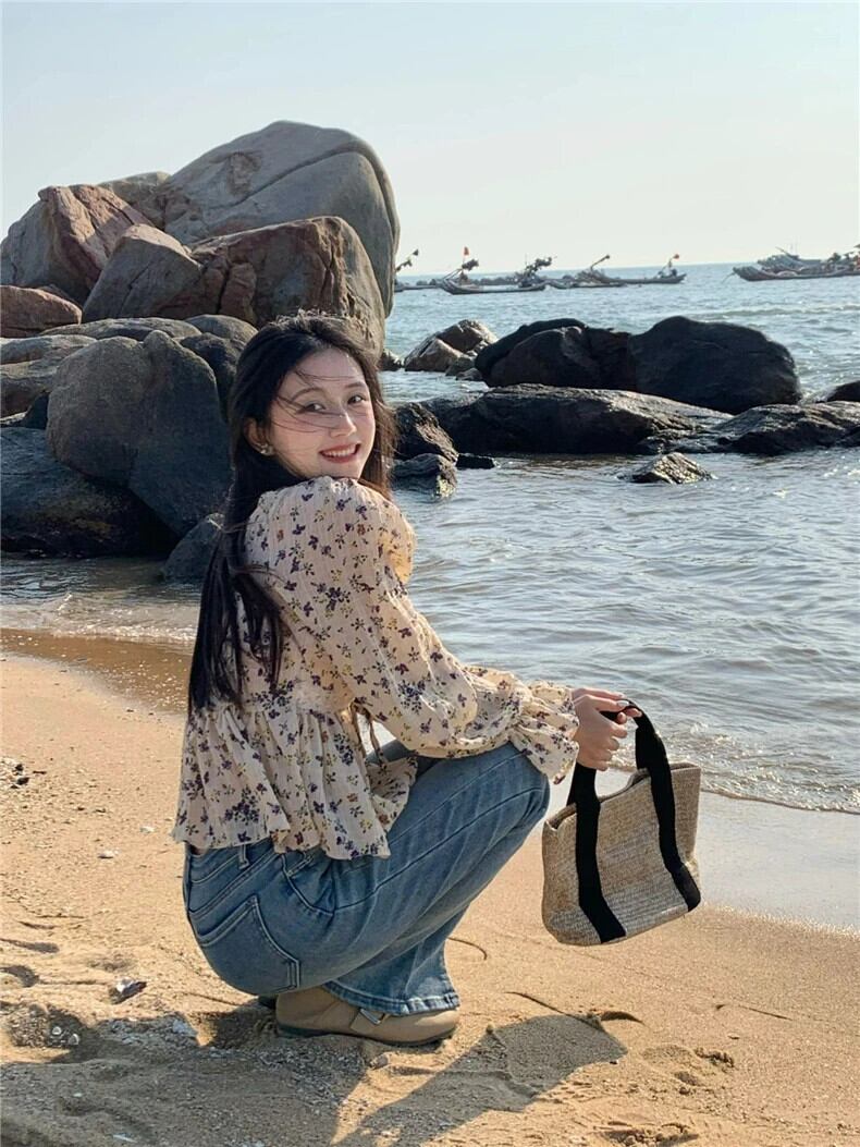 送料無料 Jielur 夏甘い女性ブラウス若いフランスの花柄ブラウス女性の基本的なスリム長袖トップ ロング 大人ガーリー スウィート キュート カジュアル サマー 夏物 AE12188787881904729333