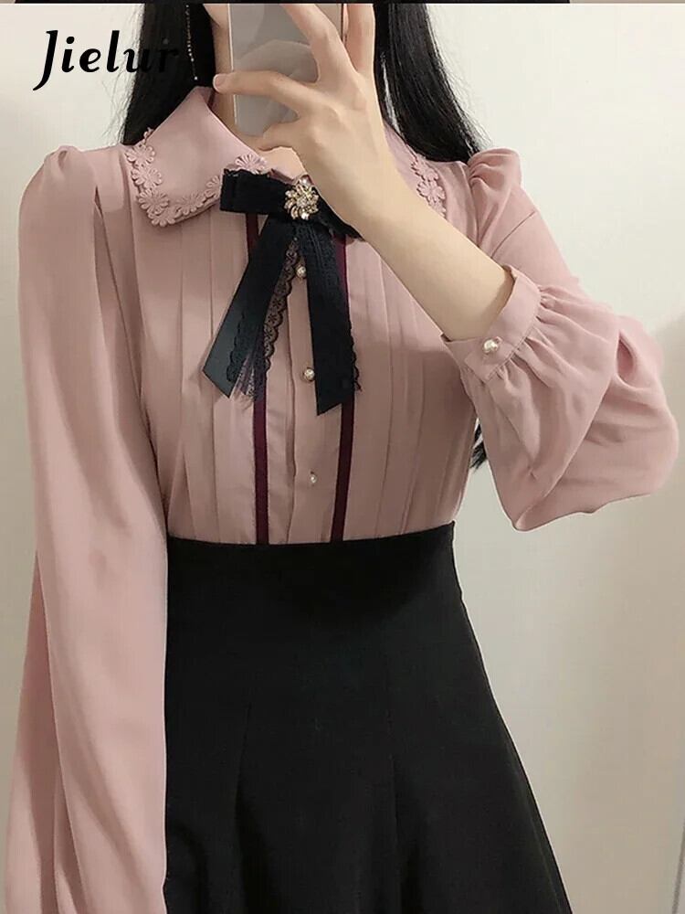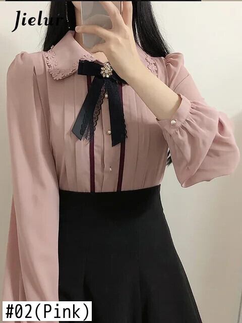 送料無料 Jielur 春の女性のかわいいトップスプレッピースタイルヴィンテージ eses ボタン mal シャツブラウスピンクホワイト 大人ガーリー スウィート キュート カジュアル スプリング 春物 ビンテージ AE12188787829642533334