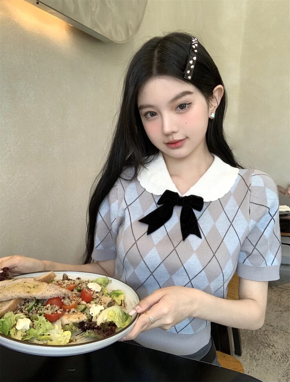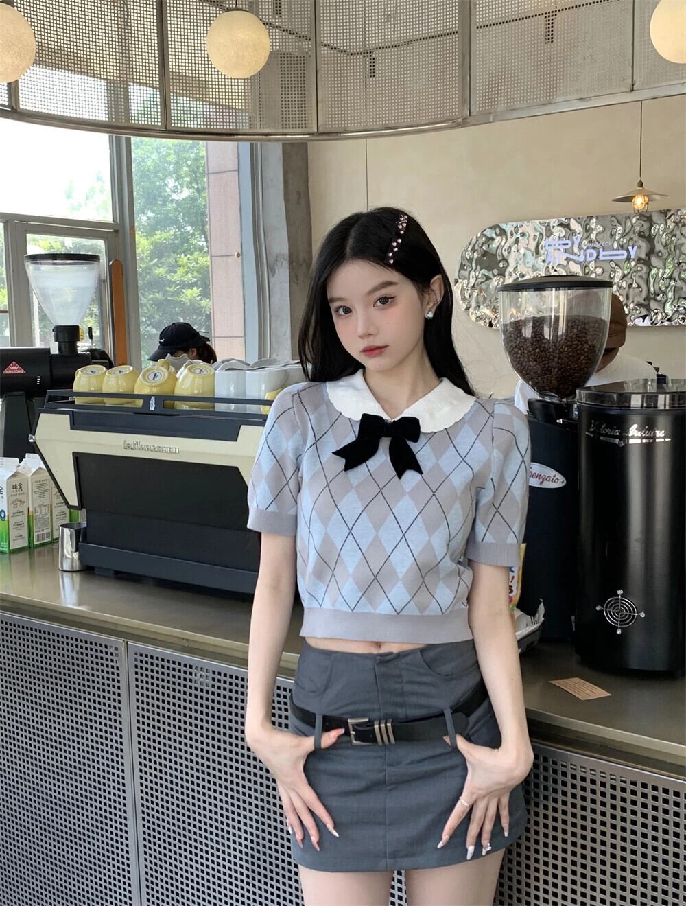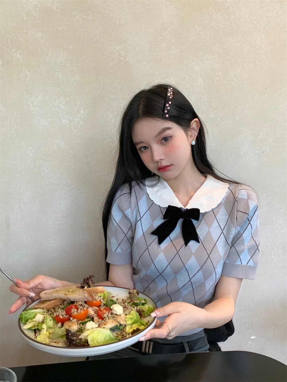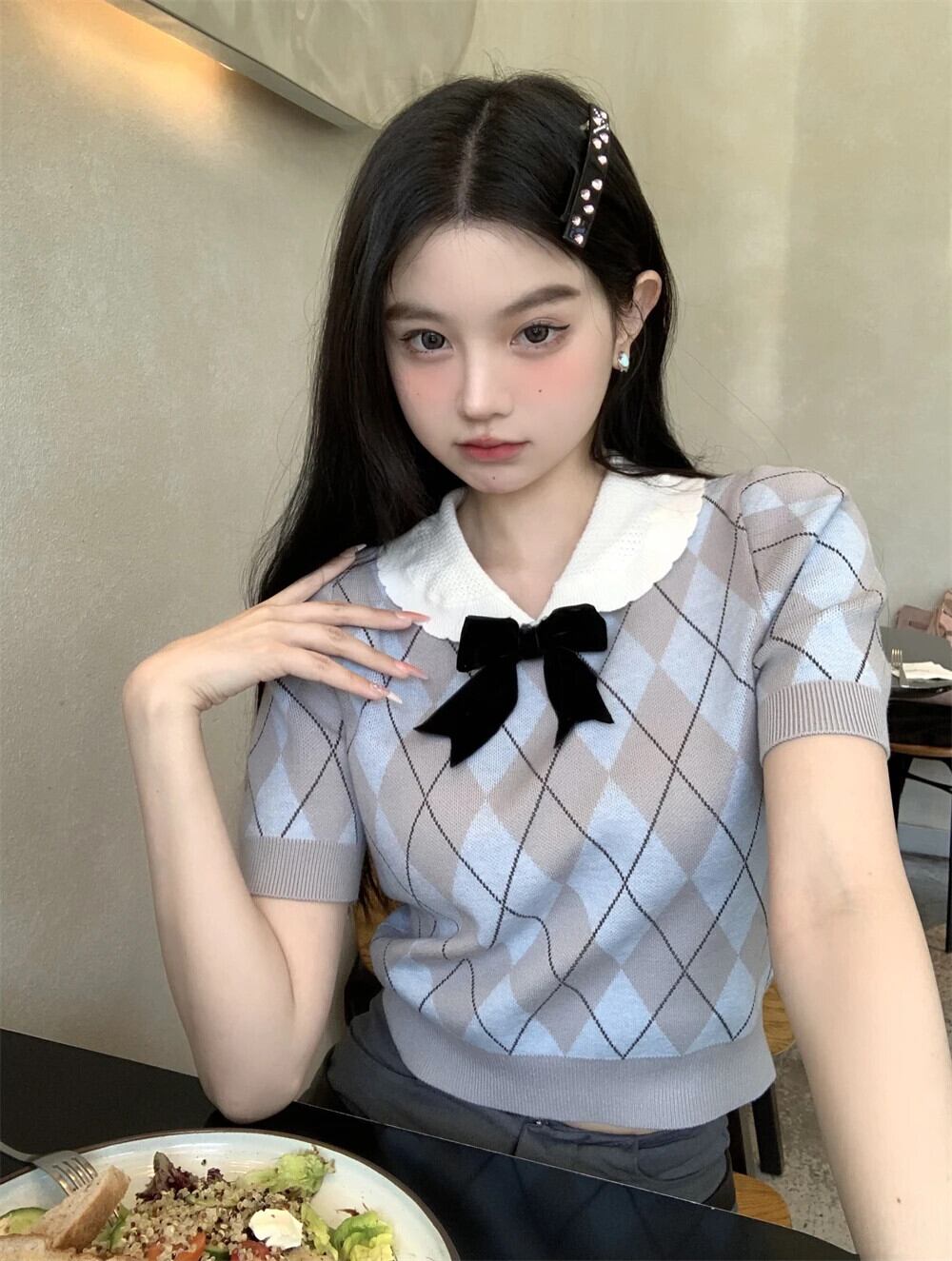 送料無料 Jielur 夏甘いコントラストカラーの女性ブラウススリムブラウス女性ちょう結びバブルスリーブニットトップ リボン 大人ガーリー スウィート キュート カジュアル サマー 夏物 AE12188787820846502447
