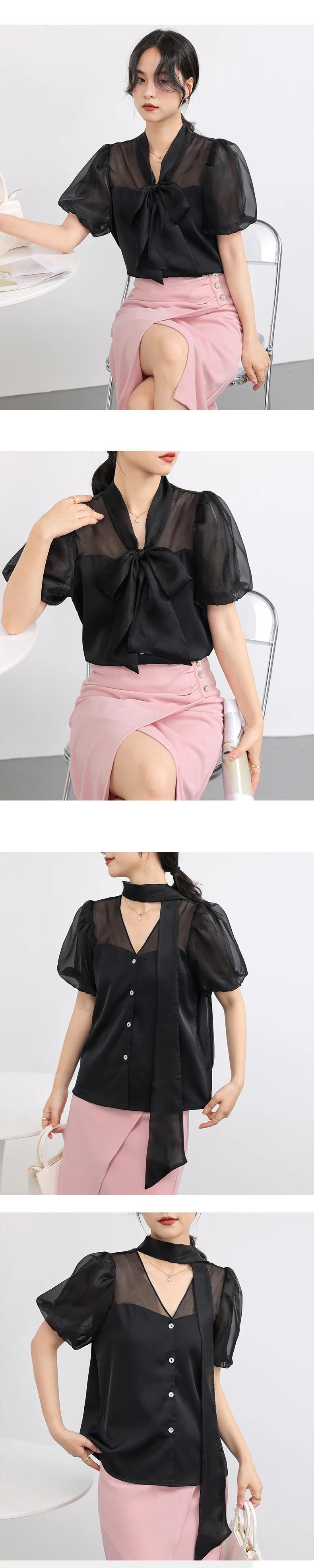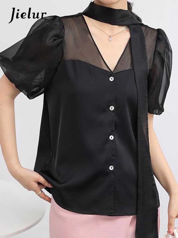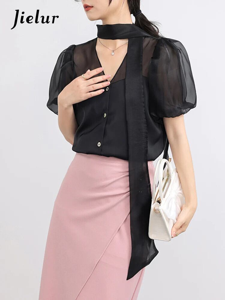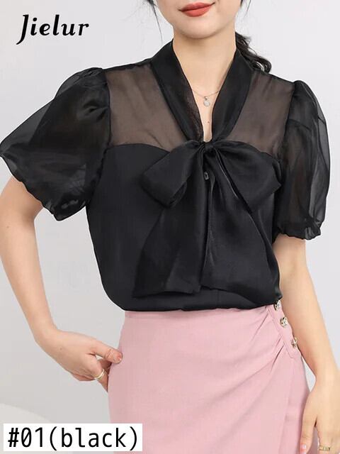 送料無料 Jielur 夏無地スリム女性ブラウス甘いブラウス女性ベージュアプリコット黒ルーズ O ネックトップ ブラック 大人ガーリー スウィート キュート カジュアル サマー 夏物 Oネック ソリッドカラー AE12188787857166573609