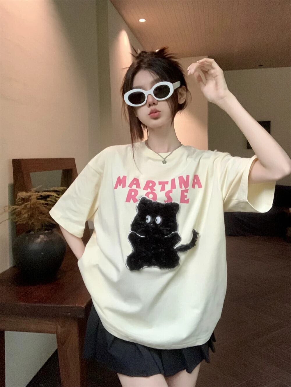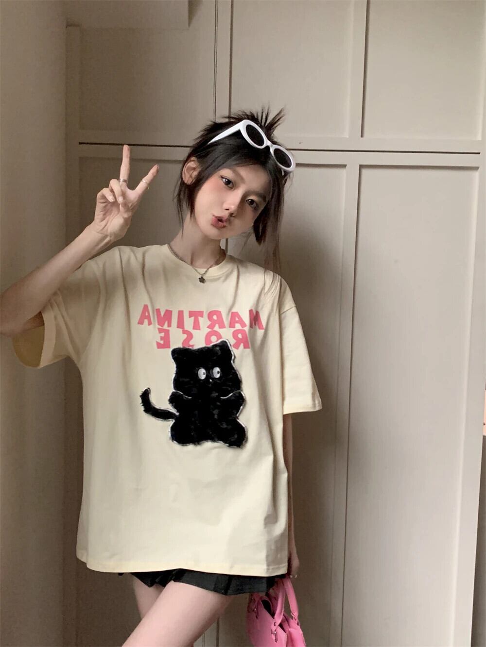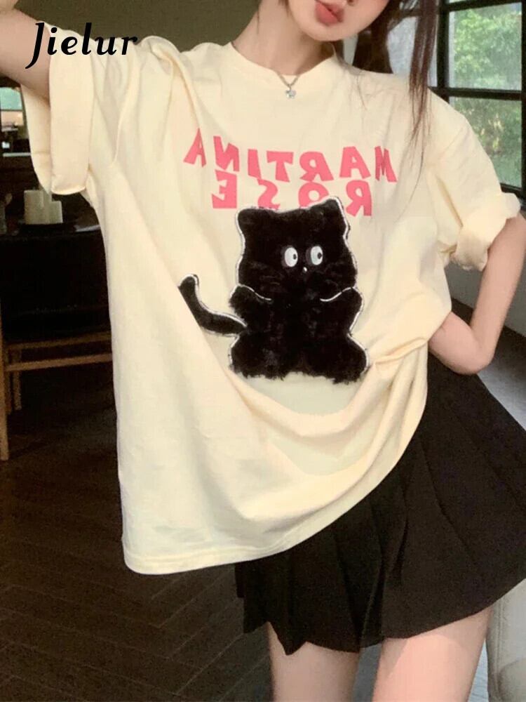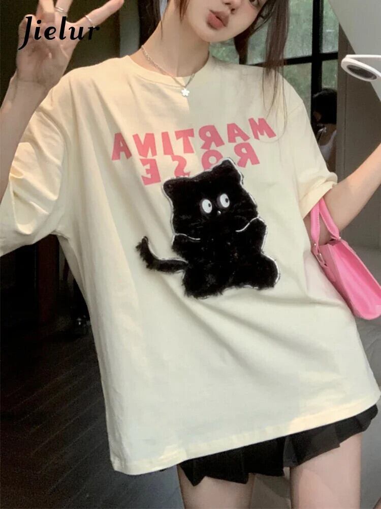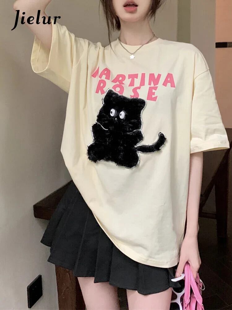 送料無料 Jielur 夏アメリカン刺繍女性の Tシャツルーズ Tシャツ女性アプリコット Chicly ストリート O ネックトップ サマー 夏物 Oネック AE12188787838520704630