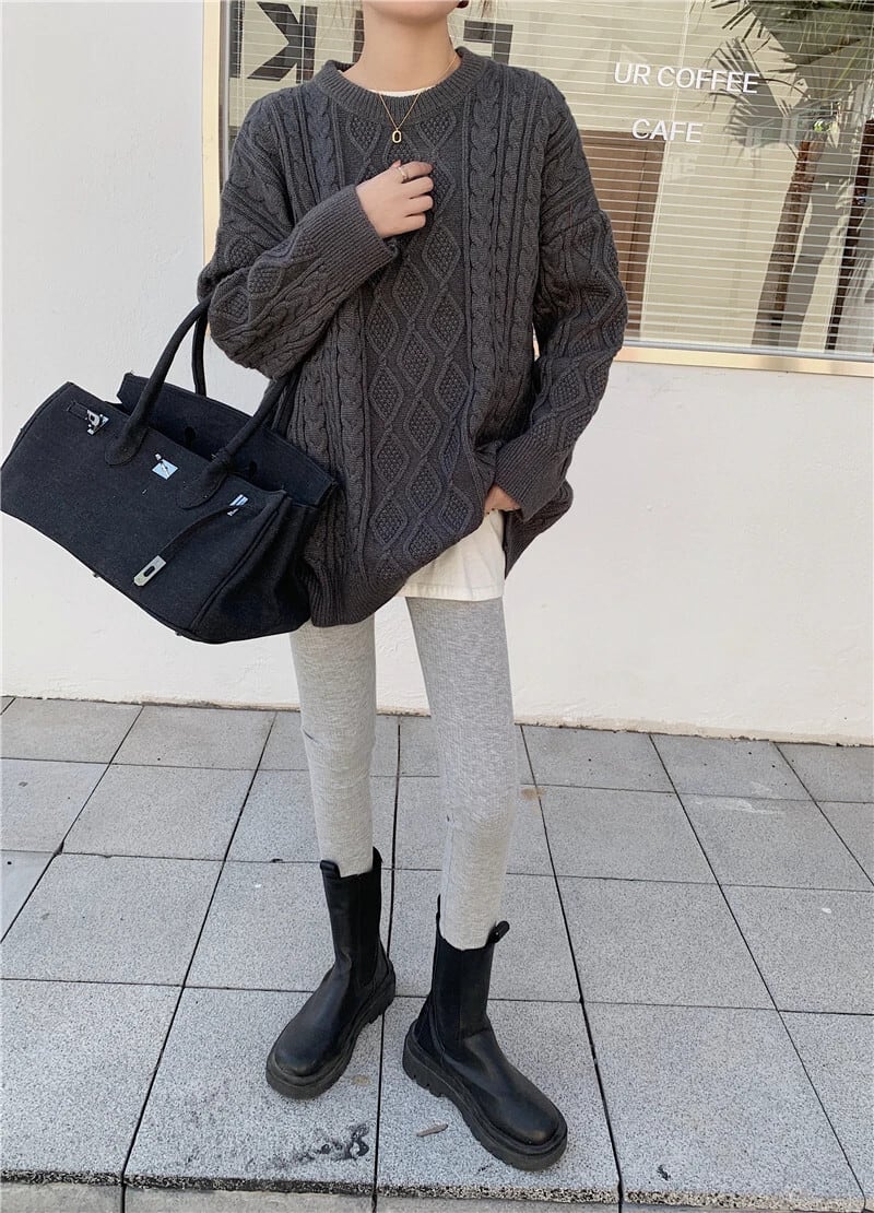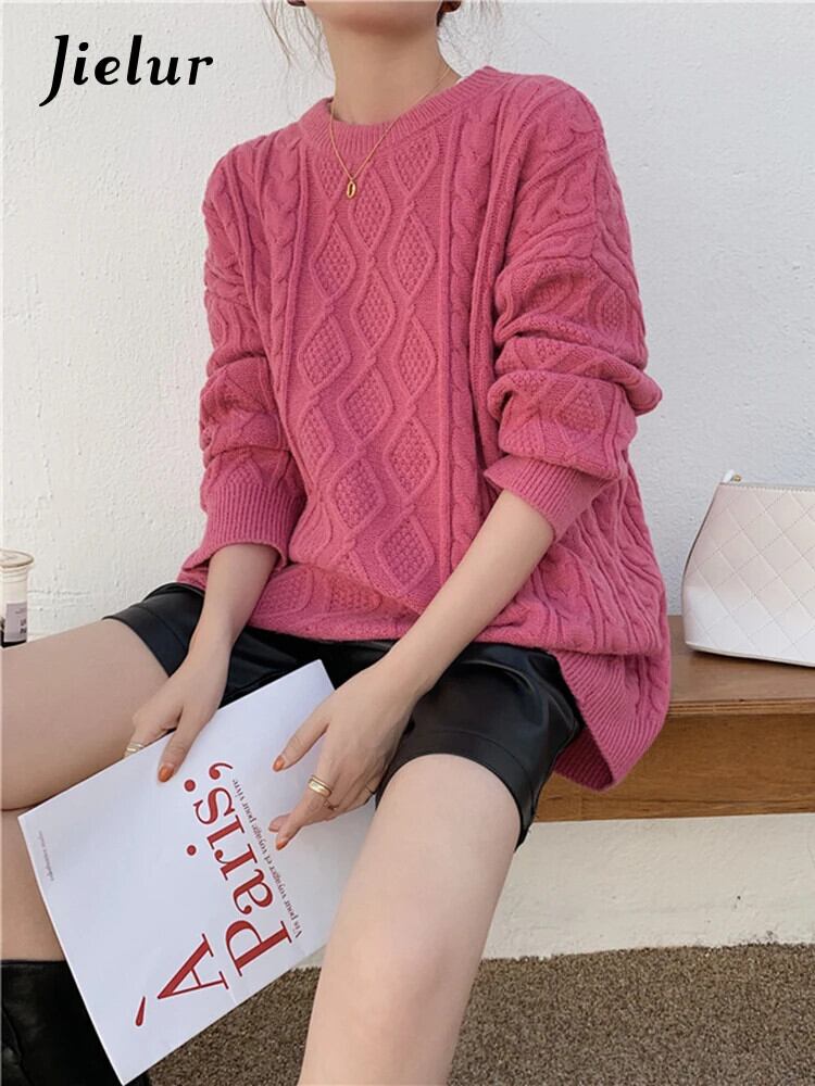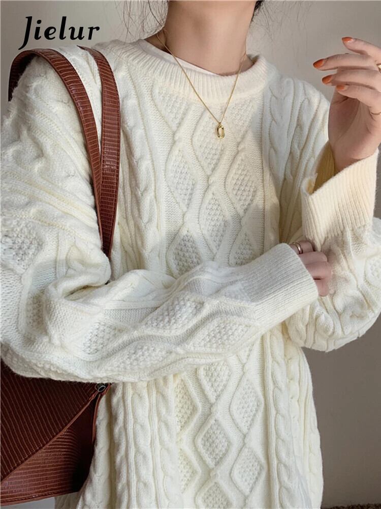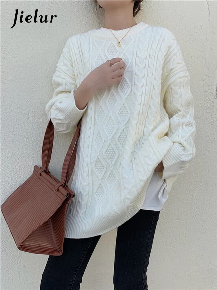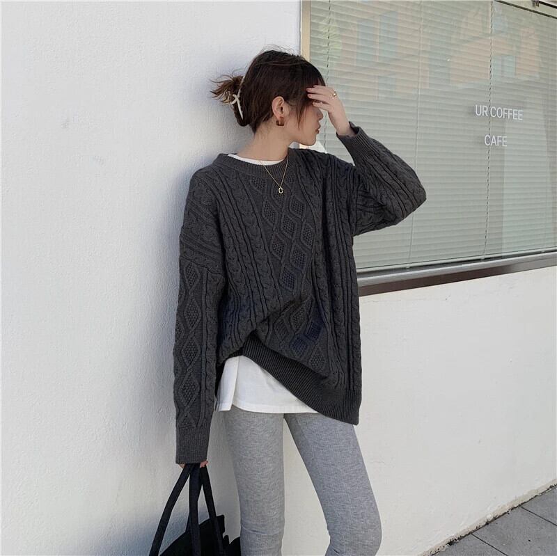 送料無料 Jielur O ネック厚いツイストグレーセーター女性の冬暖かいニットジャンパー長袖ルーズセータープルオーバー ロング ウィンター 冬物 Oネック AE12188787838772023175
