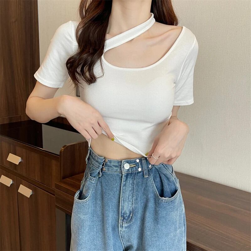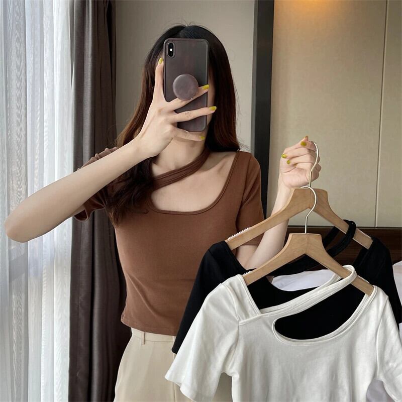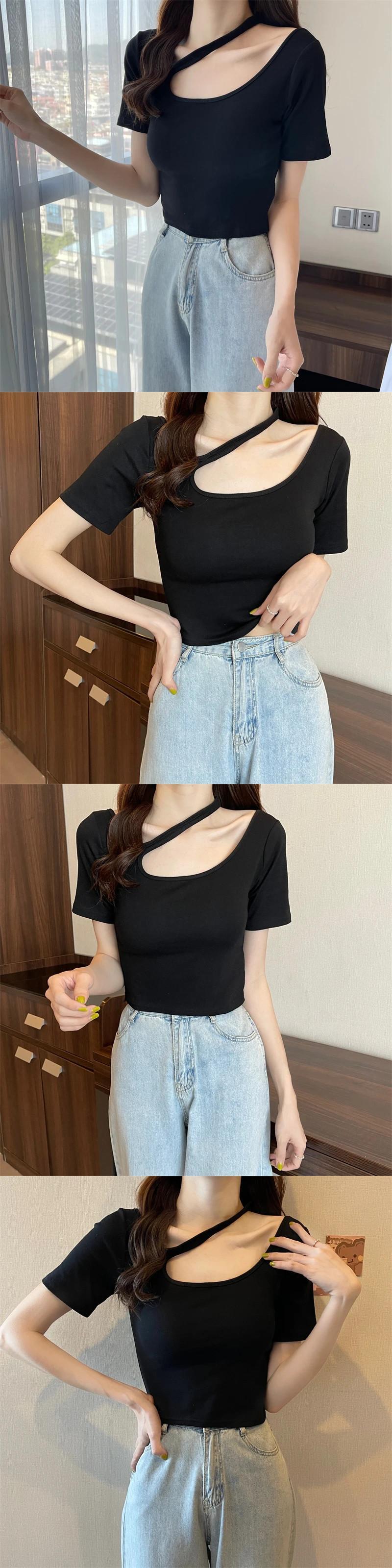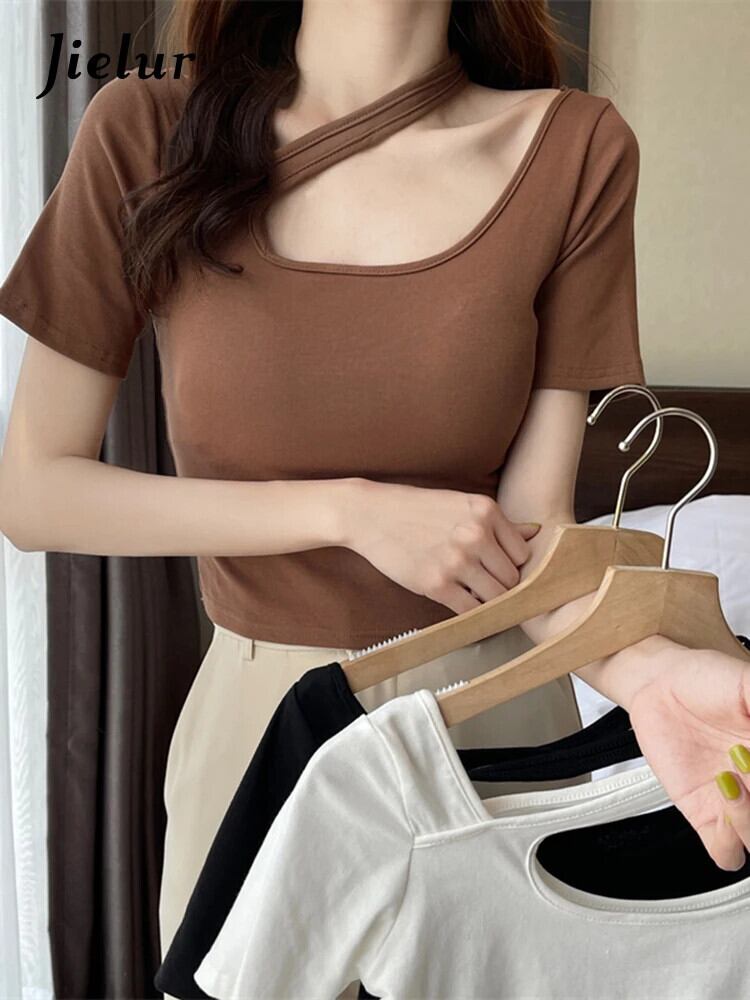 送料無料 Jielur 無地 Tシャツ女性の夏の半袖 Tシャツカーキ黒中空アウトセクシーなクロップトップ ショート ブラック ハーフスリーブ サマー 夏物 ソリッドカラー AE12188787880238606061