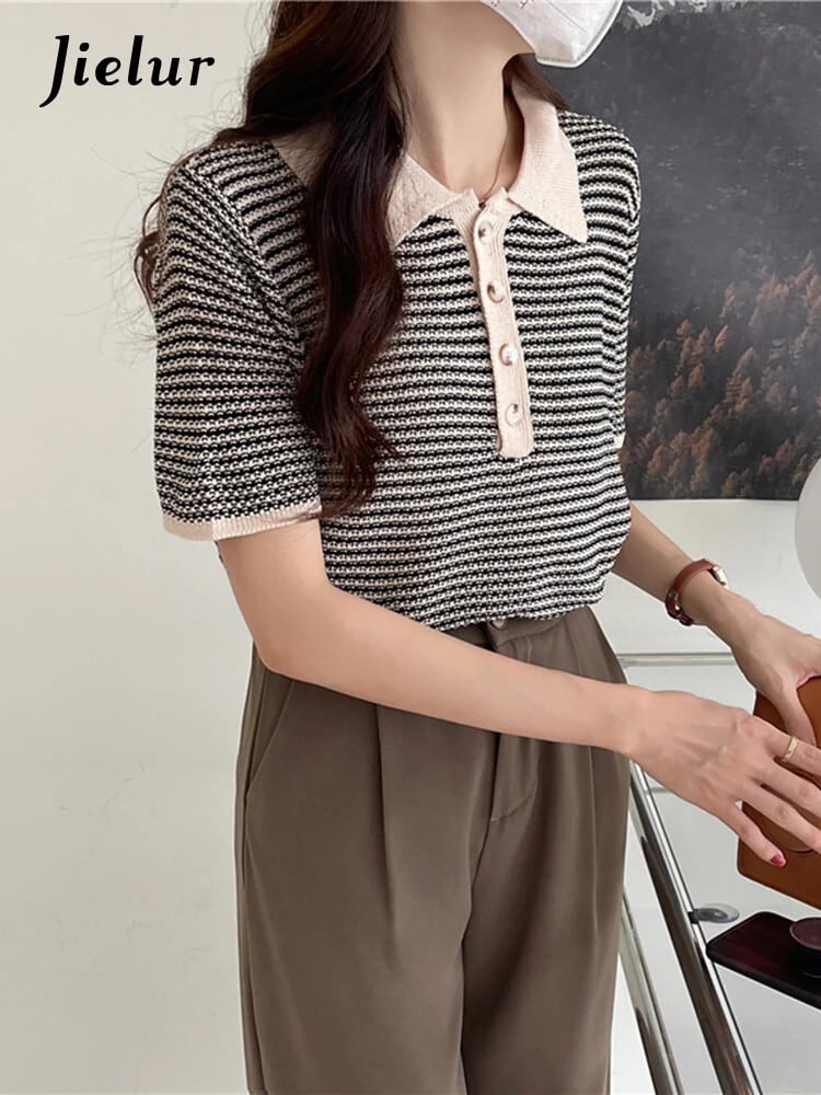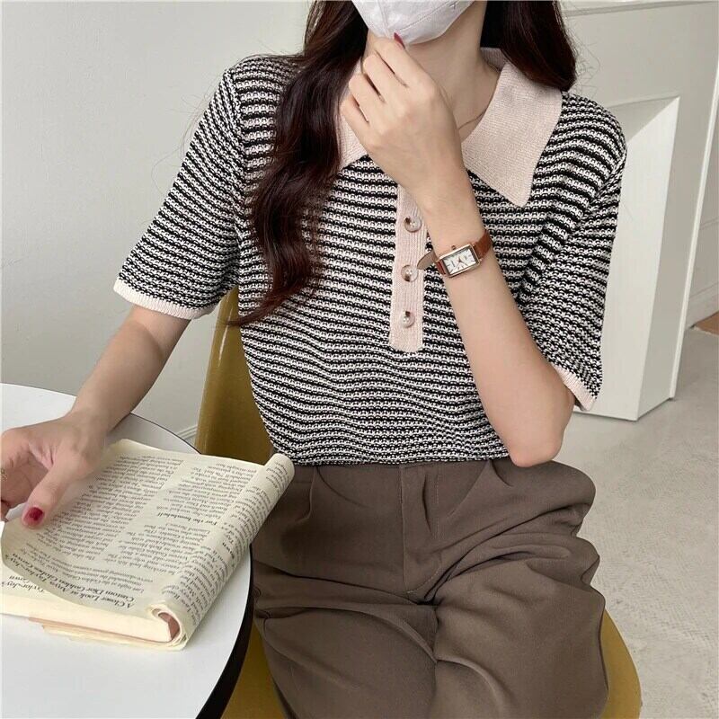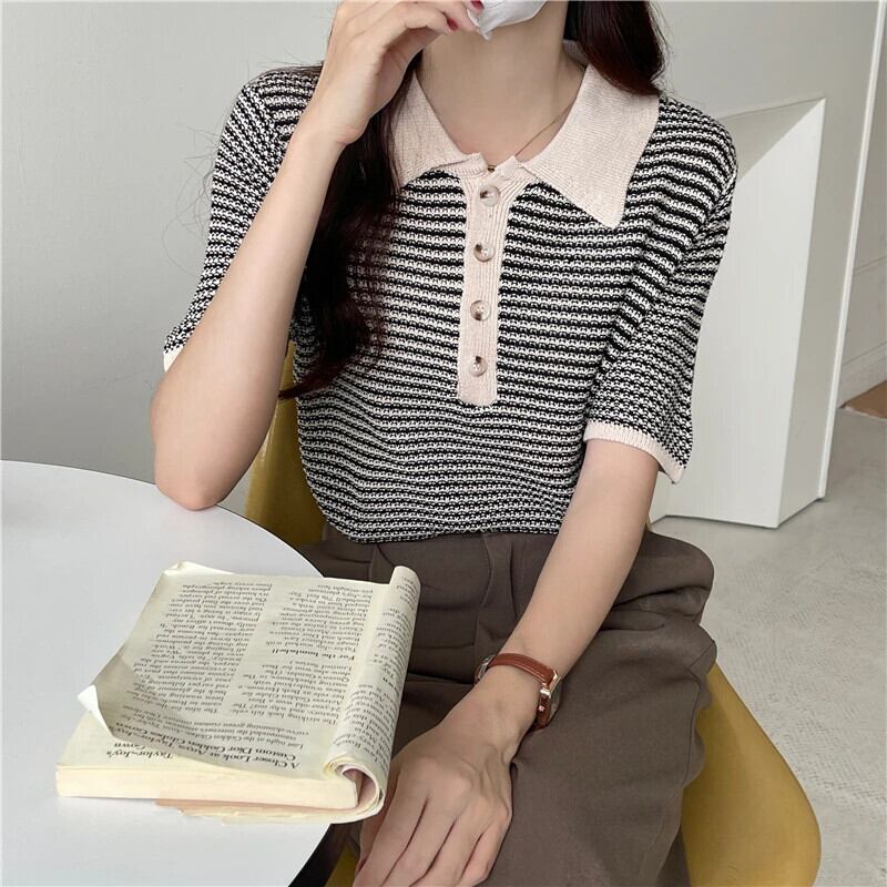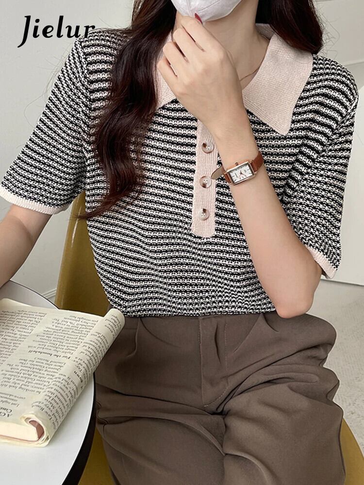 送料無料 Jielur ヒットカラーの女性の Tシャツ半袖ポロカラーレトロベーシックトップス夏 2022 黒、白 Tシャツ ショート ホワイト ブラック ハーフスリーブ サマー 夏物 AE12188787899787765675