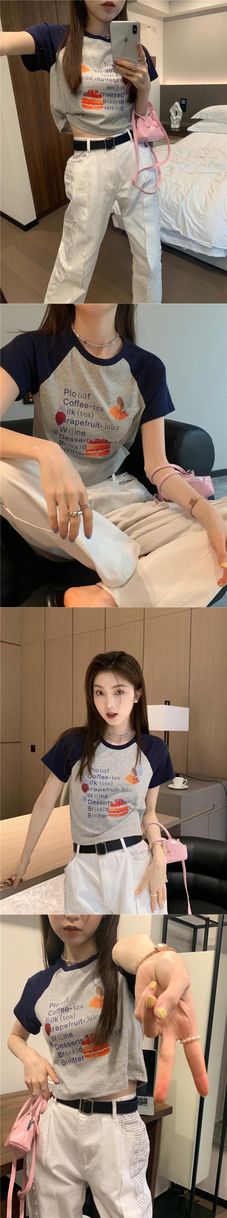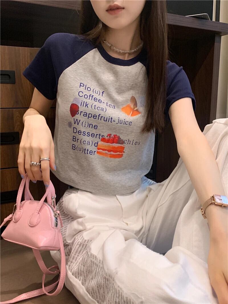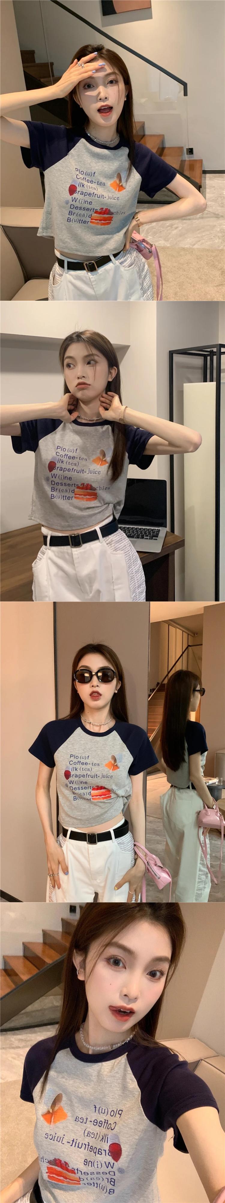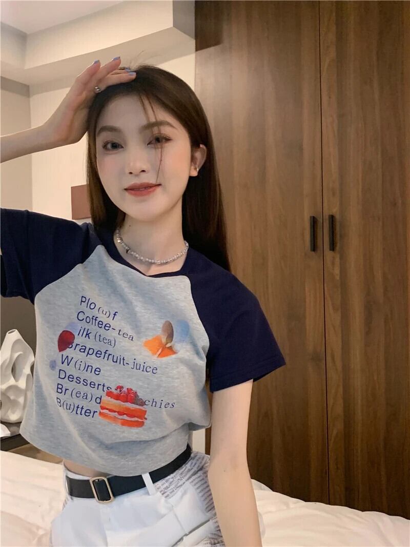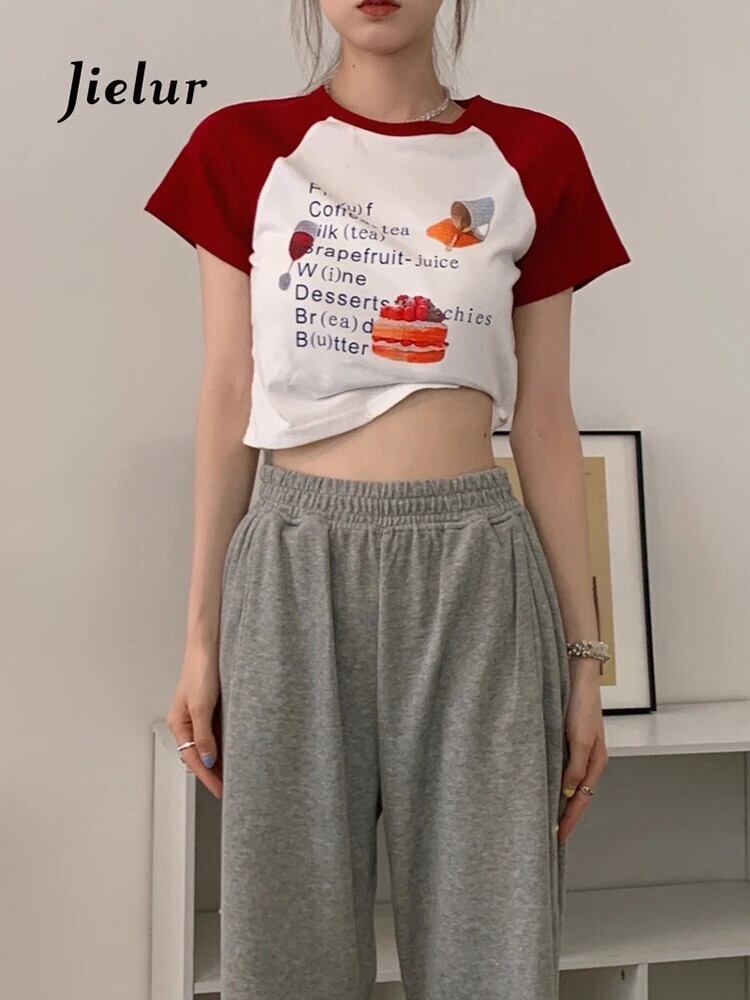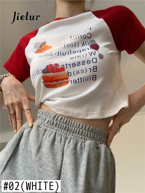送料無料 Jielur 漫画の手紙スリム半袖 Tシャツヒットカラー O ネック Tシャツ白クロップトップス女性の夏 ショート ホワイト ハーフスリーブ サマー 夏物 Oネック AE1218878782186616348