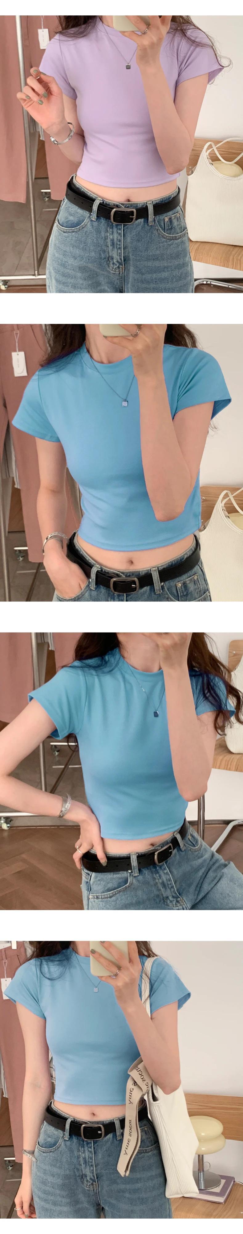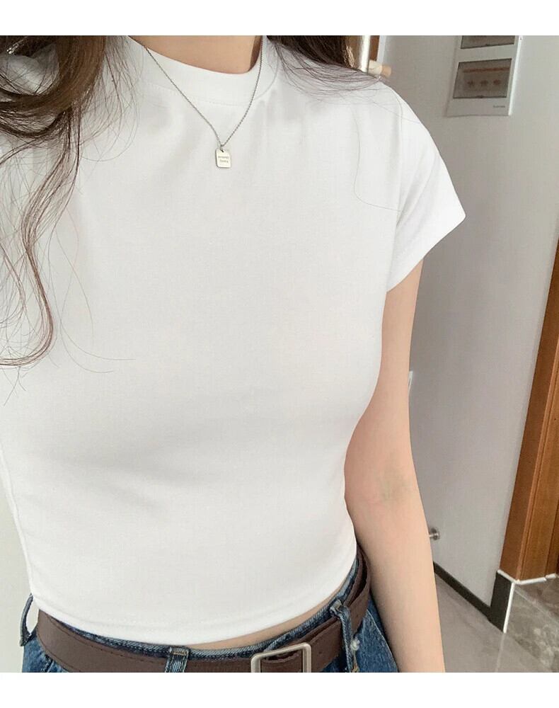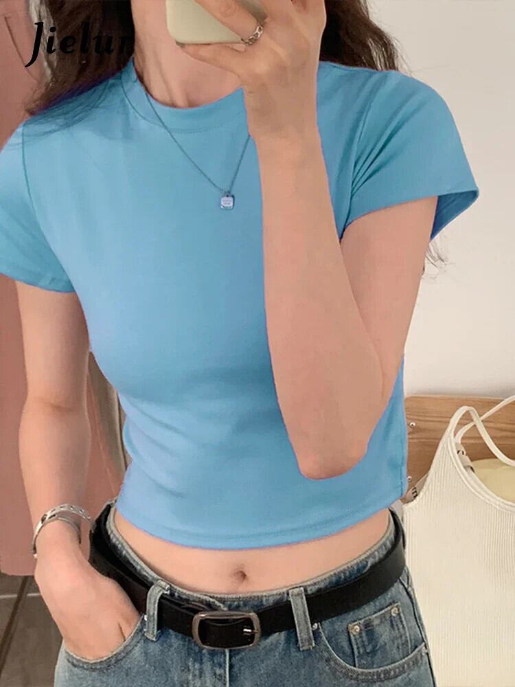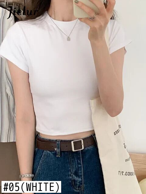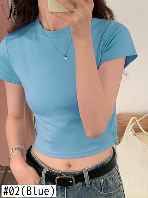 送料無料 Jielur 夏ソリッドカラーの女性の Tシャツシンプルなスリムベーシックトップ白黒グレーブルーパープル Tシャツ女性 ホワイト ブラック サマー 夏物 AE12188787848402189573