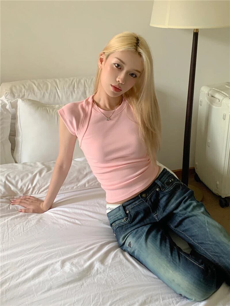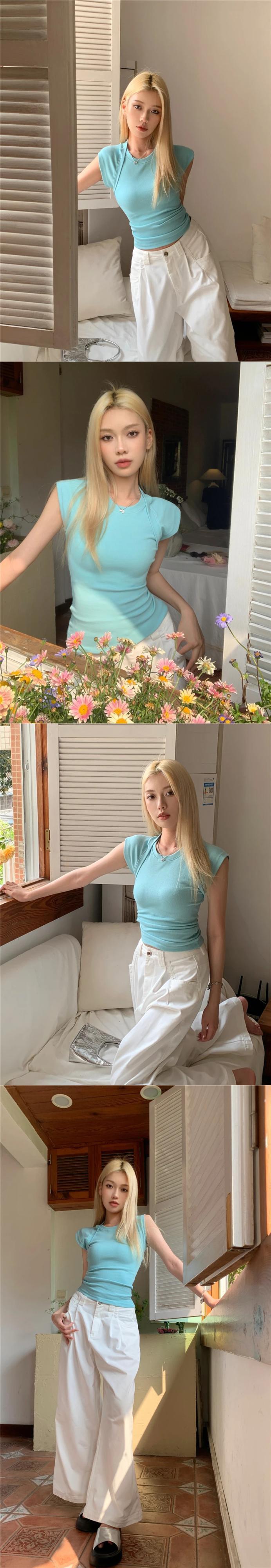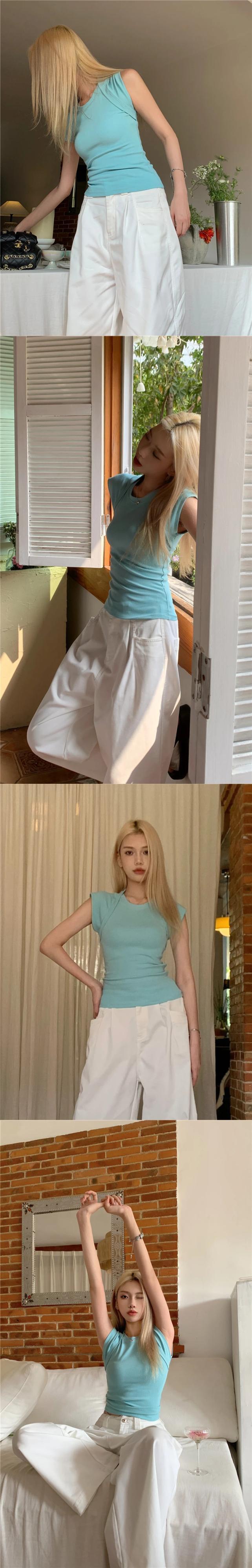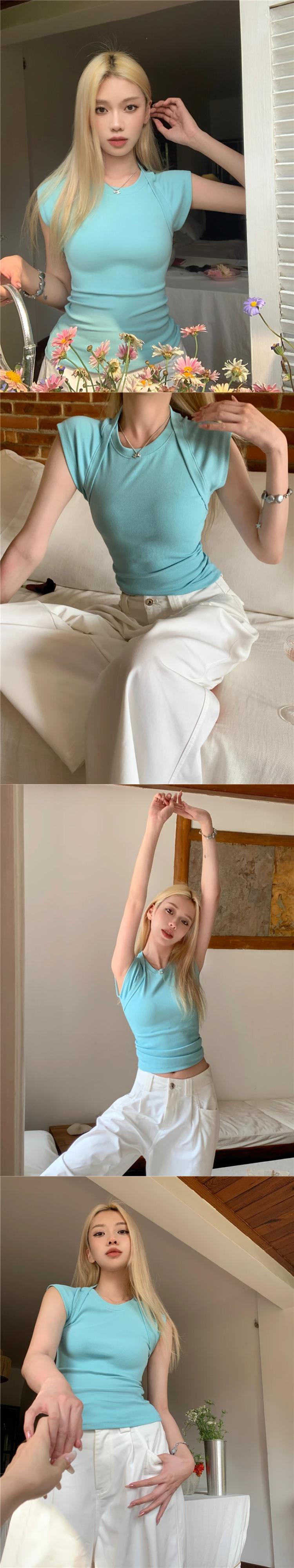 送料無料 Jielur 夏フェイク 2 枚スリム Tシャツ O ネック無地シンプルな女性の Tシャツピンクレイクブルーノースリーブベーシックトップ サマー 夏物 Oネック ソリッドカラー AE12188787830403929821