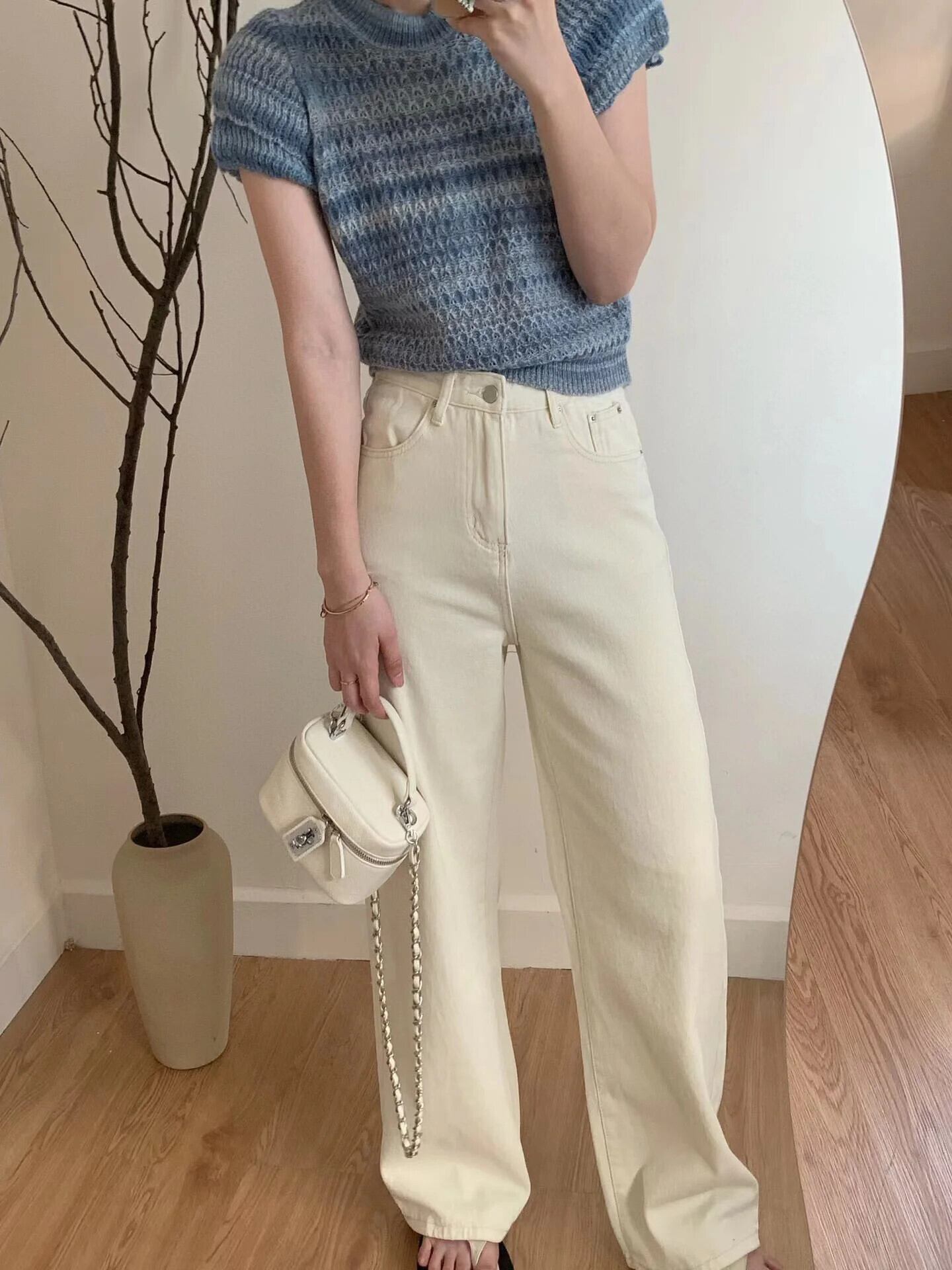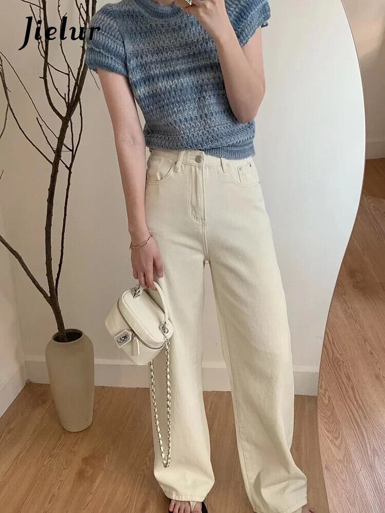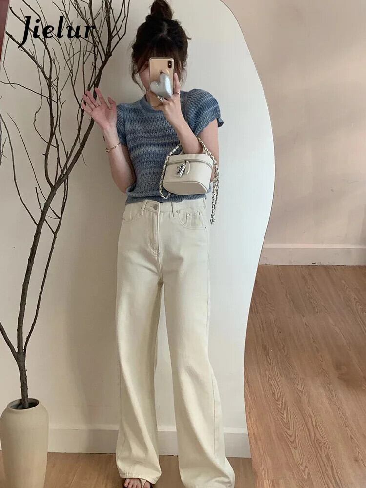 送料無料 Jielur 春ストレートシンプルベーシックレディースジーンズウエストスリムソリッドカラーデニムライトボタンパンツ スプリング 春物 AE12188787891370206354