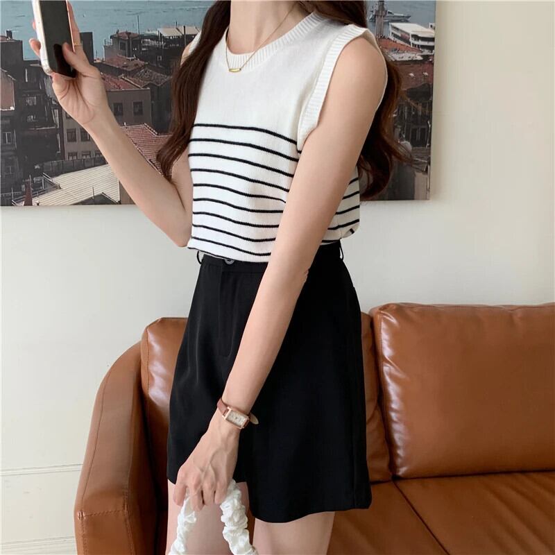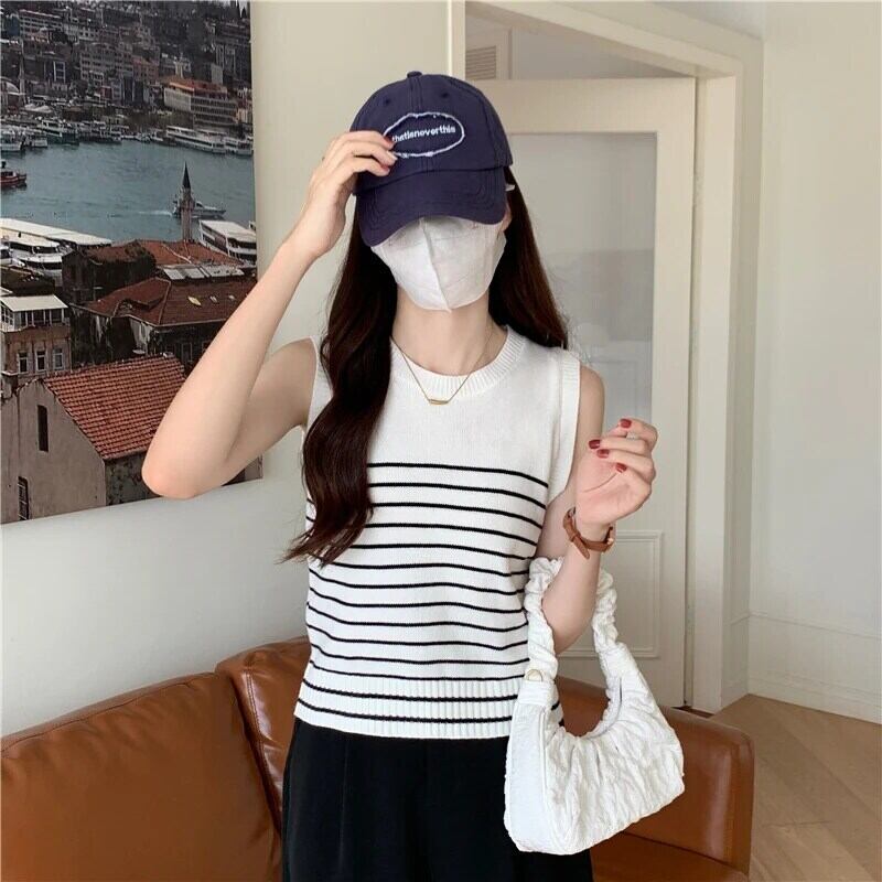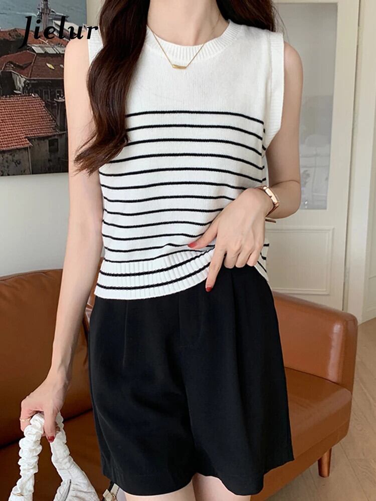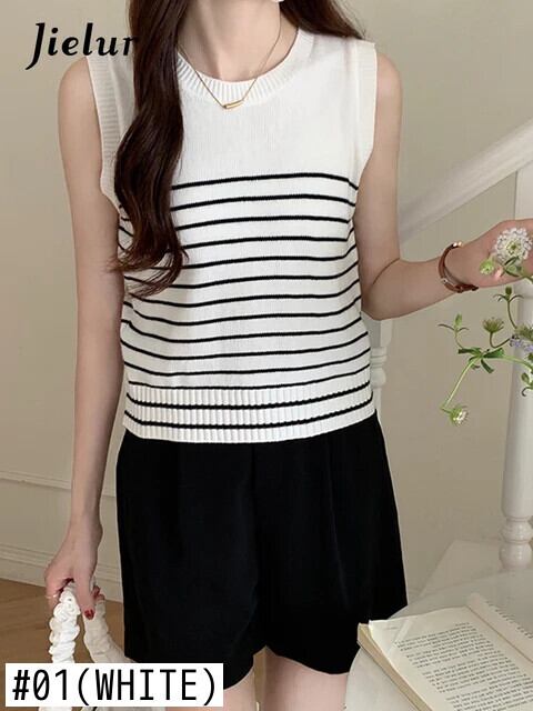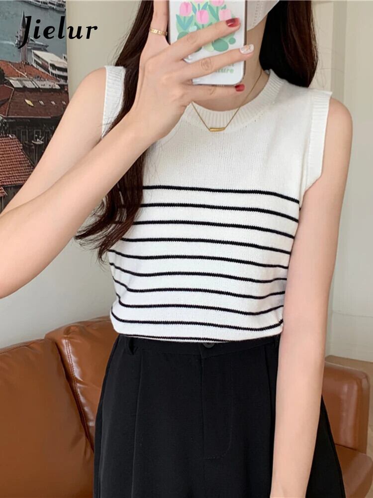 送料無料 Jielur 夏 2022 ニットタンクトップ黒白ストライプスキニーベスト基本トップス女性キャミソールニット女の子 ホワイト ブラック サマー 夏物 AE12188787898855426543