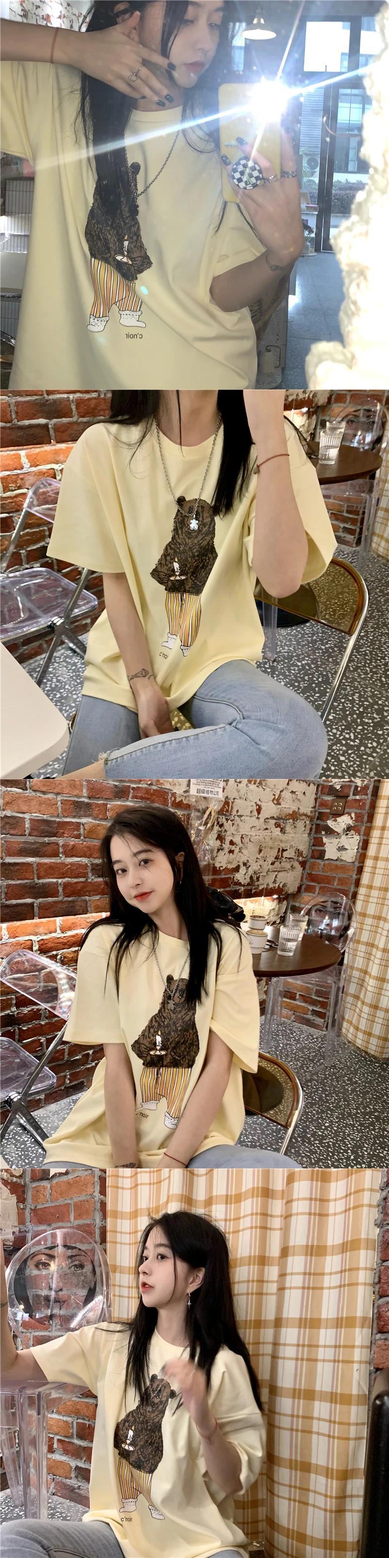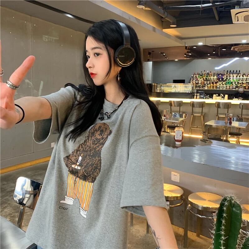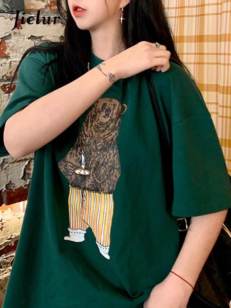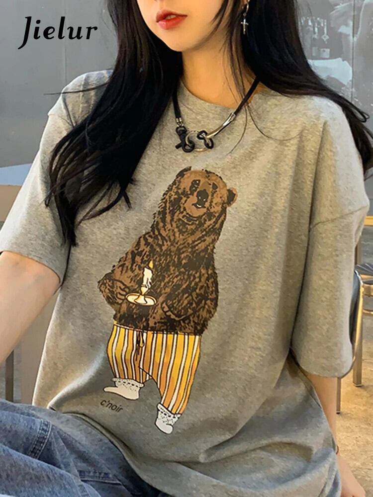 送料無料 Jielur かわいい漫画クマプリント Tシャツ女性 2022 夏半袖コットン Tシャツグリーングレー Tシャツトップ ショート ハーフスリーブ 大人ガーリー スウィート キュート カジュアル サマー 夏物 AE1218878789329086388
