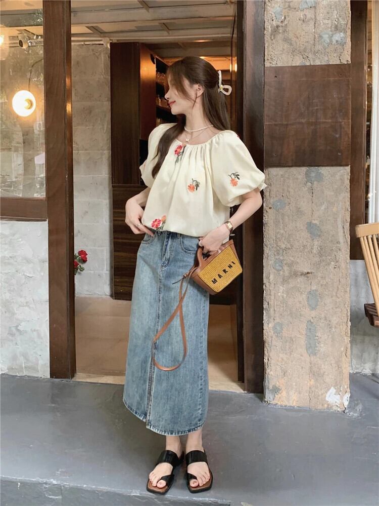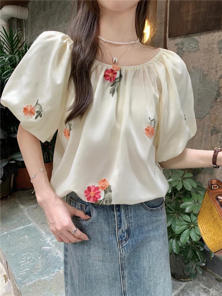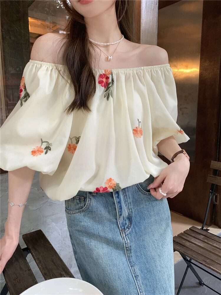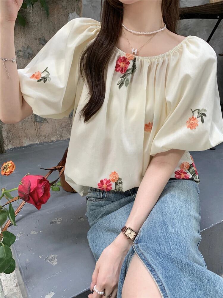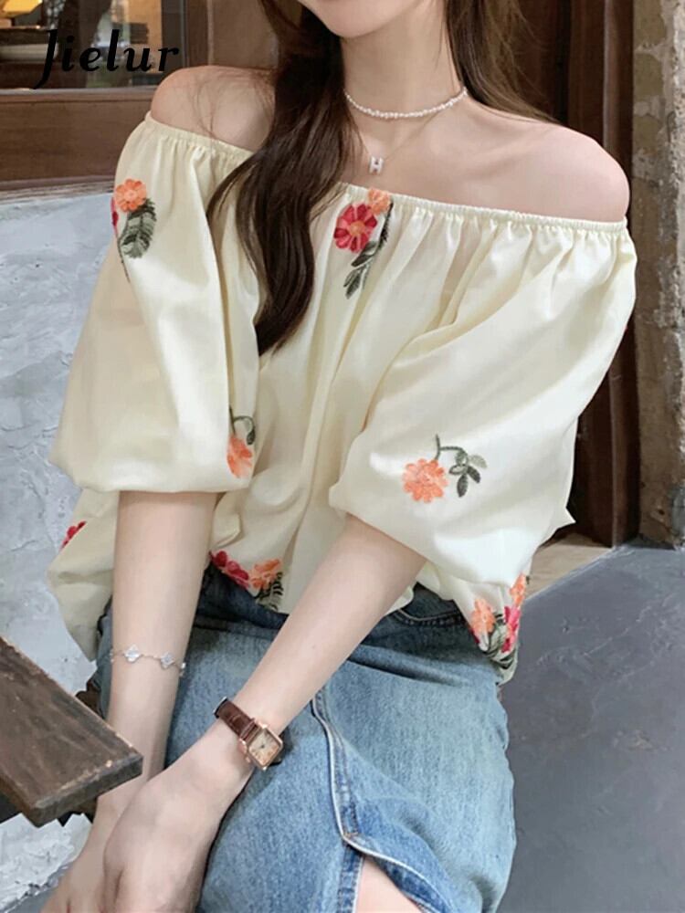 送料無料 Jielur 夏甘いスリム女性ブラウス刺繍ブラウス女性ルーズパフスリーブトップ 大人ガーリー スウィート キュート カジュアル サマー 夏物 AE12188787887936667716