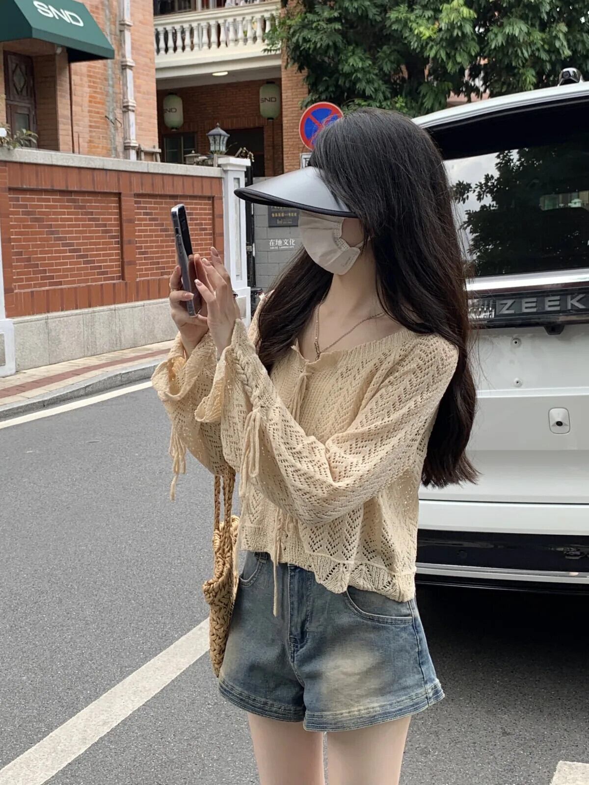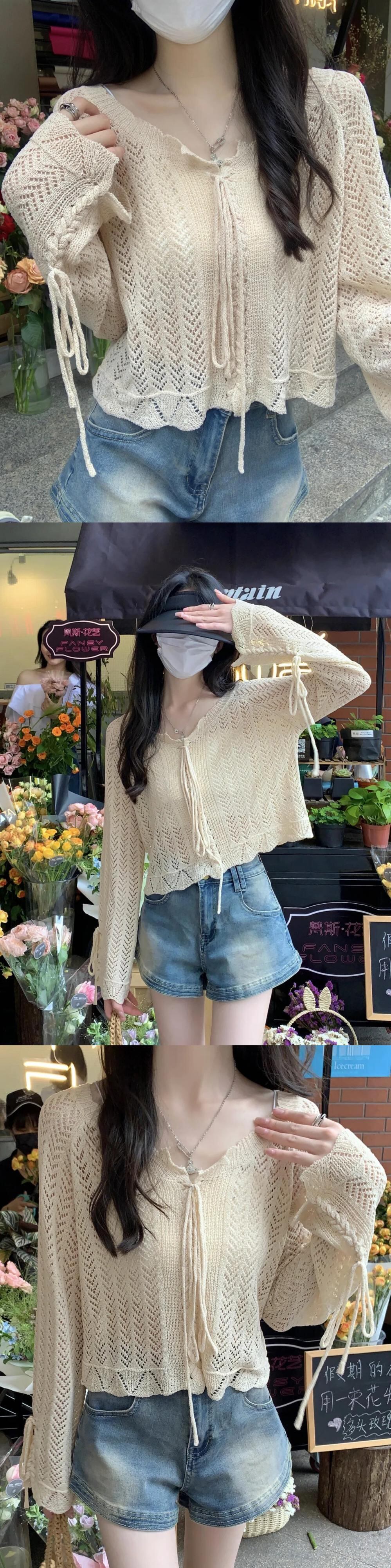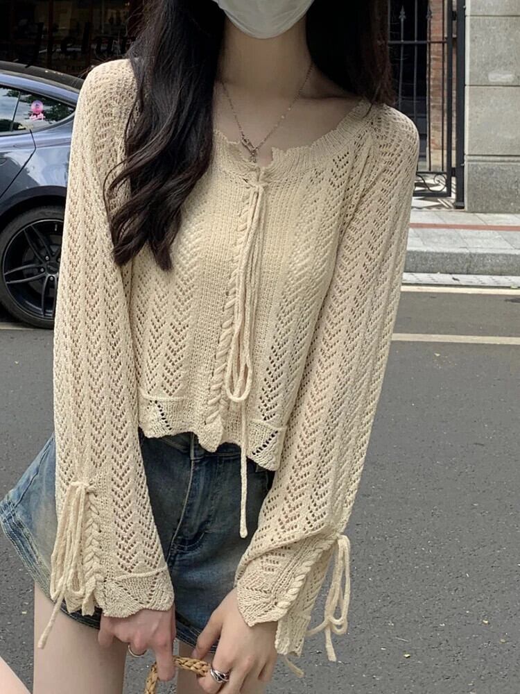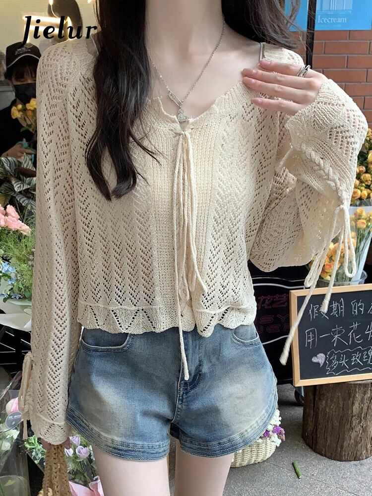 送料無料 Jielur 夏中空アウトセクシーな女性ブラウスニット長袖ブラウス女性アプリコットルーズスリムトップ ロング サマー 夏物 AE12188787827290234700