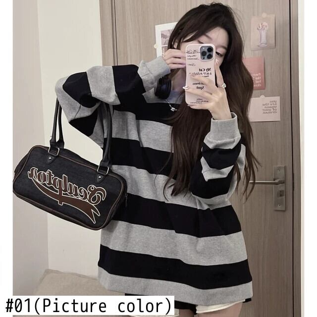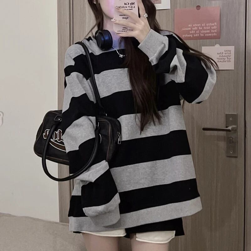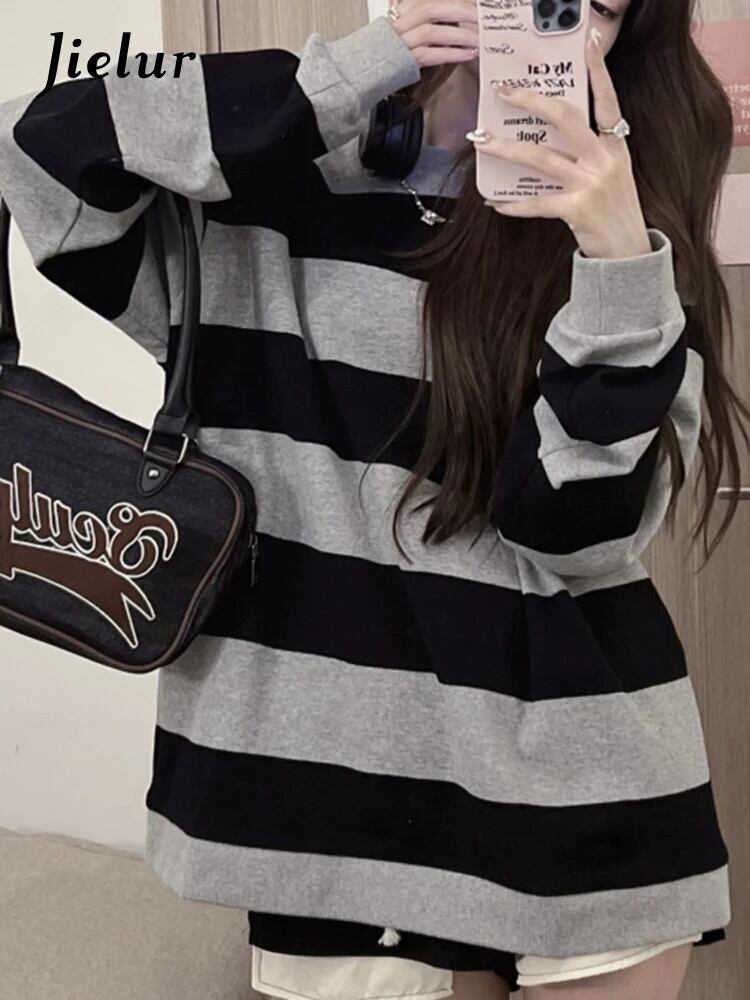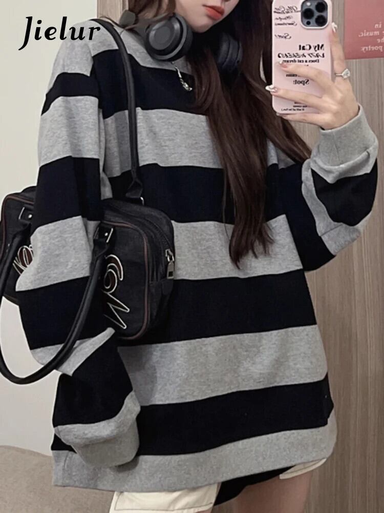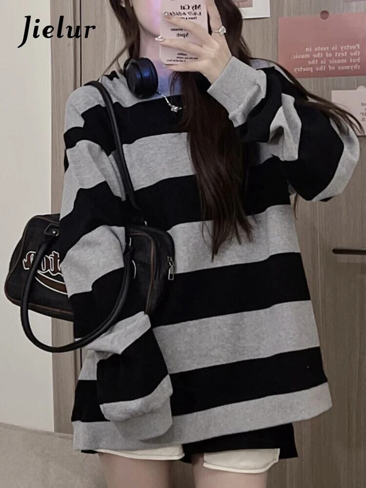 送料無料 Jielur コントラストカラーシックなストライプルーズパーカー Clic O ネックプルオーバーベーシックシンプルな長袖女性パーカー ロング Oネック AE12188787848904373162