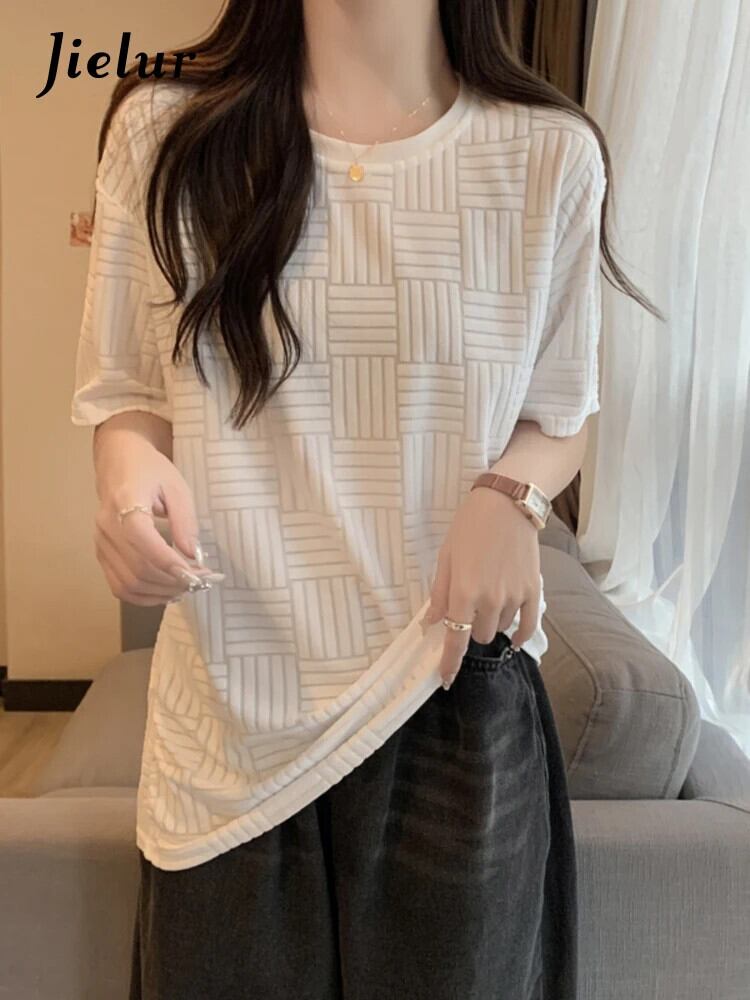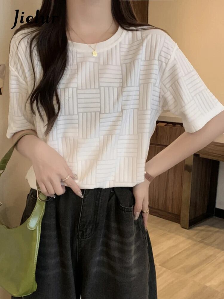 送料無料 Jielur ルーズ O ネックジャカード白 Tシャツ女性の夏のストリートスタイル半袖 Tシャツ原宿シックなトップ Tシャツ ショート ホワイト ハーフスリーブ かわいい サマー 夏物 Oネック AE12188787846184614920