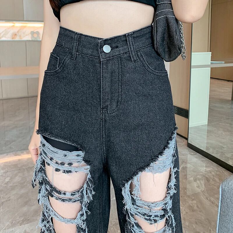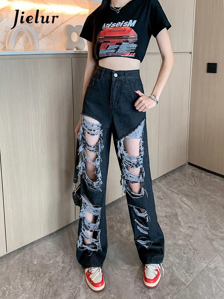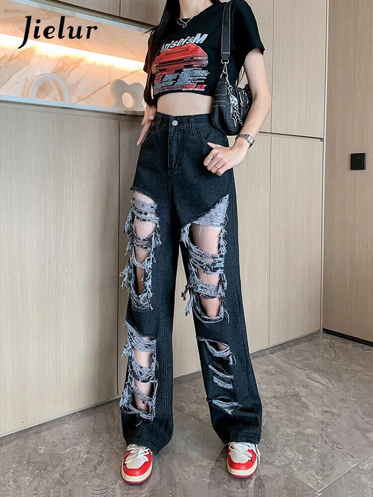 送料無料 Jielur ストリートリッピングジーンズ女性の夏のウエストストレートルーズデニムパンツ Y2k ヴィンテージポケット黒ジーンズ ブラック サマー 夏物 ビンテージ AE12188787818881637551