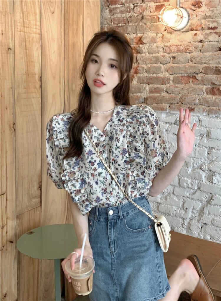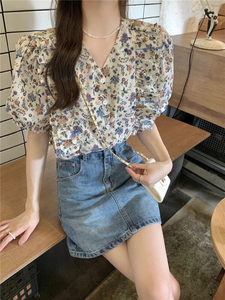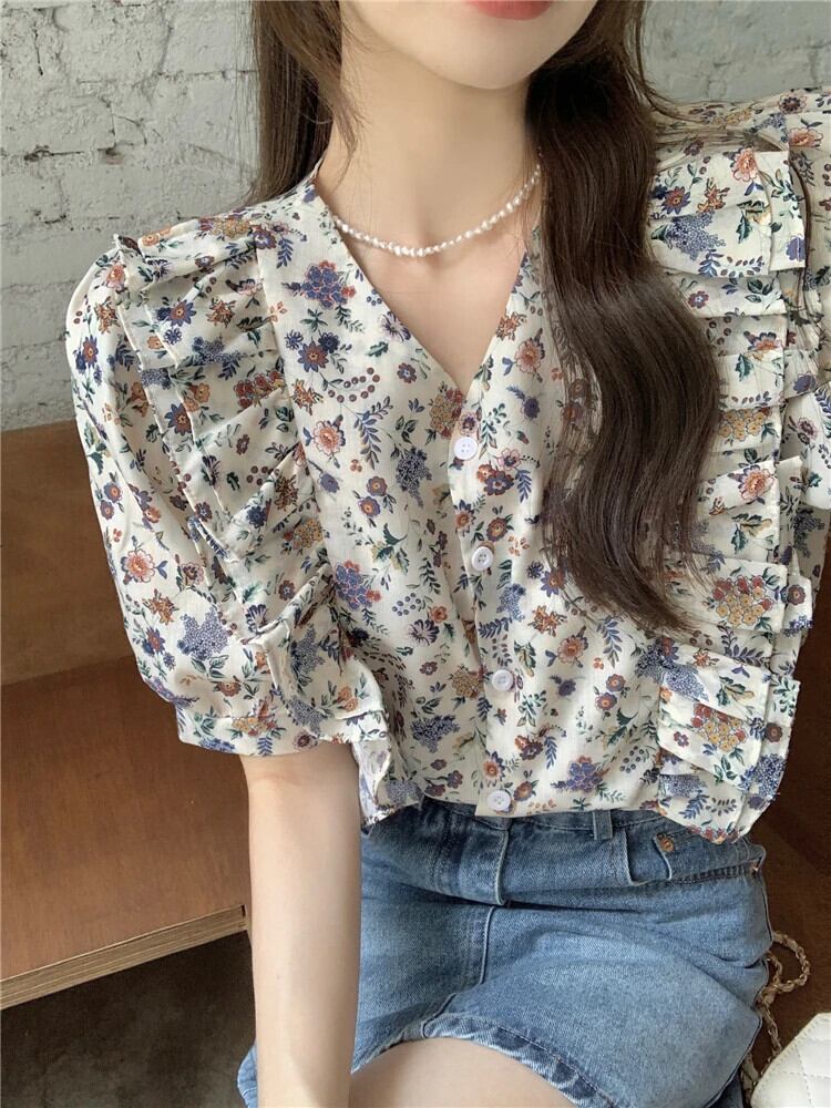 送料無料 Jielur 夏フレンチヴィンテージ甘い女性ブラウススリムシックな花柄ブラウス女性 V ネックトップ 大人ガーリー スウィート キュート カジュアル サマー 夏物 Vネック ビンテージ AE12188787837564479785