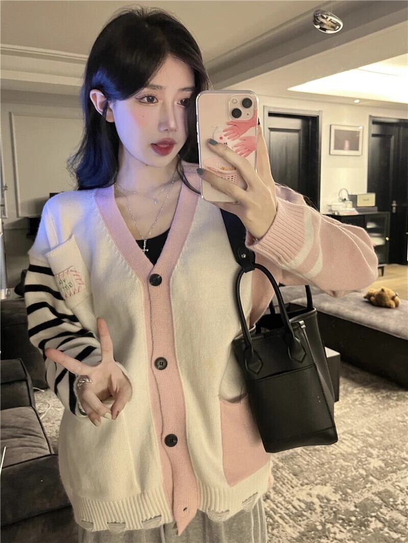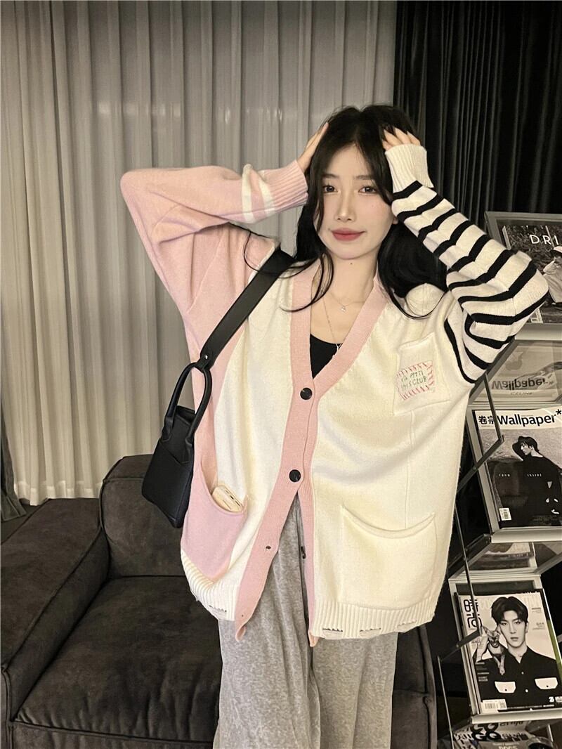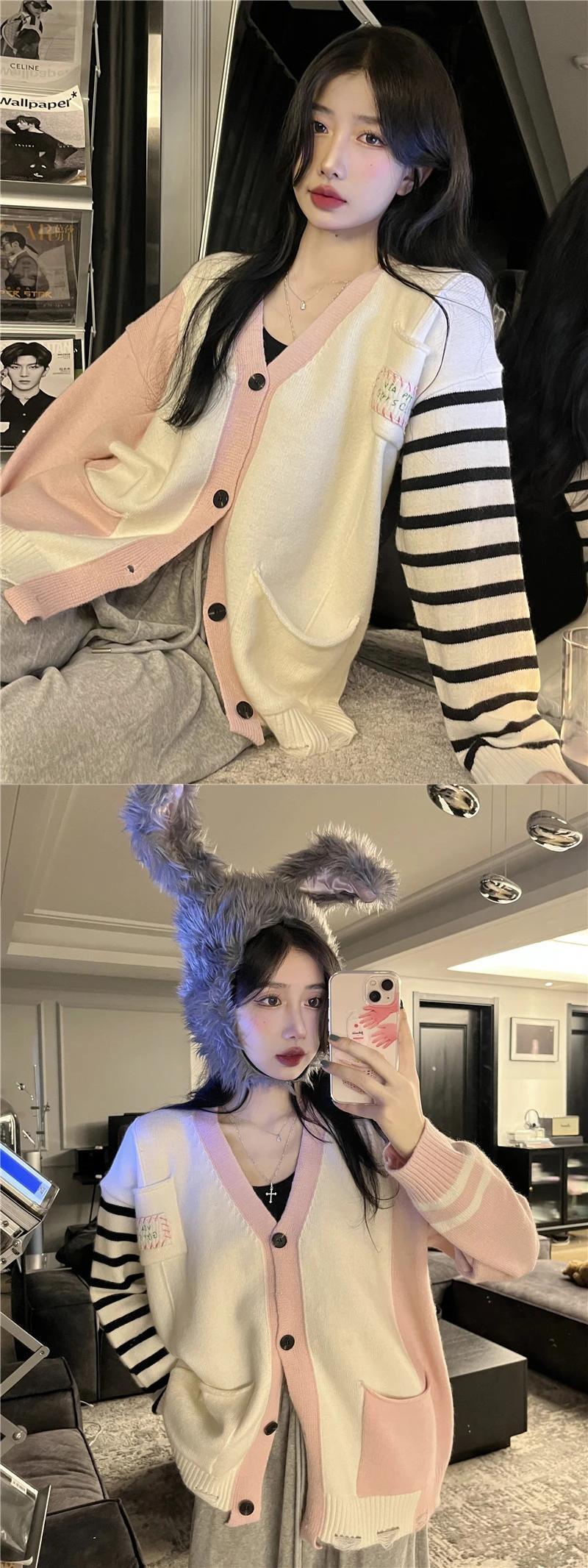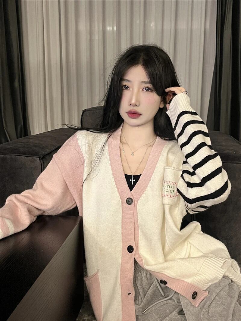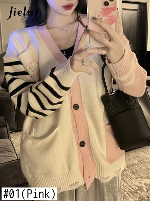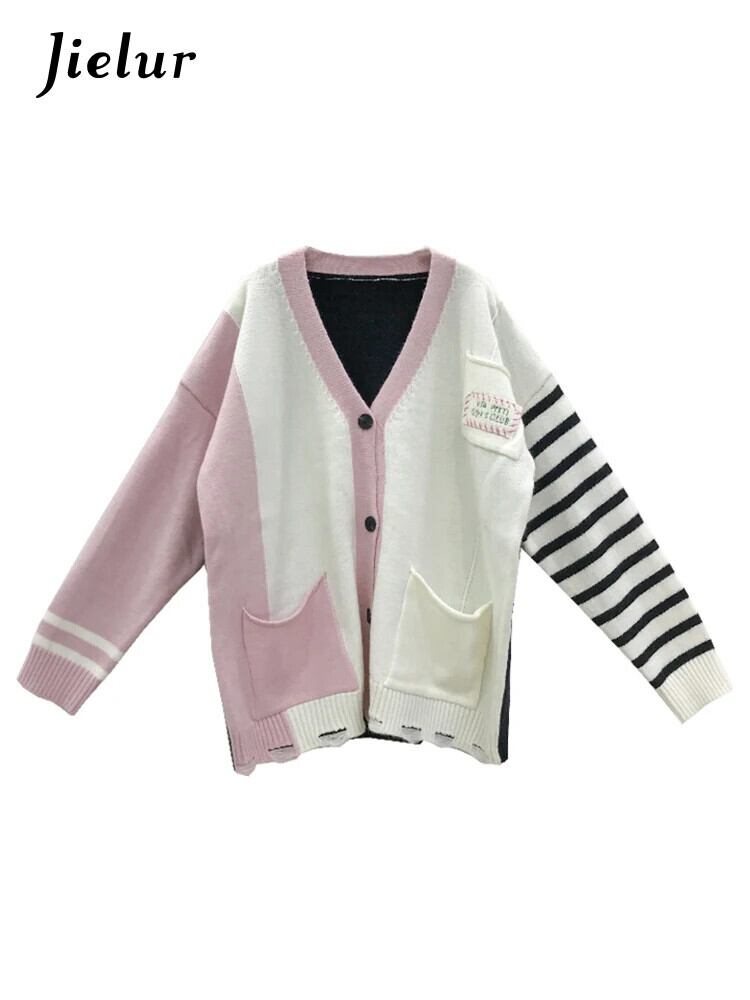 送料無料 Jielur ユニークなニット優しいストライプスプライシングセーター女性秋ルーズシングルブレストニットカーディガン オータム 秋物 AE1218878789252319476
