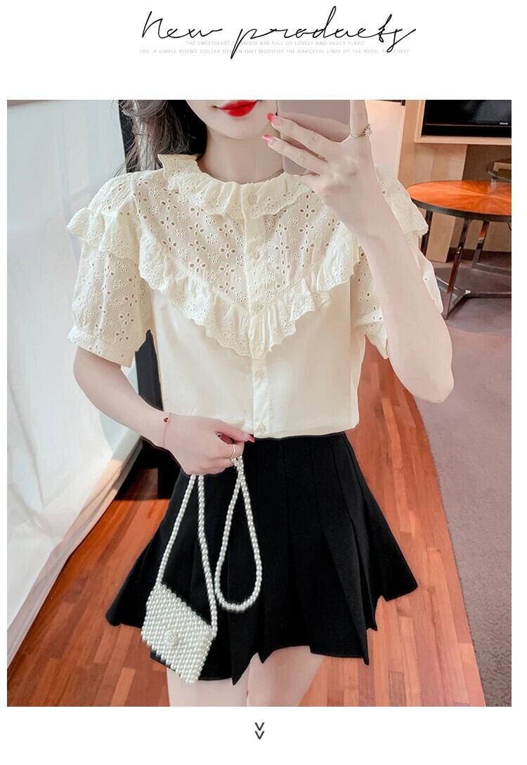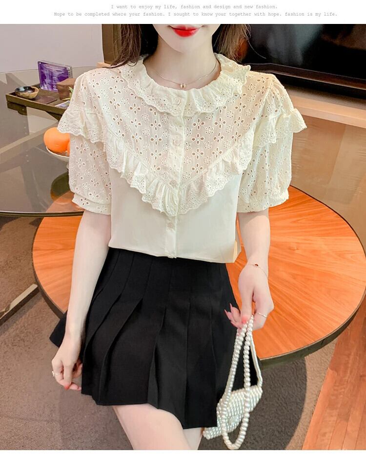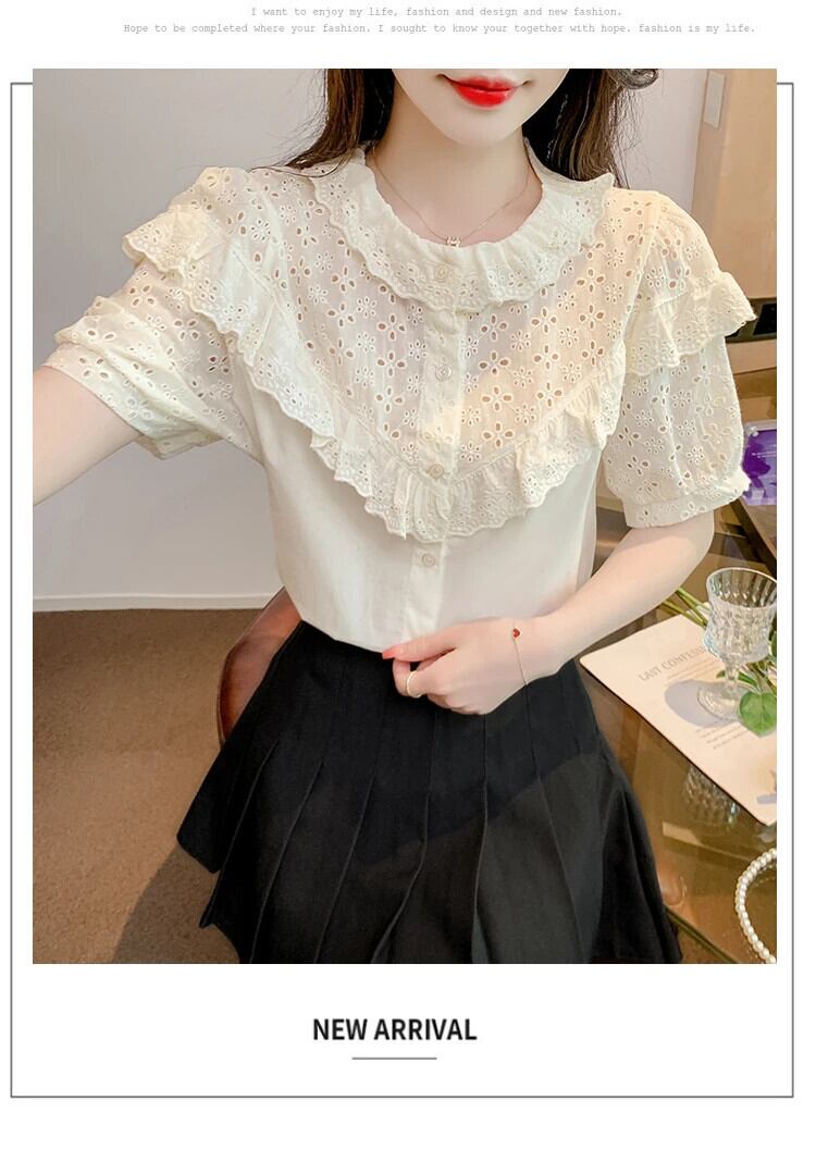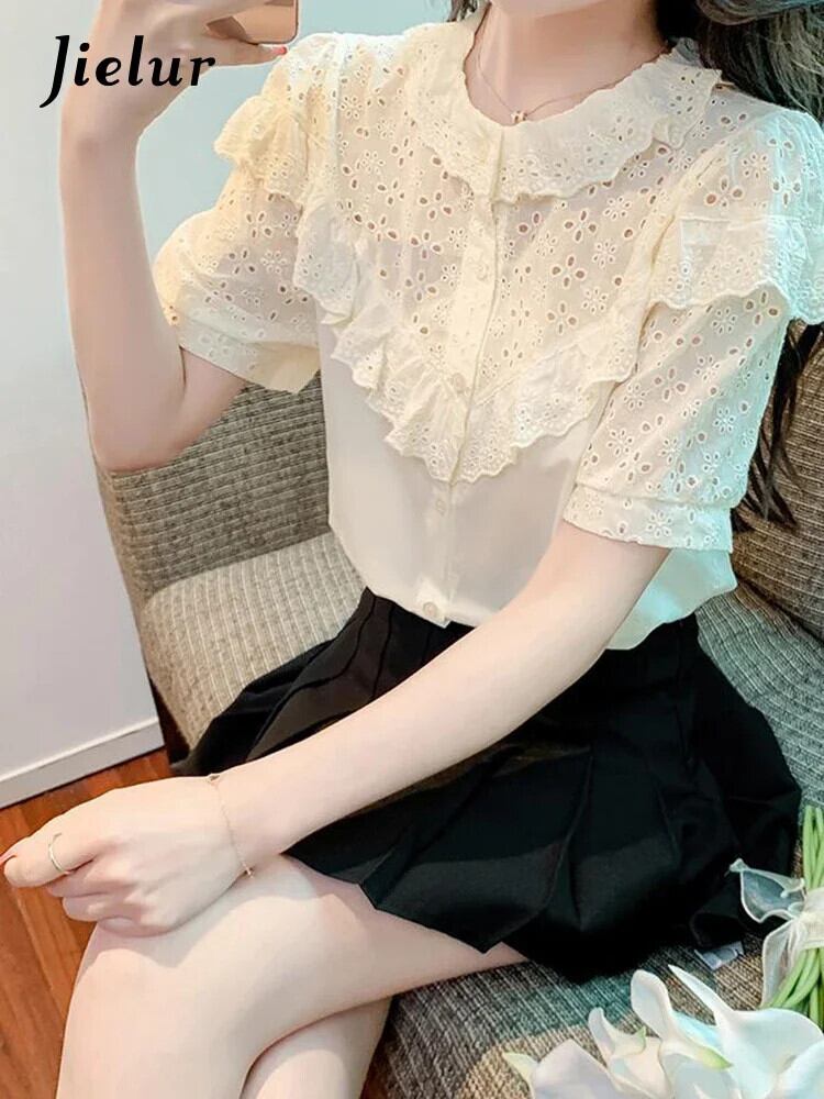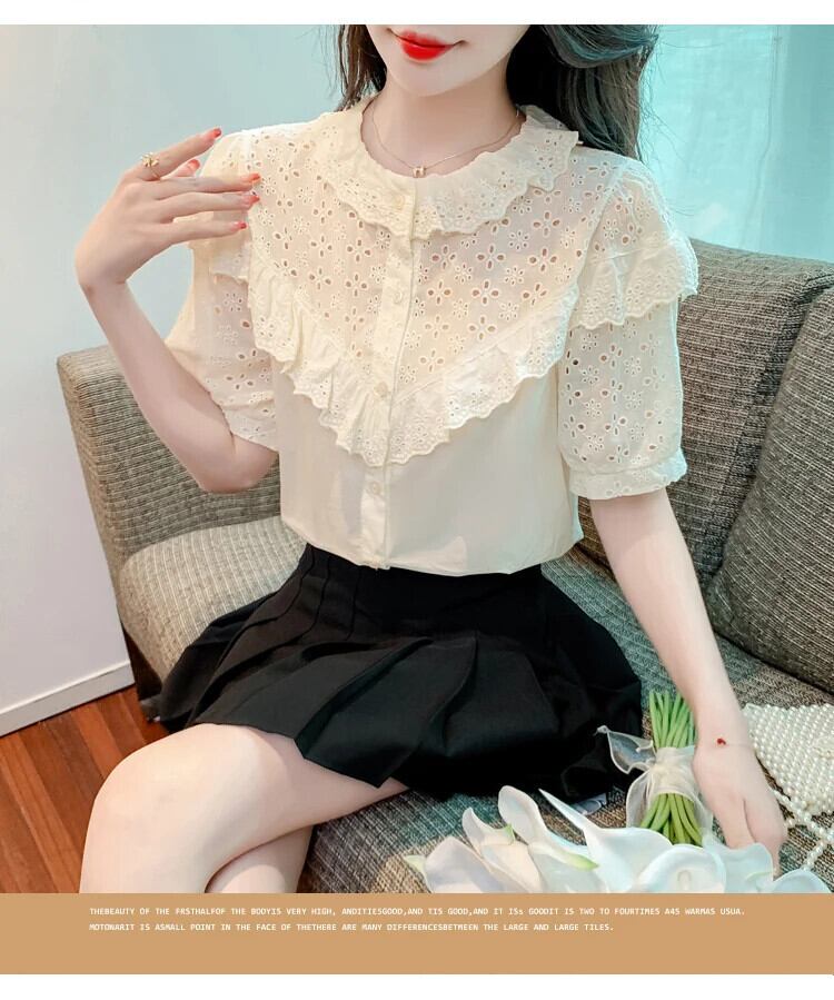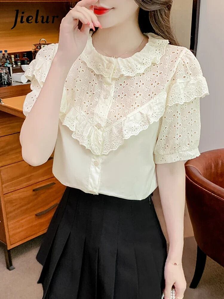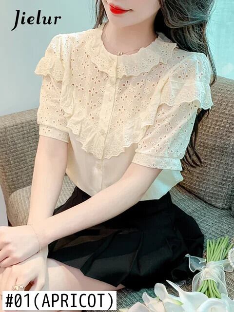 送料無料 Jielur 夏フレンチ中空アウト女性シャツシックな甘いスリムシャツアプリコットルーズパフスリーブトップ女性 大人ガーリー スウィート キュート カジュアル サマー 夏物 AE1218878786975058014