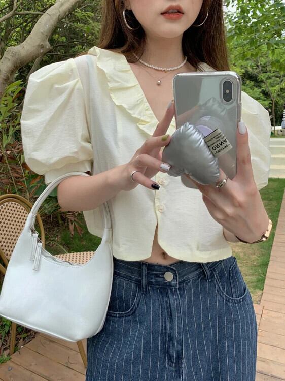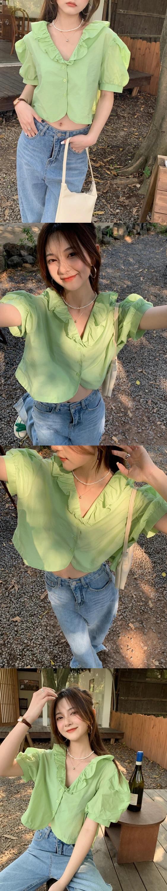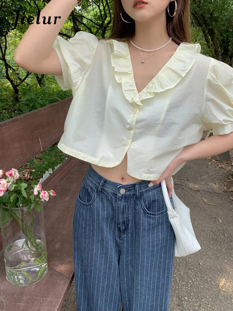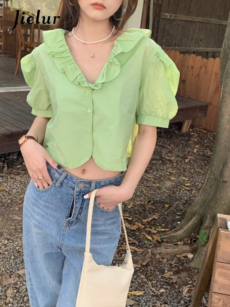 送料無料 Jielur フレンチレースパフスリーブシャツ V ネックスウィートガールズクロップトップライトイエローグリーンブラウス夏の女性のシャツ 大人ガーリー キュート カジュアル サマー 夏物 Vネック AE12188787837416639494