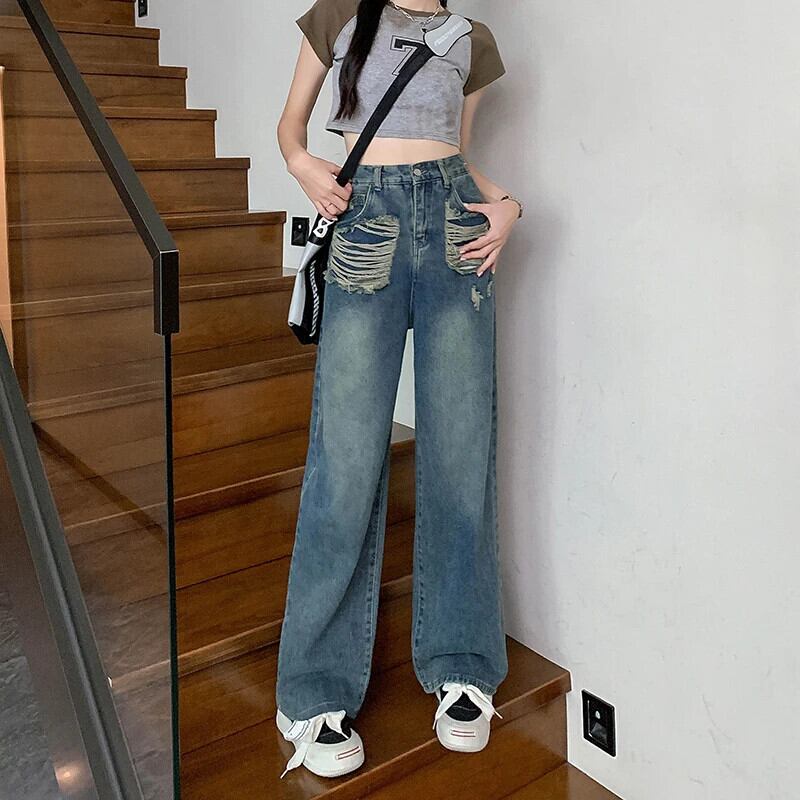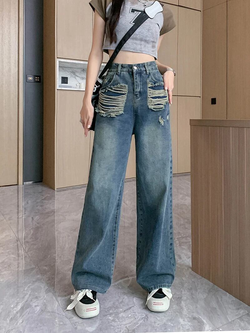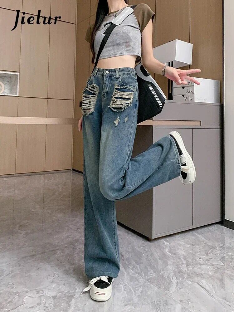 送料無料 Jielur レトロウエストワイドレッグジーンズ女性ストレートルーズデニムパンツ夏ブルーリッピングジーンズ Y2k バギージーンズ サマー 夏物 ワイドパンツ AE12188787875905978208