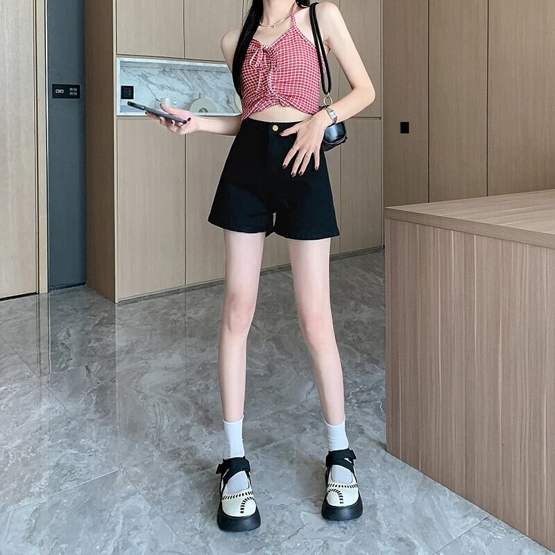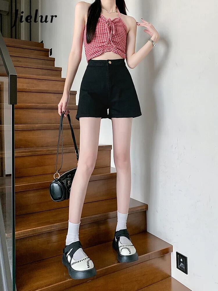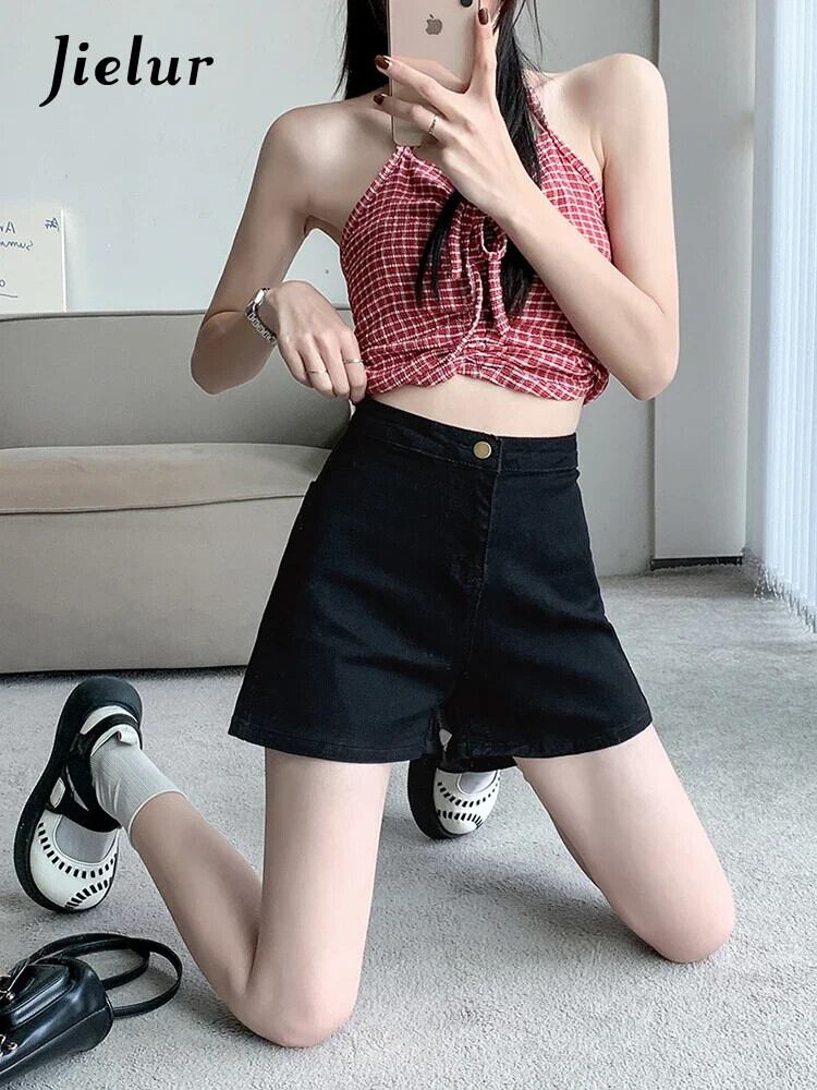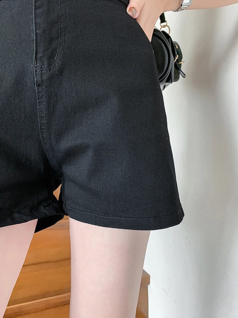 送料無料 Jielur 夏黒スリムデニムショートパンツスリムウエストソリッドカラーの女性のショートパンツシンプルなベーシックショーツ ブラック サマー 夏物 ブルマー AE12188787824896310993
