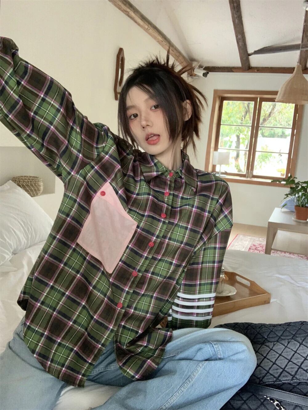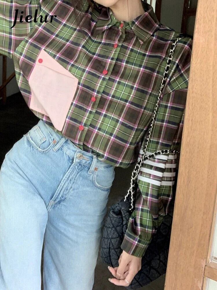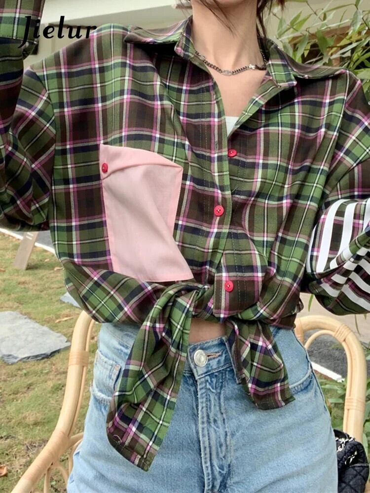 送料無料 Jielur 夏コントラストカラーチェック柄ルーズ女性シャツ若いシャツ女性グリーンシックな長袖トップ ロング サマー 夏物 AE12188787842054896242