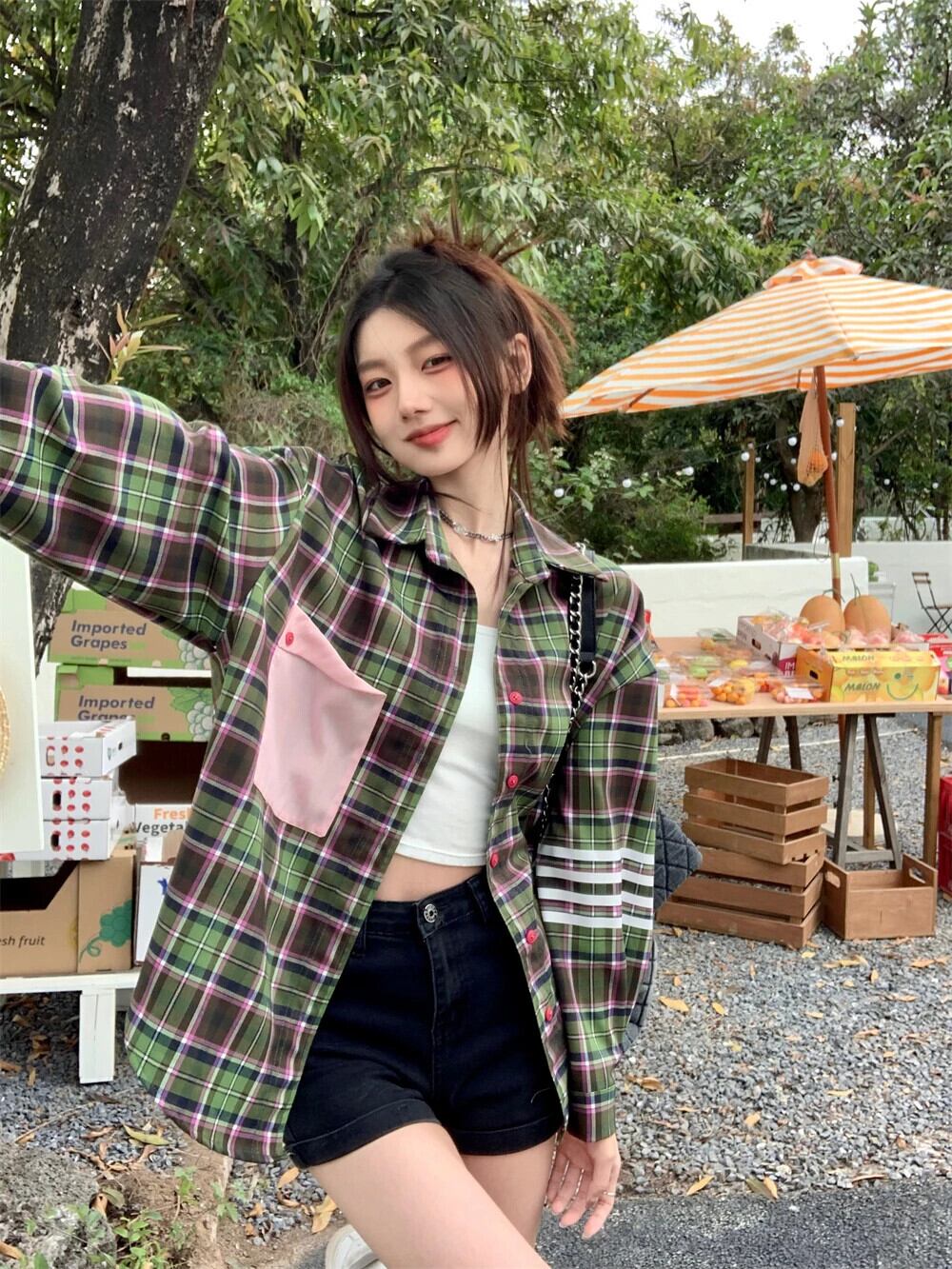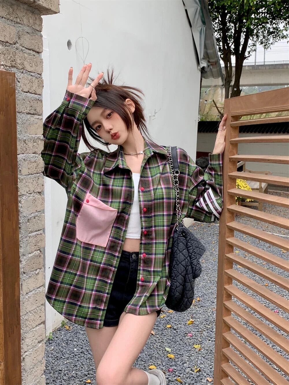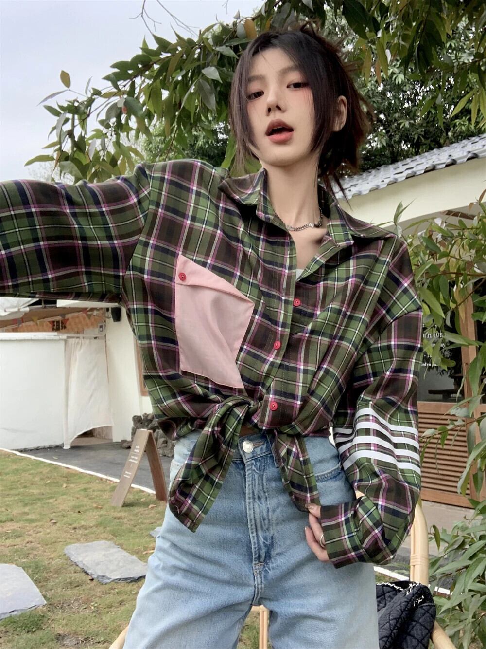 送料無料 Jielur 夏コントラストカラーチェック柄ルーズ女性シャツ若いシャツ女性グリーンシックな長袖トップ ロング サマー 夏物 AE12188787842054896242