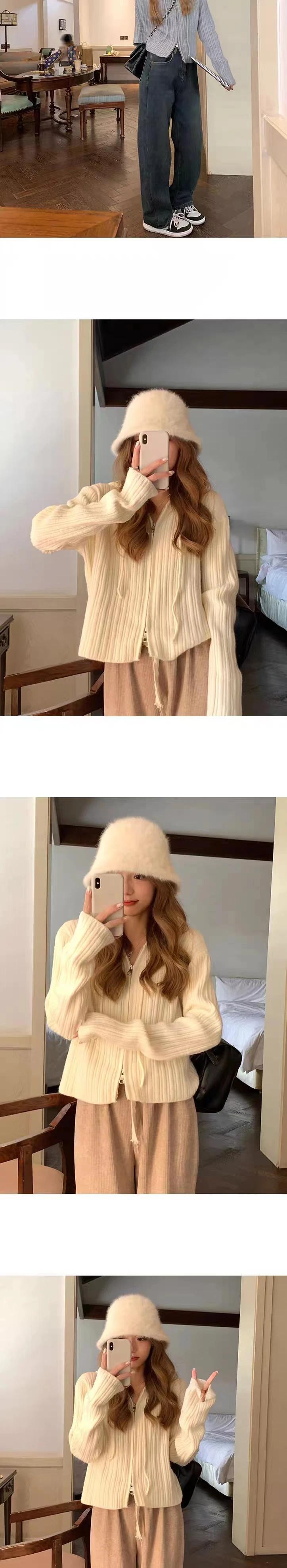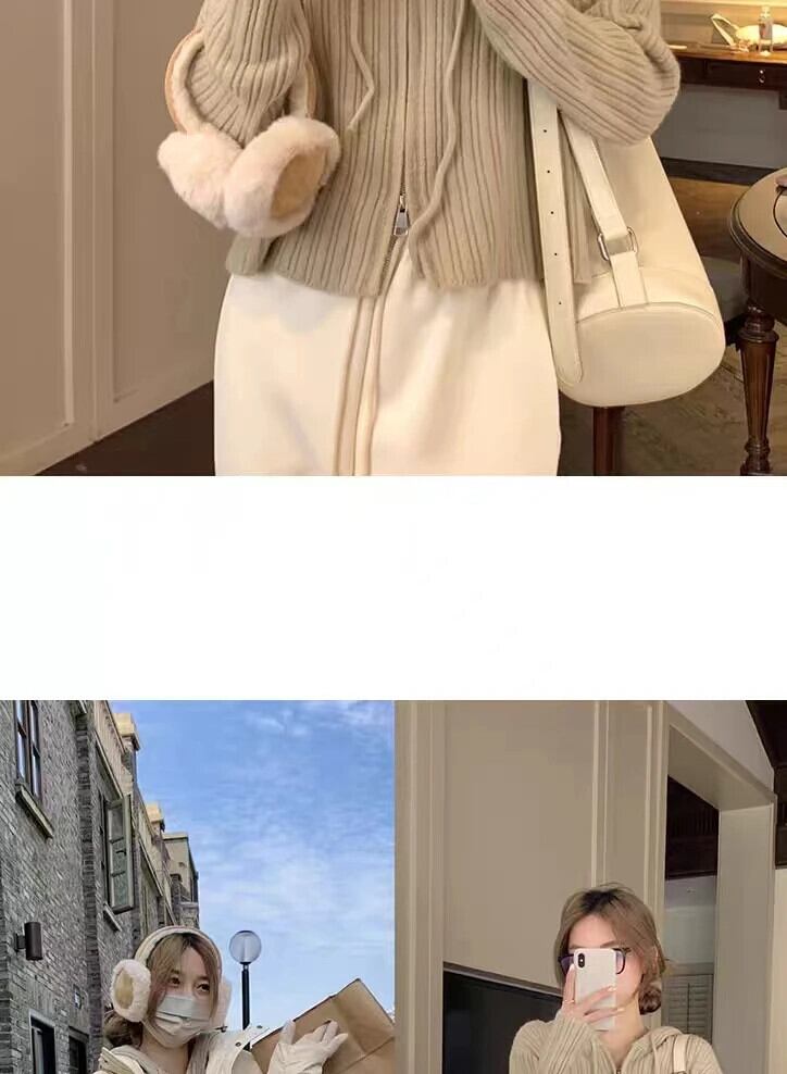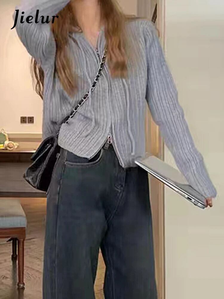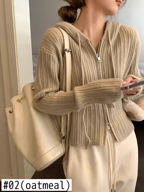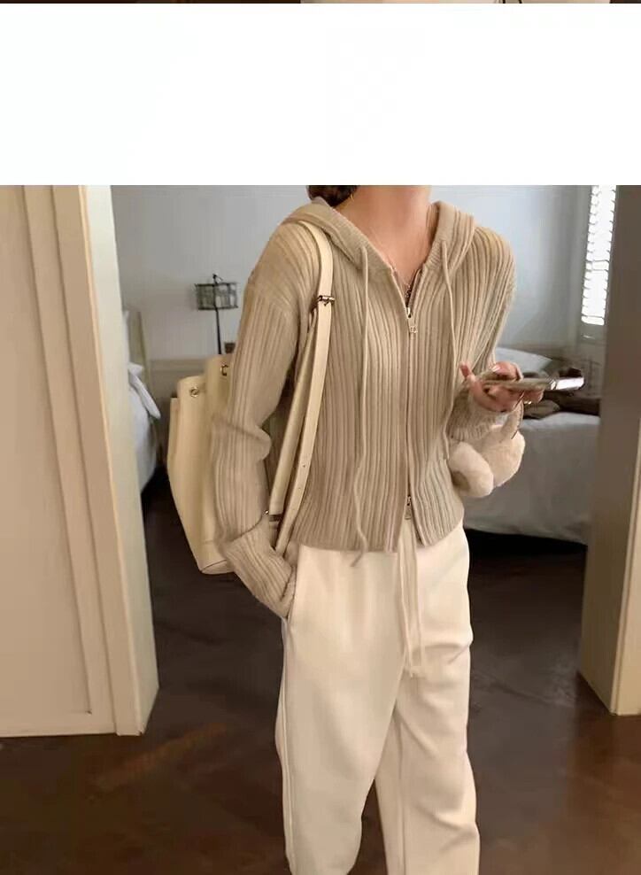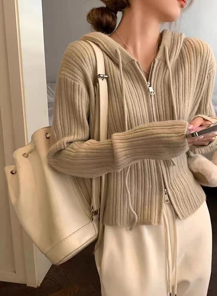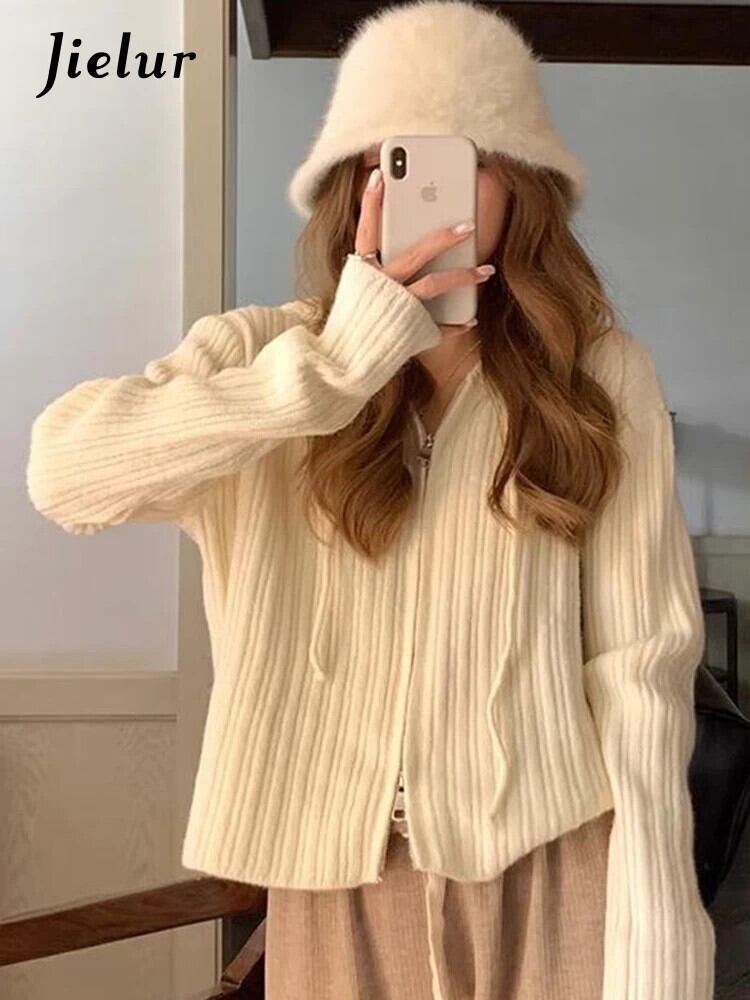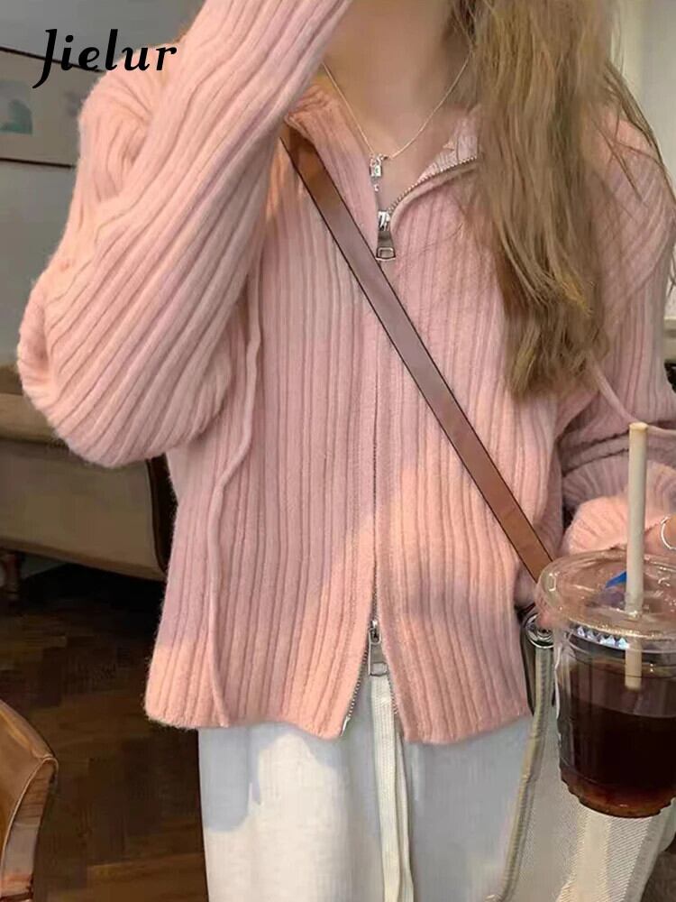 送料無料 Jielur フード付きシックなダブルジッパールーズカーディガンピュアカラー巾着ソフトストライプニットセーター女性カーディガン AE12188787826543528255