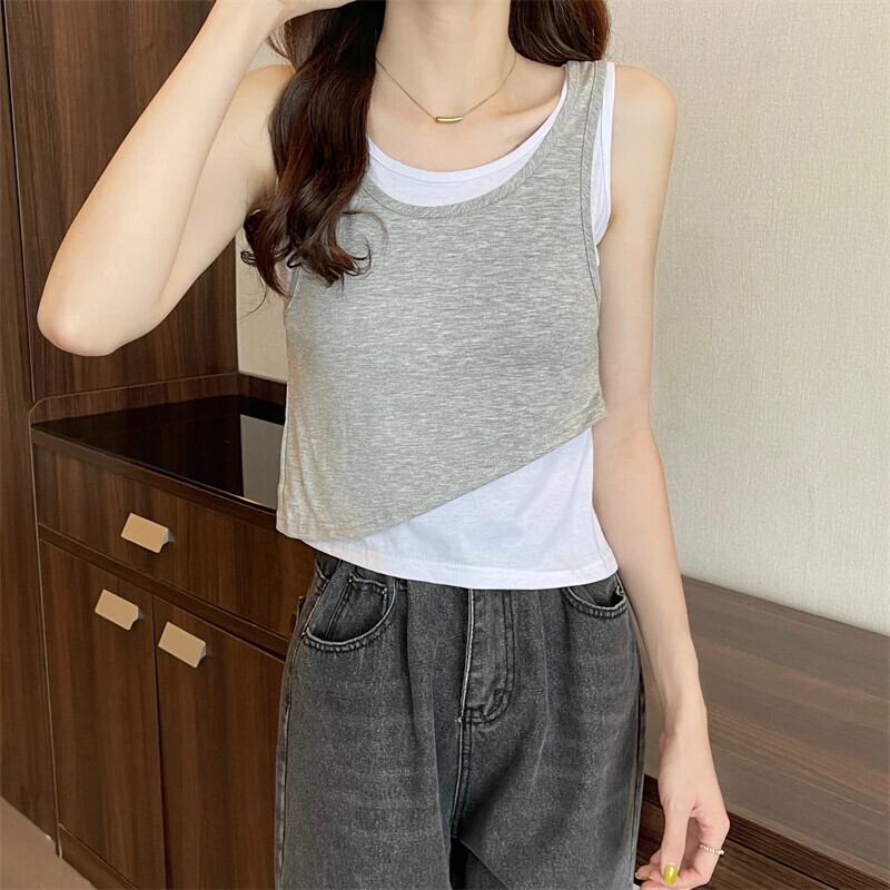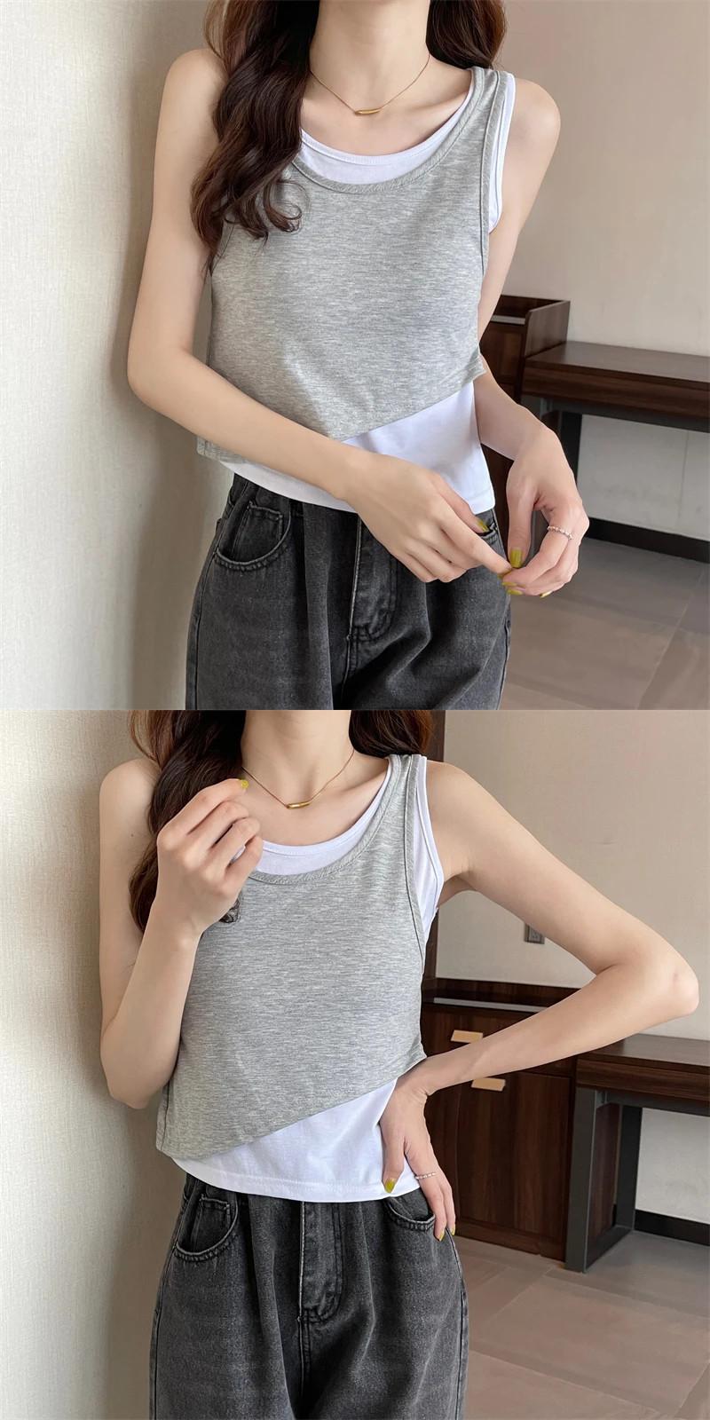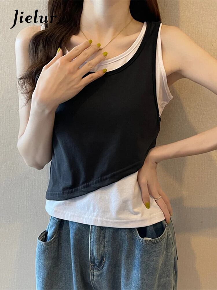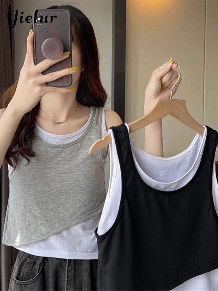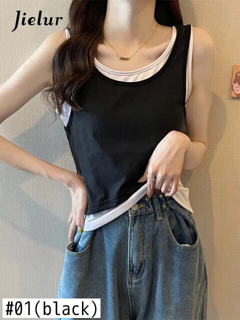送料無料 Jielur 夏 2022 スペルカラータンクトップ女性黒グレースキニーキャミソール基本キャミソール偽 2 枚 M-XL ブラック サマー 夏物 AE12188787897509351792
