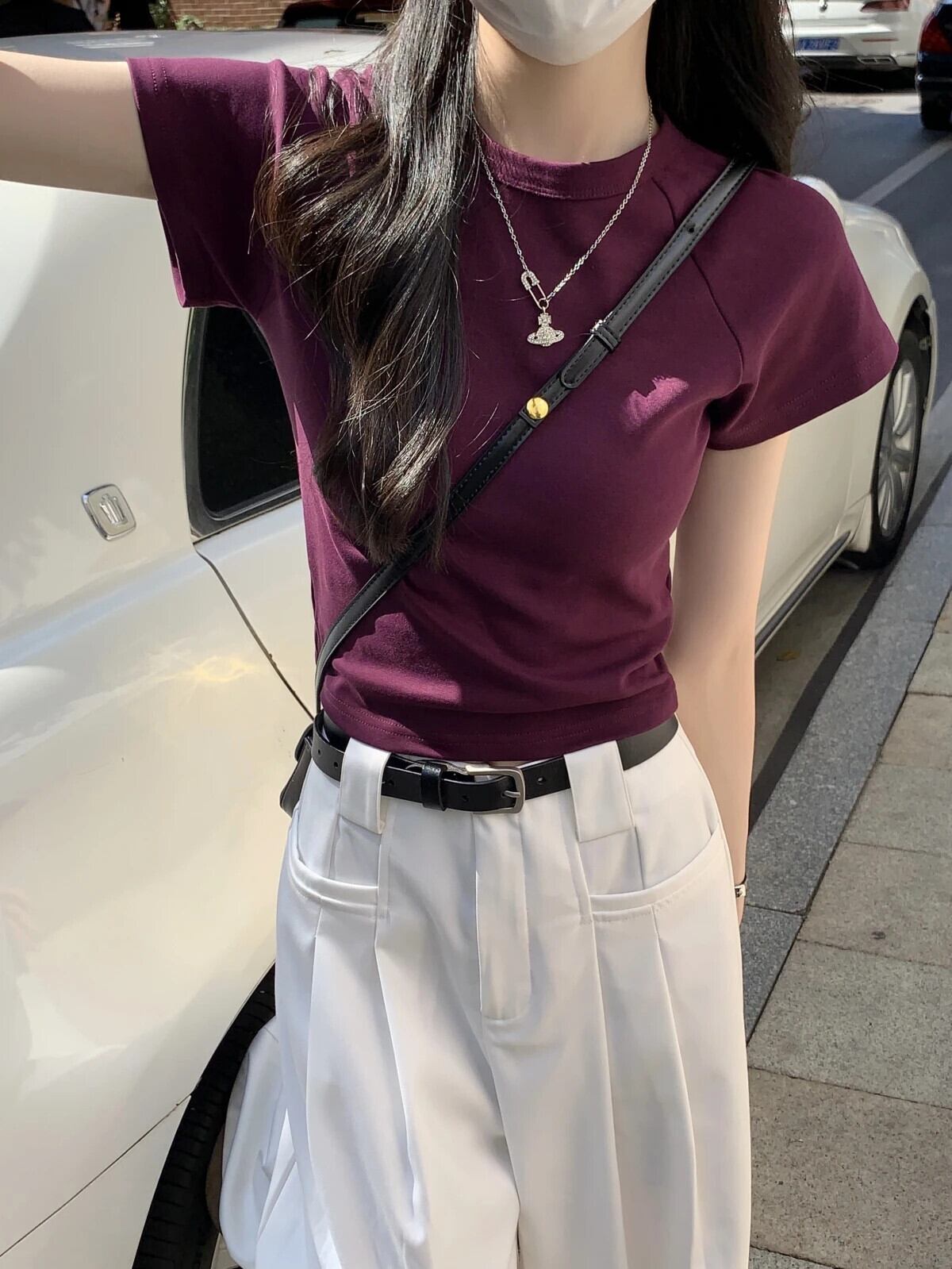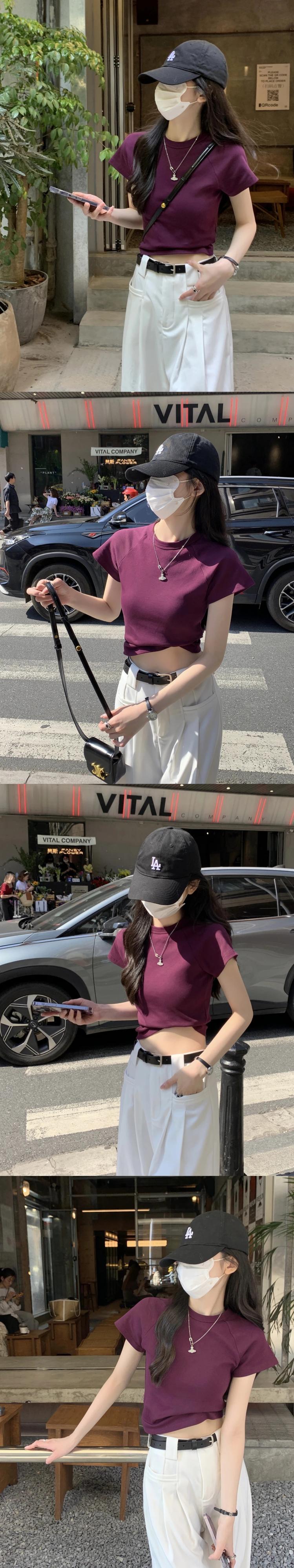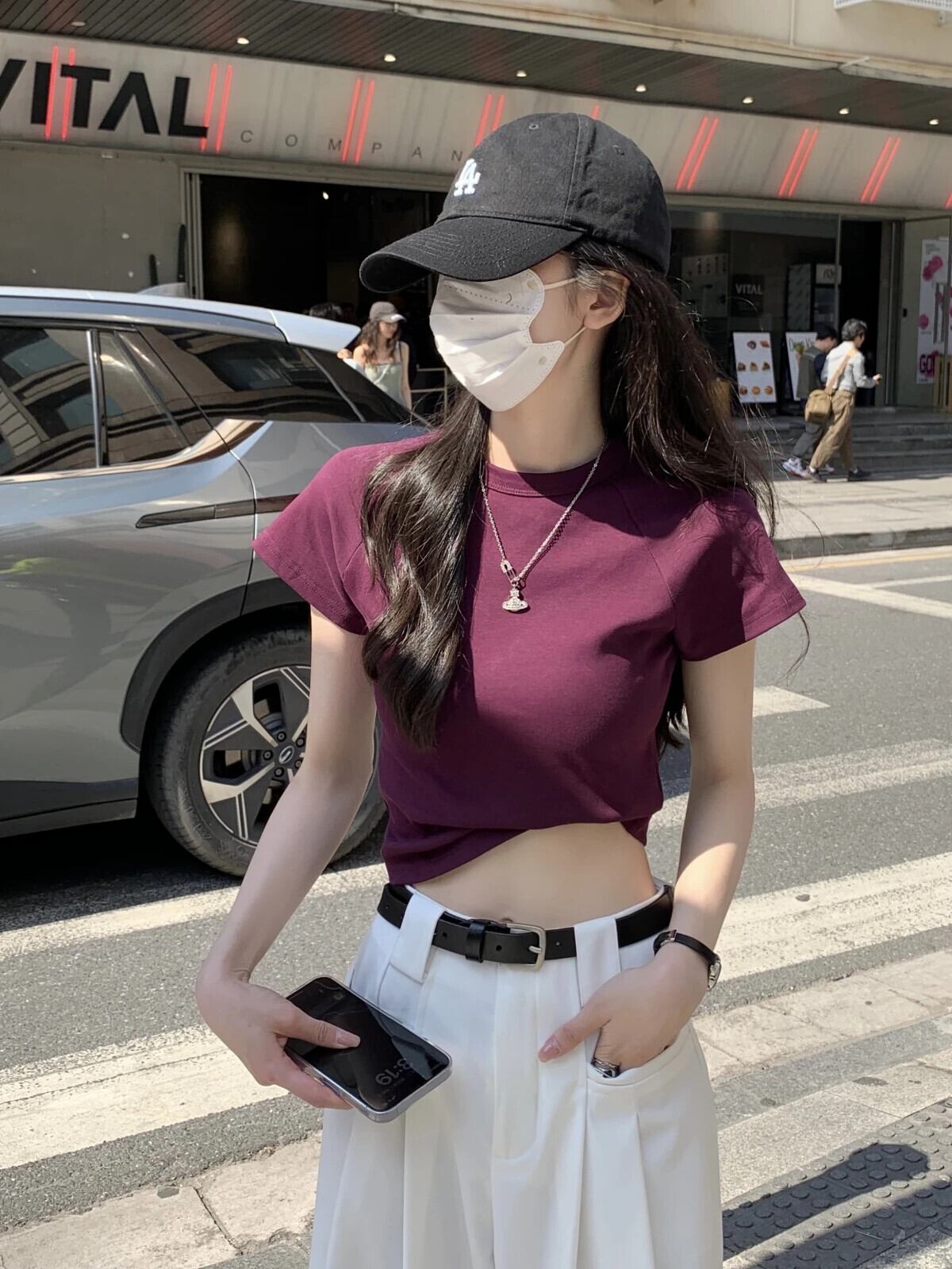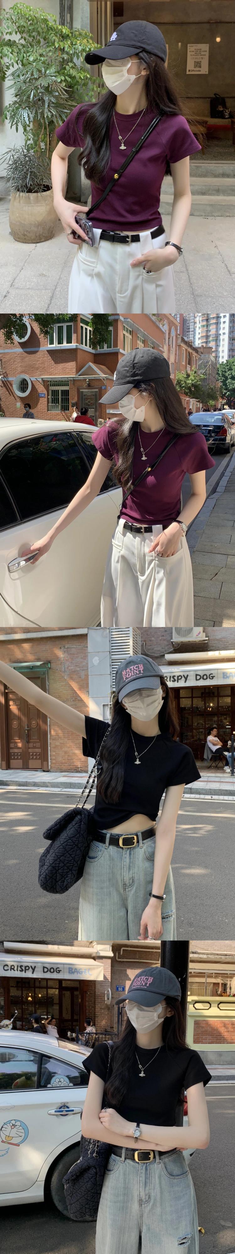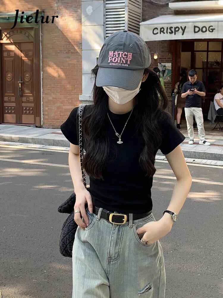 送料無料 Jielur 夏無地スリム女性の Tシャツスリムルーズ Tシャツ女性黒紫シックなトップ ブラック サマー 夏物 ソリッドカラー パープル AE12188787850366374672
