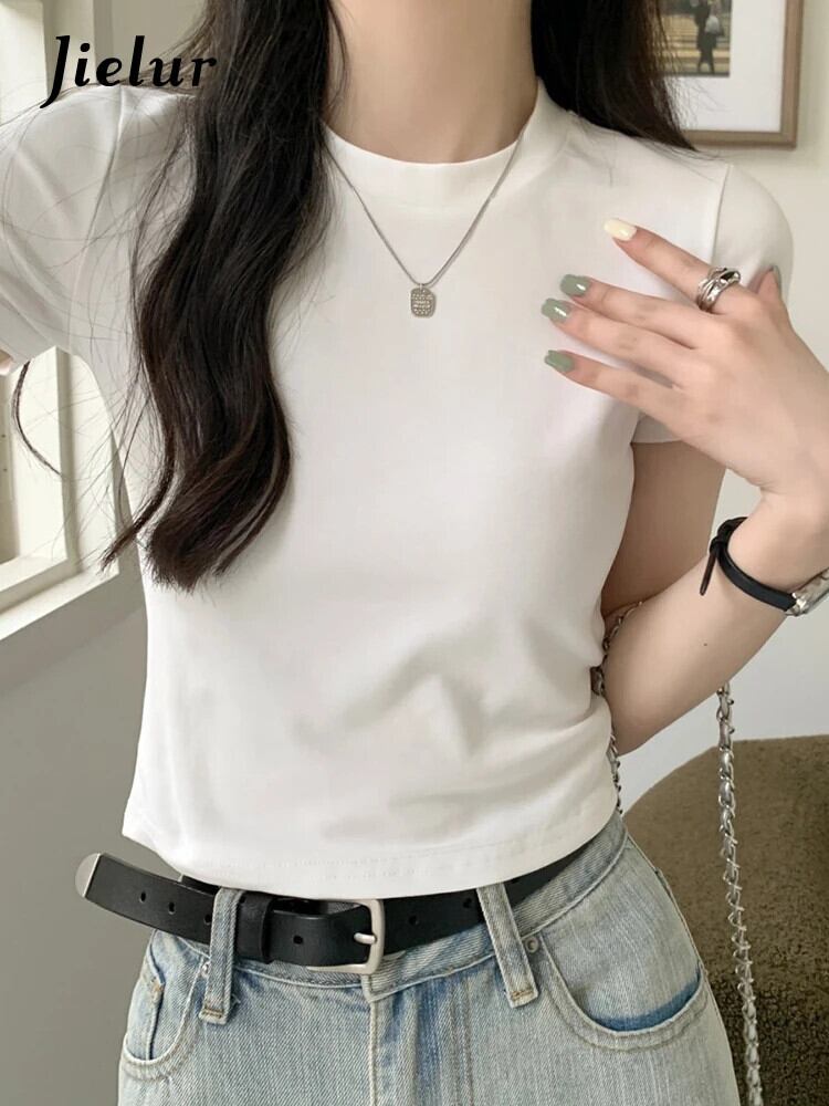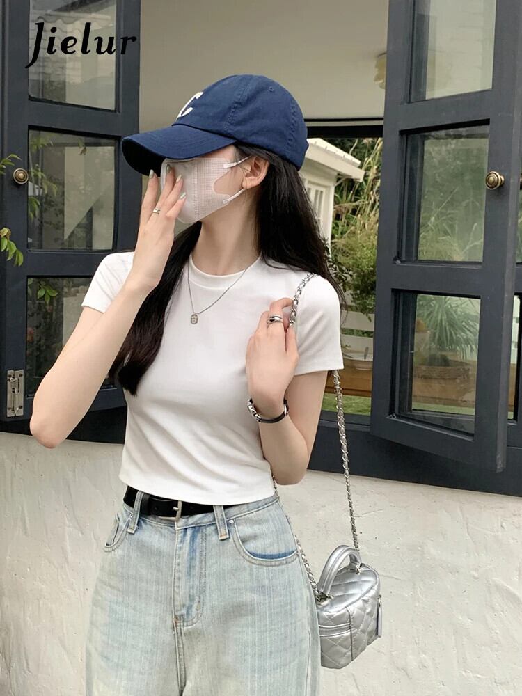 送料無料 Jielur 夏スリム O ネック無地女性の Tシャツ綿 Tシャツ女性黒、白、赤基本シンプルな Tシャツ ホワイト レッド ブラック コットン サマー 夏物 Oネック ソリッドカラー AE12188787837346913451