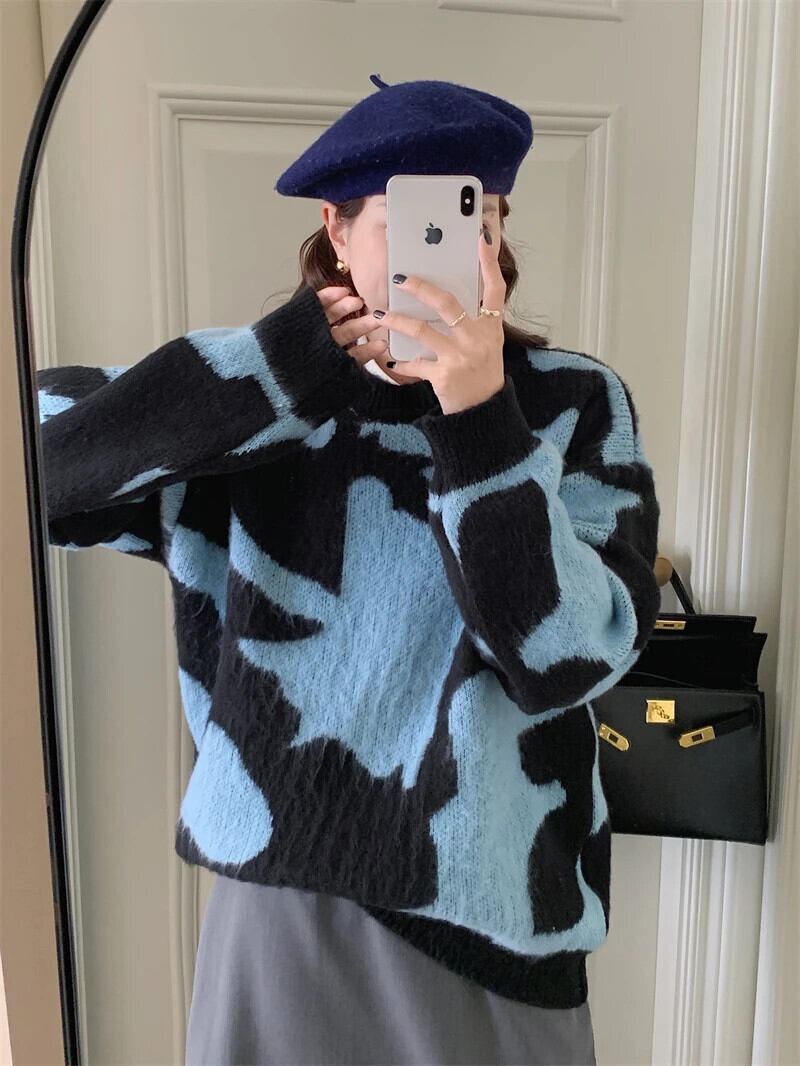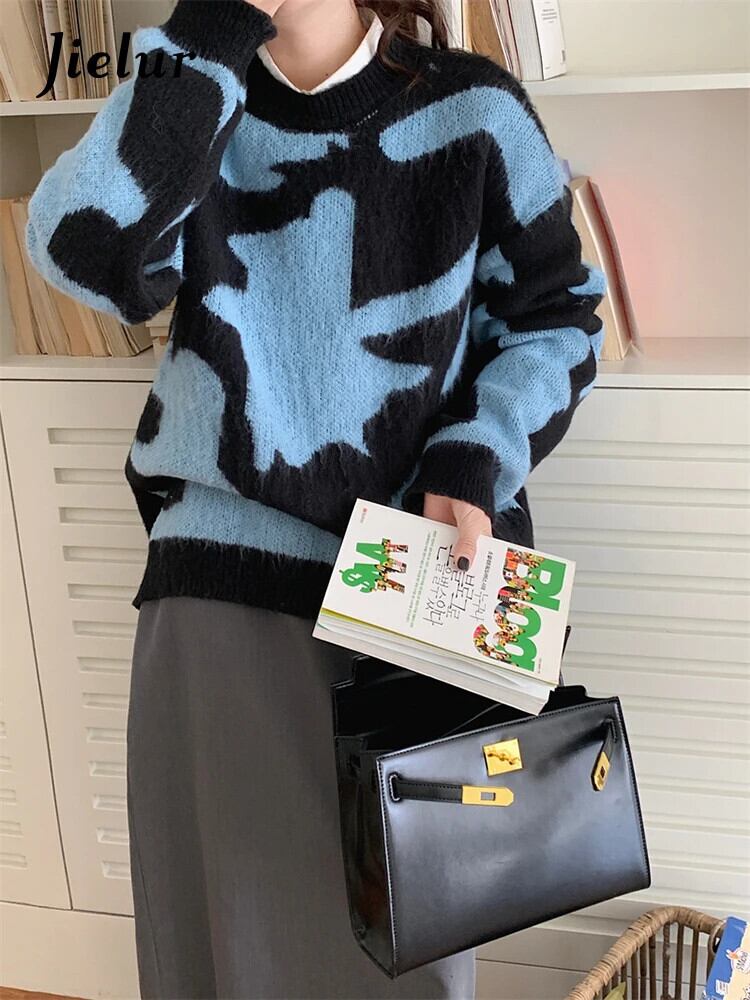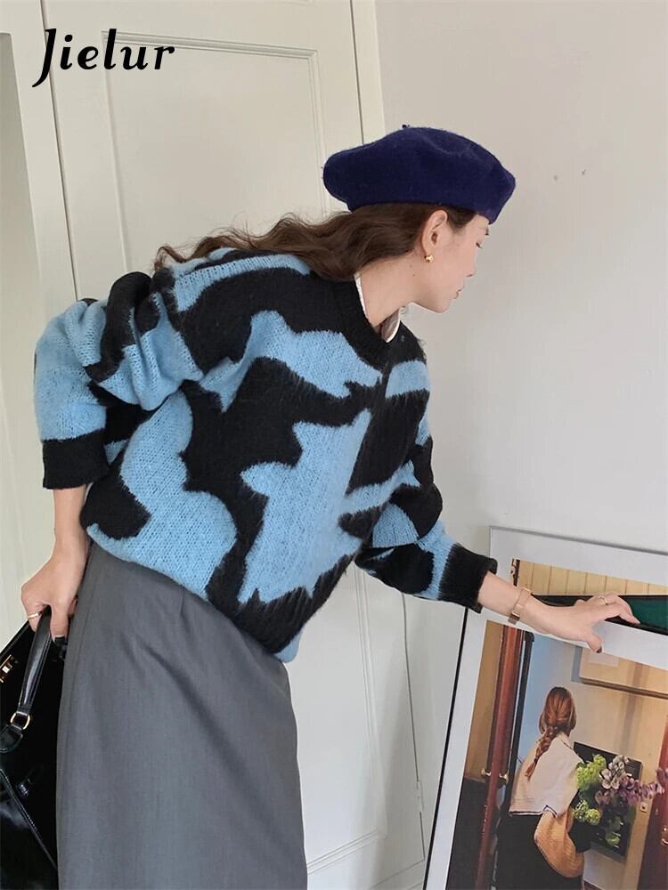 送料無料 Jielur 女性セーターガール冬 O ネックブラックブループリントニットプルオーバールーズカシミヤセータートップス ウィンター 冬物 Oネック AE12188787879793965740