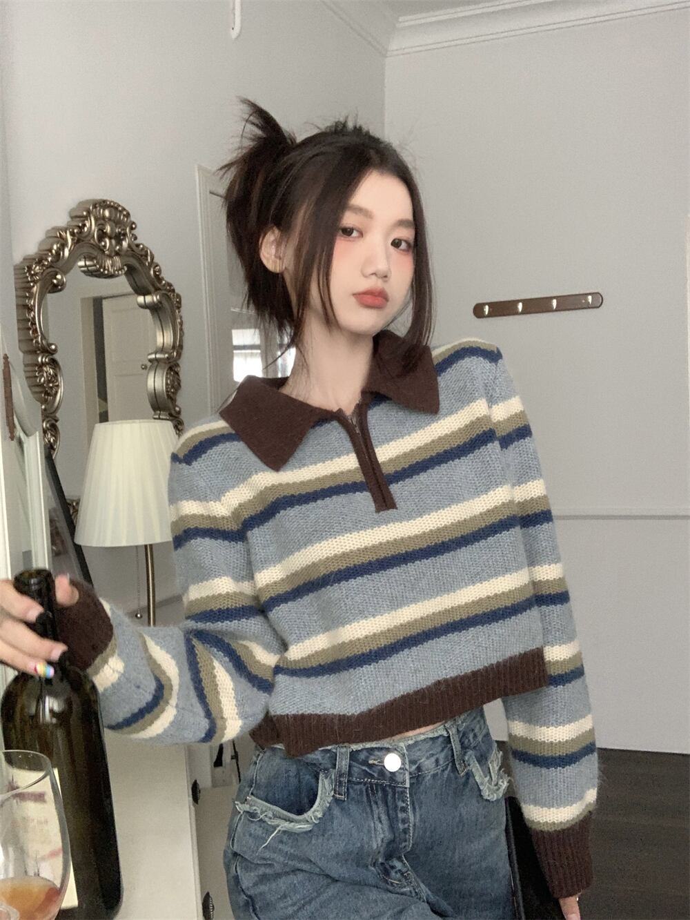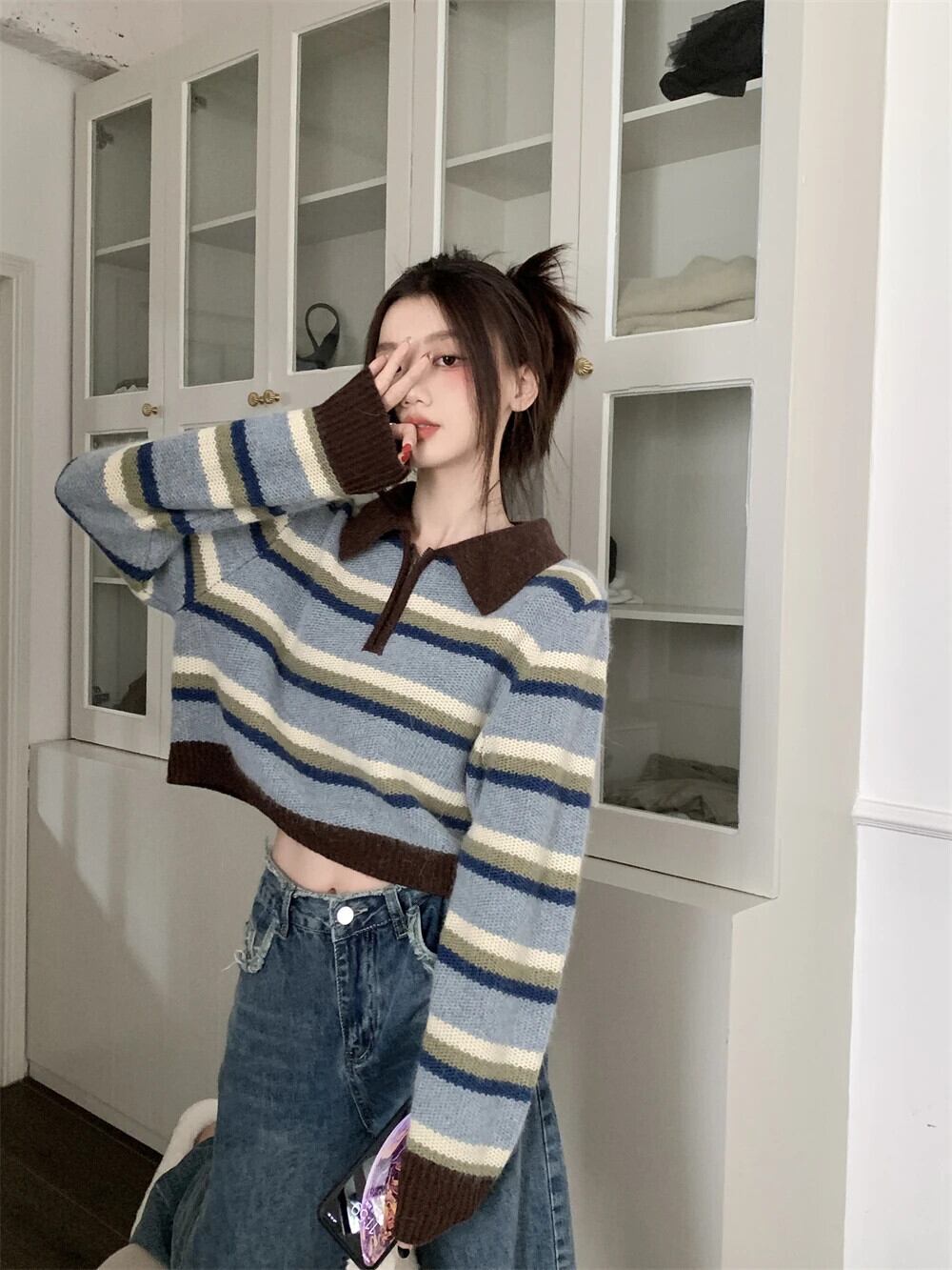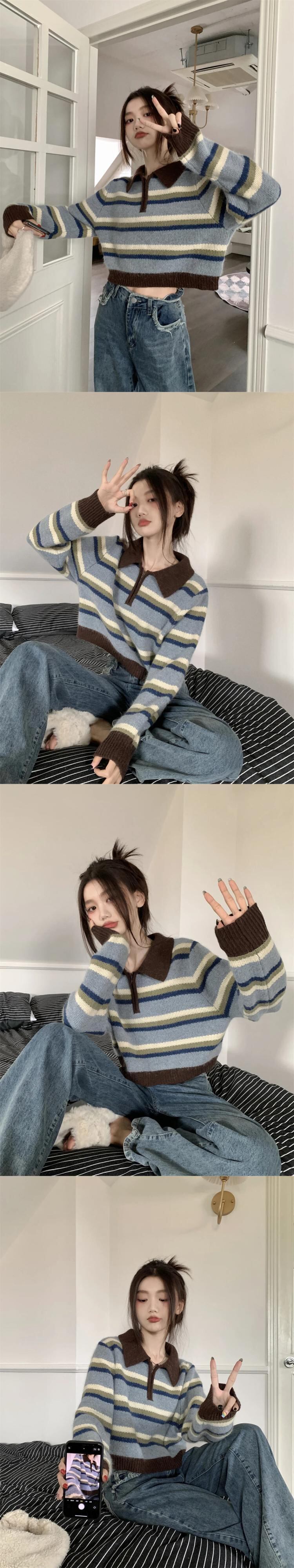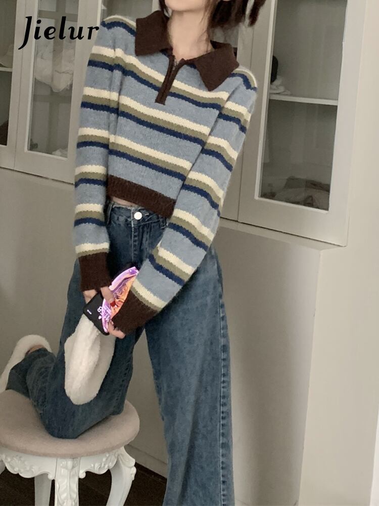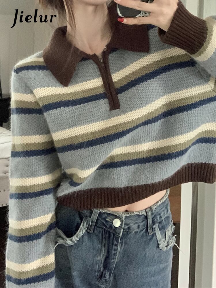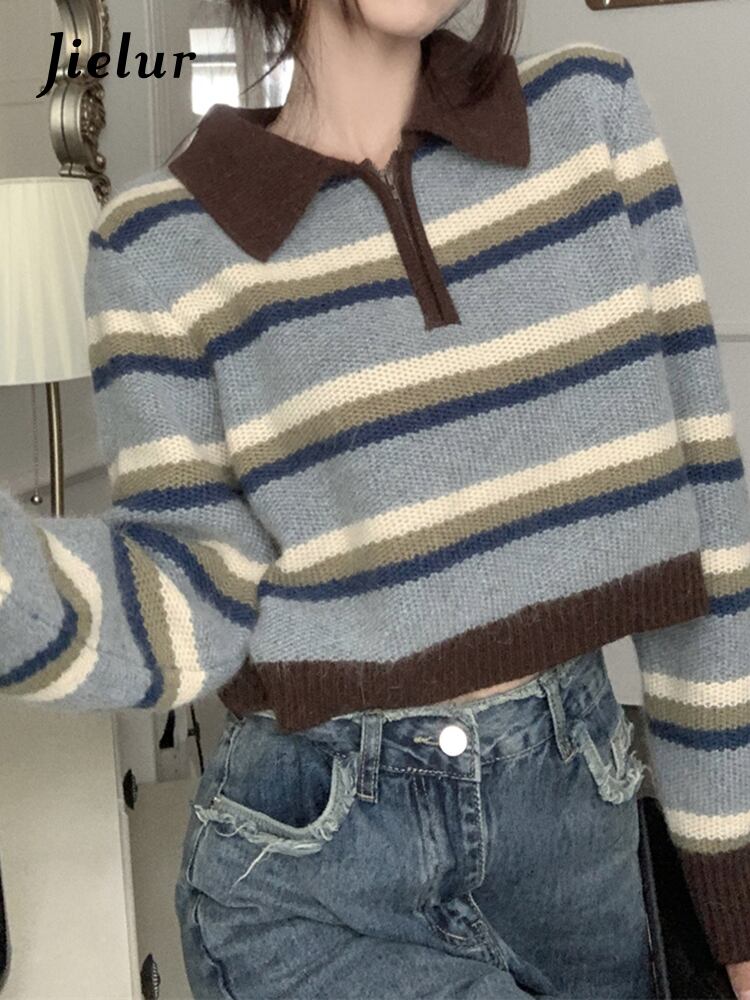送料無料 Jielur 秋ヴィンテージニットプルオーバー女性ルーズスリムコントラストカラーストライププルオーバー女性ブループルオーバー オータム 秋物 ビンテージ AE12188787875453603850
