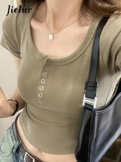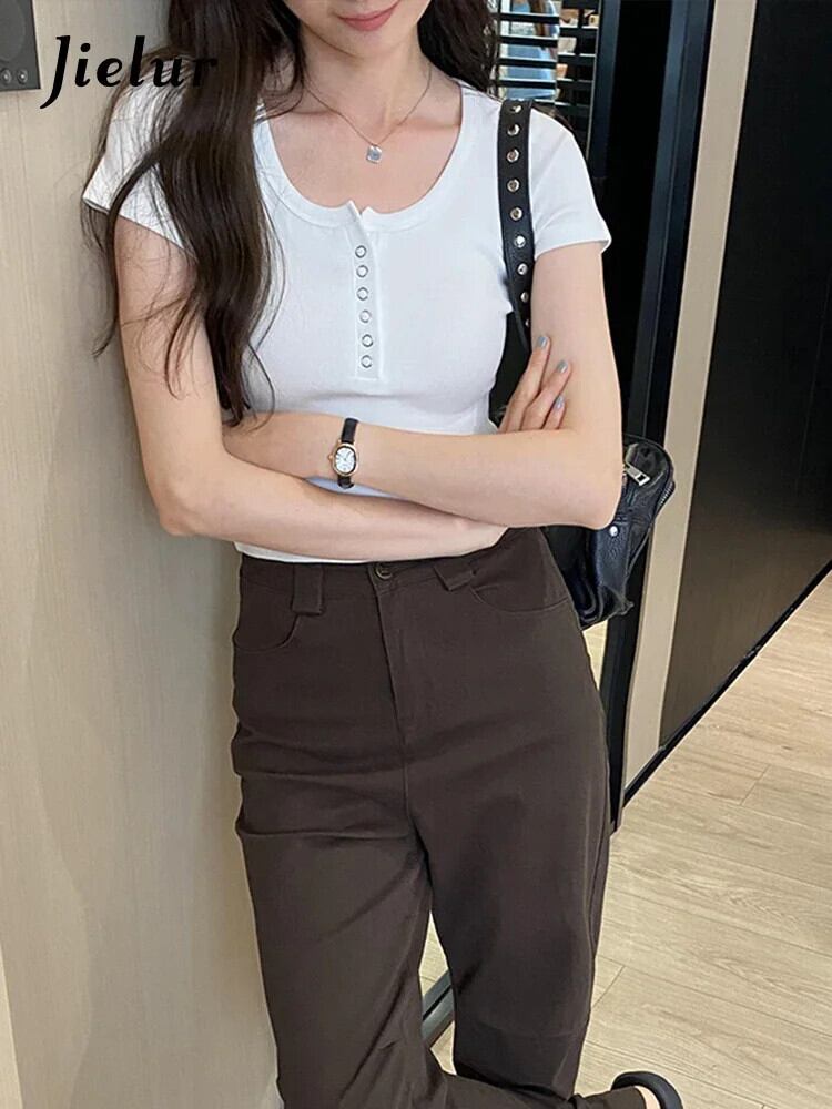 送料無料 Jielur 夏無地スリム女性の Tシャツシンプルなベーシック Tシャツ女性白ダークグレー黒ピンクシックなトップ ホワイト ブラック サマー 夏物 ソリッドカラー AE12188787896346411560