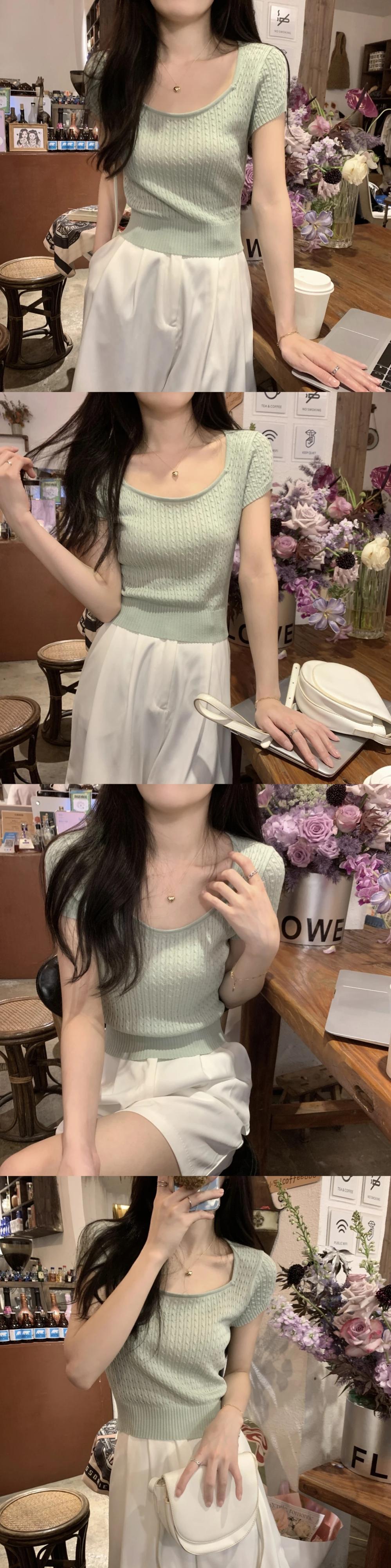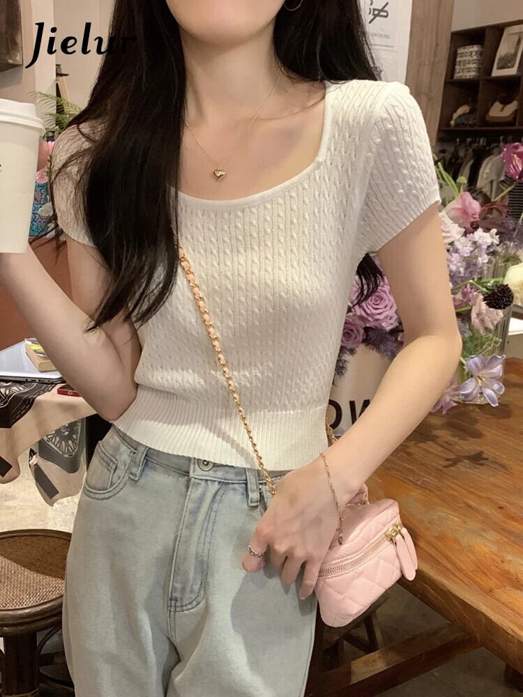 送料無料 Jielur 夏フレンチスリム固体女性 Tシャツシンプルなベーシックニット Tシャツ黒、白、アプリコット、ピンク、グリーントップ ホワイト ブラック サマー 夏物 ソリッドカラー AE12188787881196161017