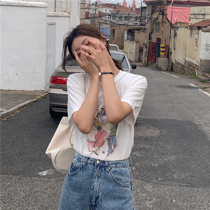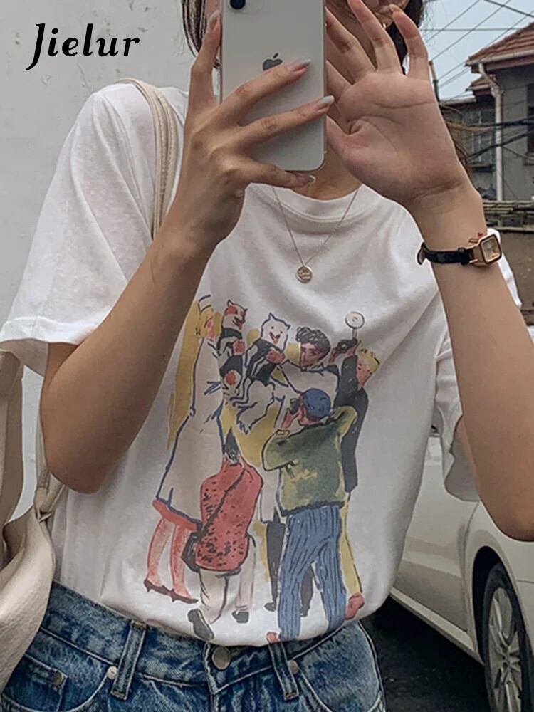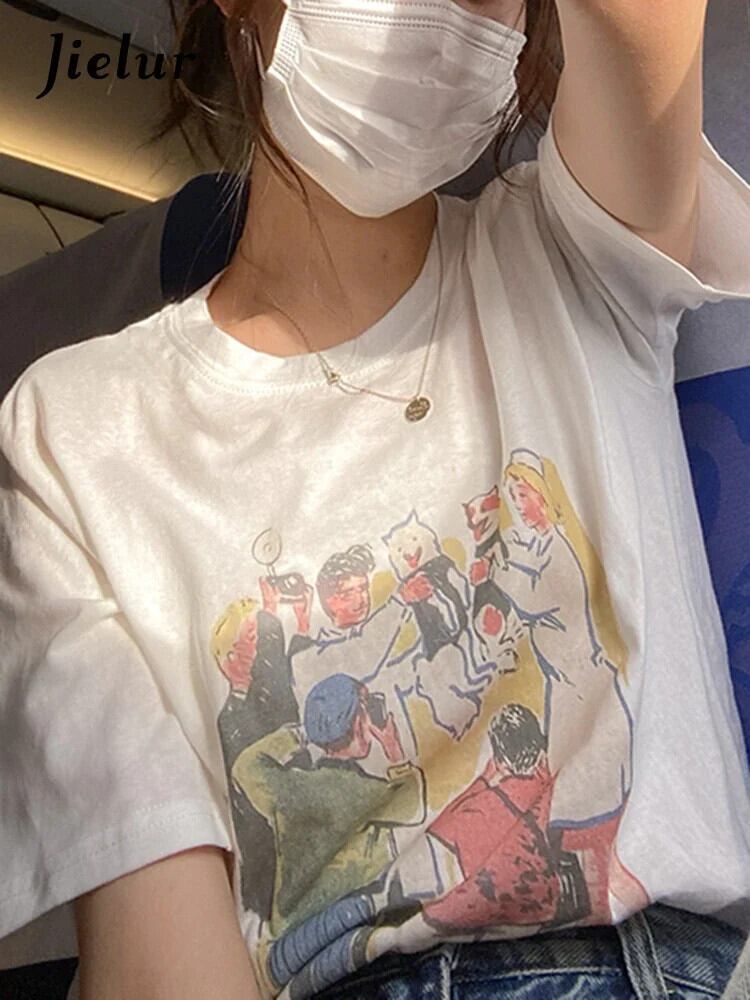 送料無料 Jielur かわいい漫画プリント半袖 Tシャツ女性の夏ベージュ白綿 O ネック Tシャツトップ 2022 M-XL ショート ホワイト コットン ハーフスリーブ 大人ガーリー スウィート キュート カジュアル サマー 夏物 Oネック AE12188787844025020420