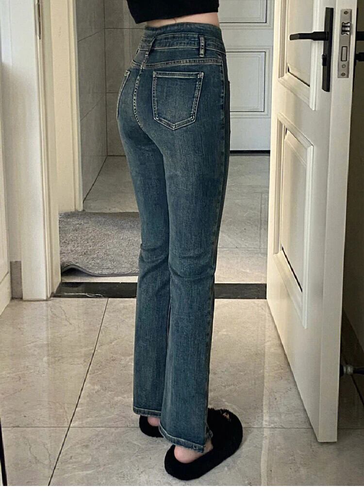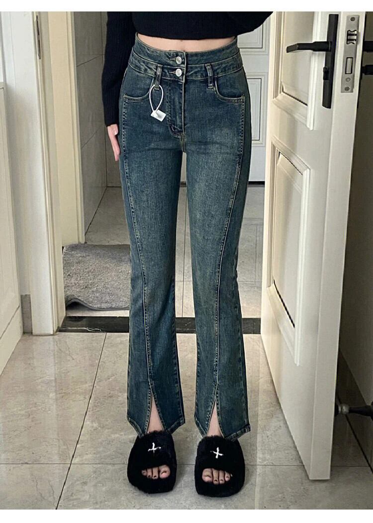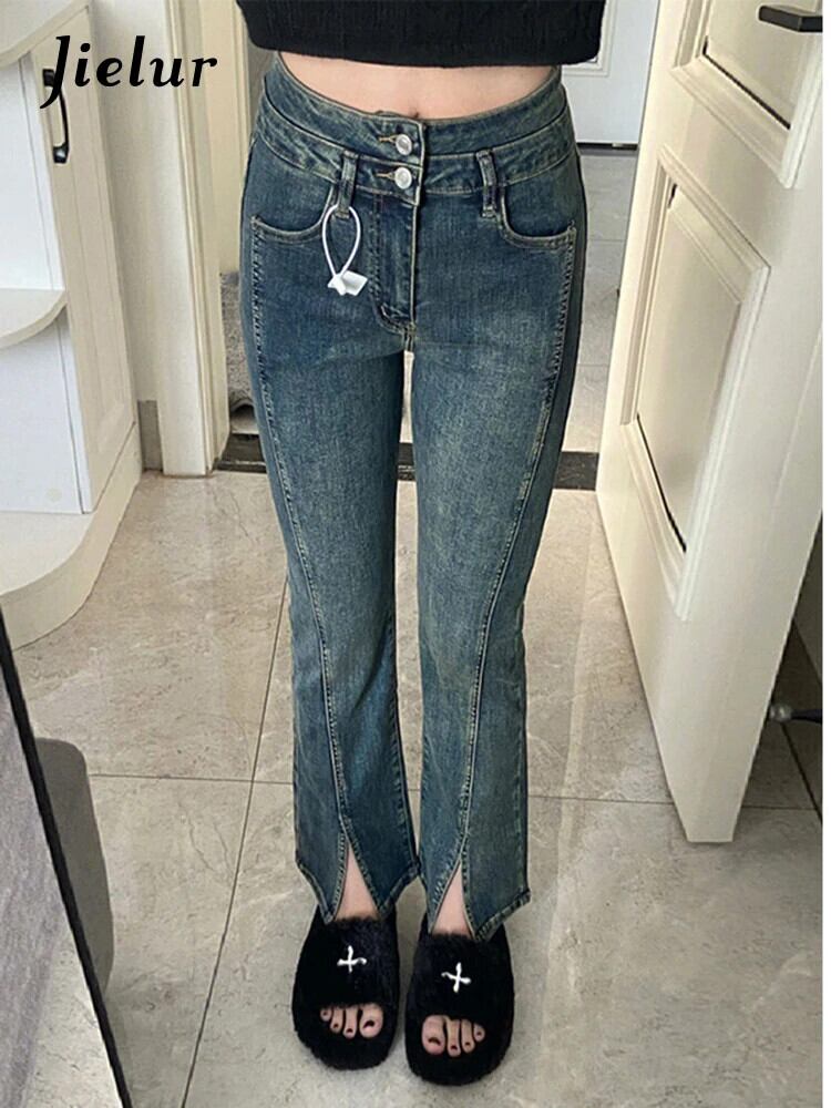 送料無料 Jielur ウエストレトロスプリットレディースジーンズスリムシンプルなストレートジーンズ女性のベーシックレトロブルーパンツ AE12188787852307030121