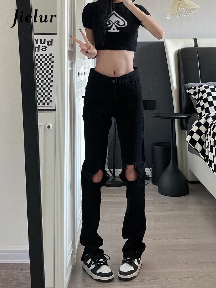 送料無料 Jielur ストリートアメリカンユーズド加工レディースジーンズヒップホップソリッドカラースリム穴女性ジーンズ黒パンツ ブラック AE12188787855704248307
