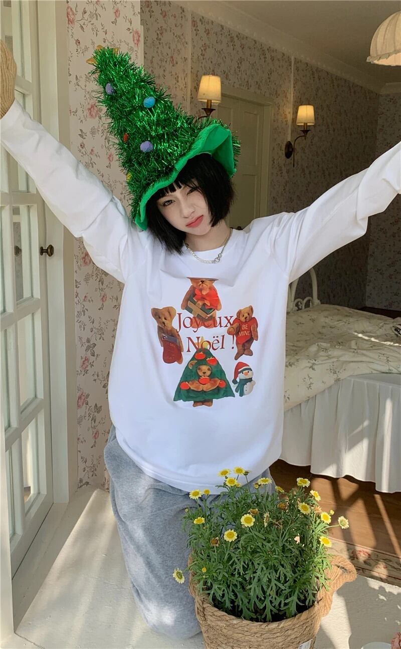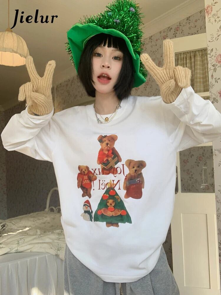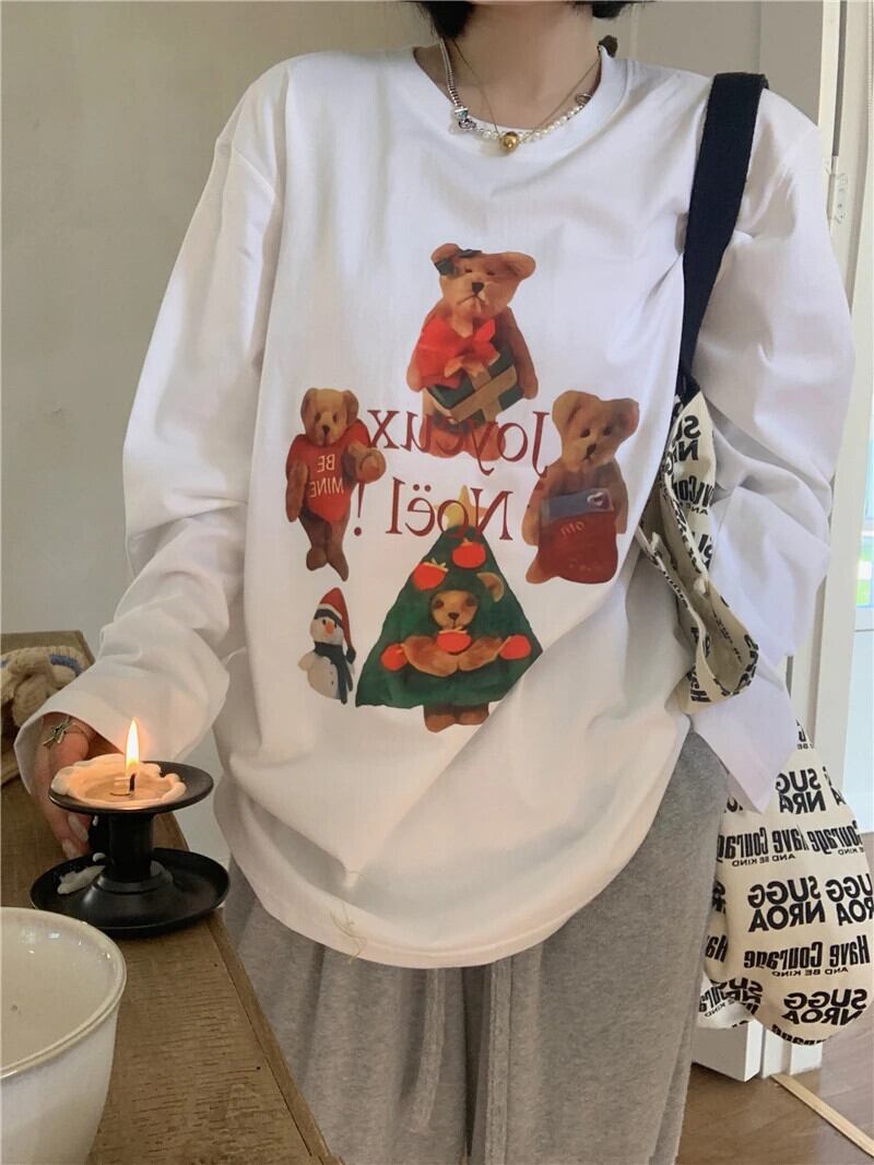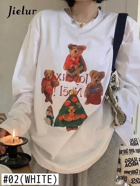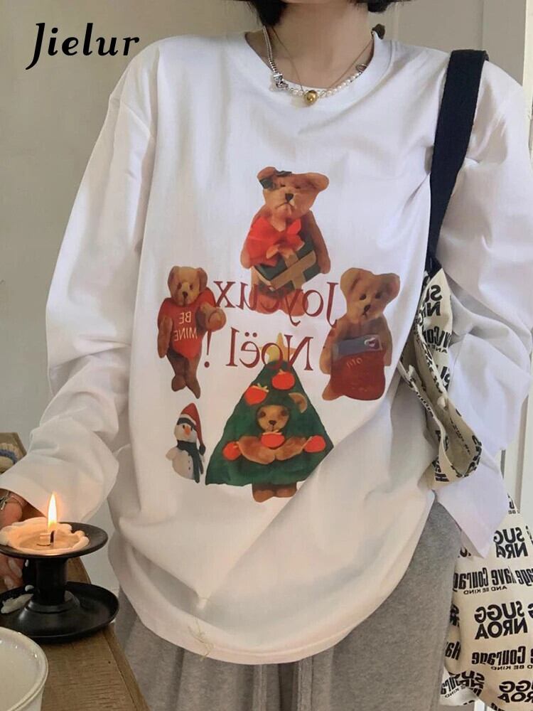 送料無料 Jielur クリスマスクマプリント O ネック長袖 Tシャツ女性白 Tシャツ春スタイルかわいい Tシャツ ロング ホワイト 大人ガーリー スウィート キュート カジュアル スプリング 春物 Oネック AE12188787866966798080