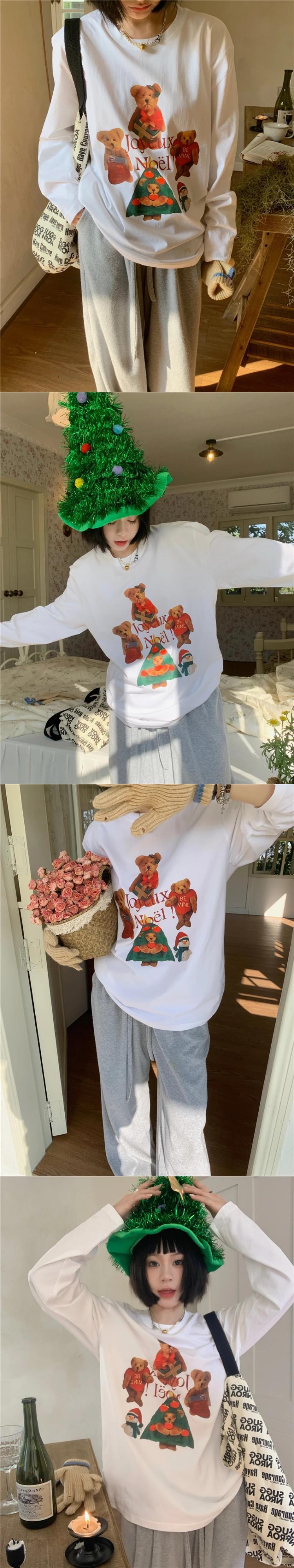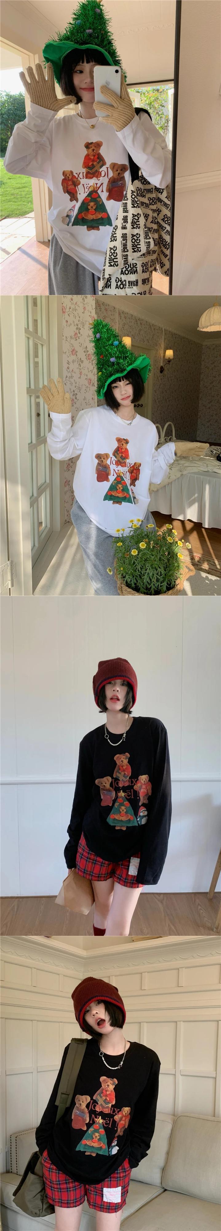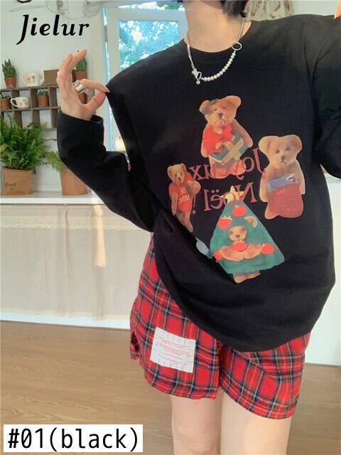 送料無料 Jielur クリスマスクマプリント O ネック長袖 Tシャツ女性白 Tシャツ春スタイルかわいい Tシャツ ロング ホワイト 大人ガーリー スウィート キュート カジュアル スプリング 春物 Oネック AE12188787866966798080