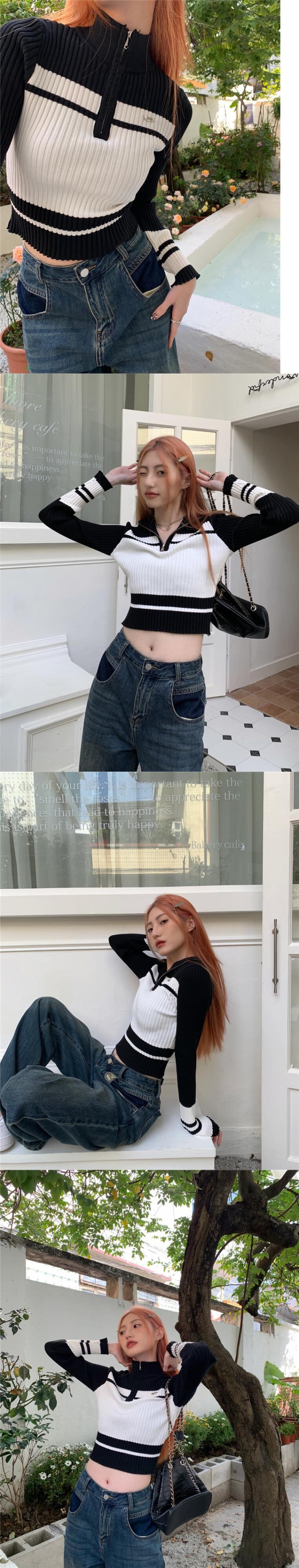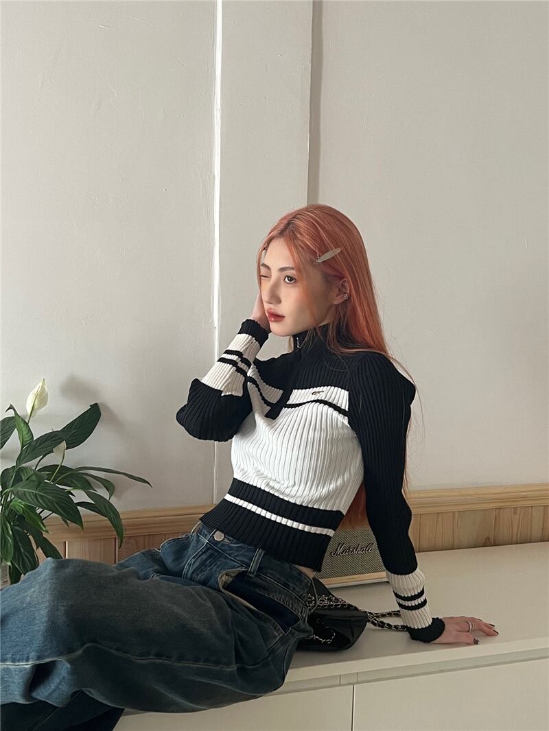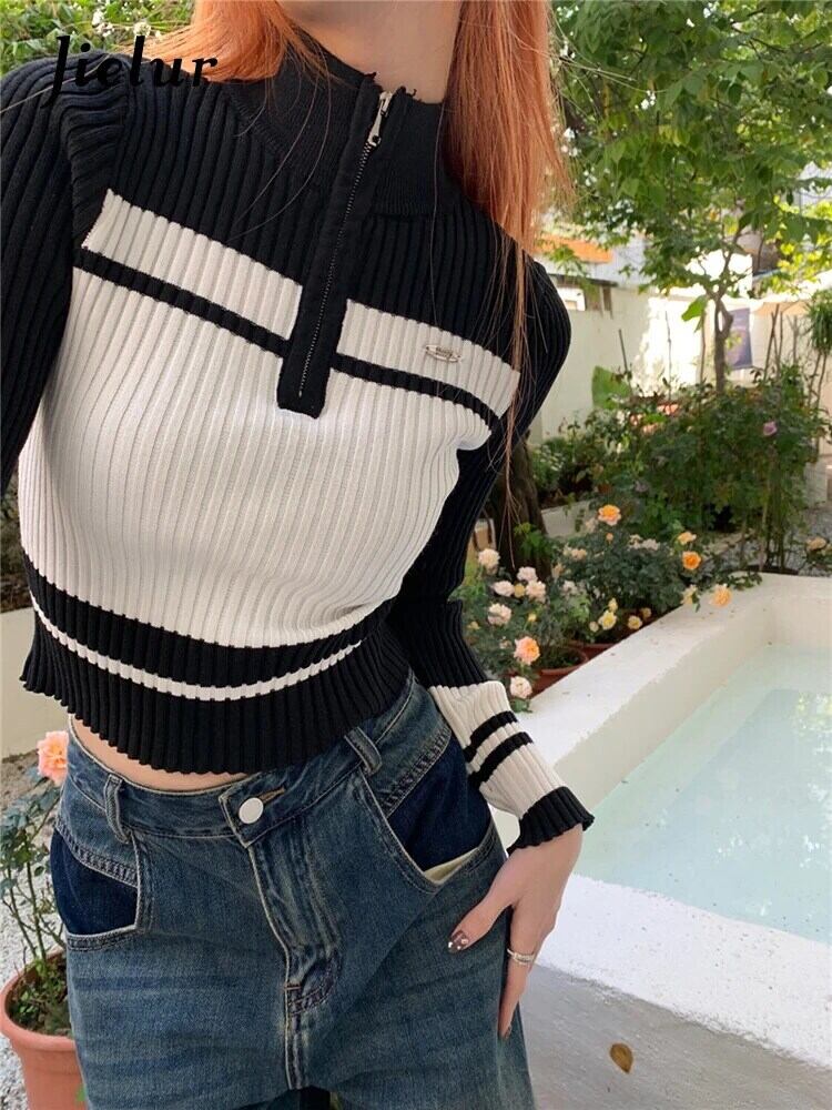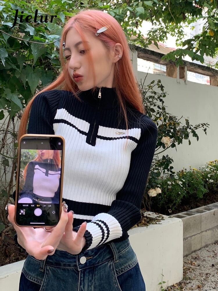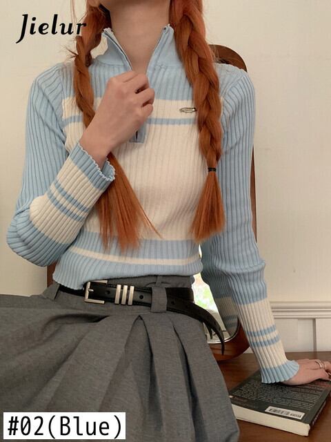 送料無料 Jielur 春スタイルショートニットトップ長袖スリムセータージッパー女性プルオーバーニット Tシャツ ロング スプリング 春物 AE12188787820793950808