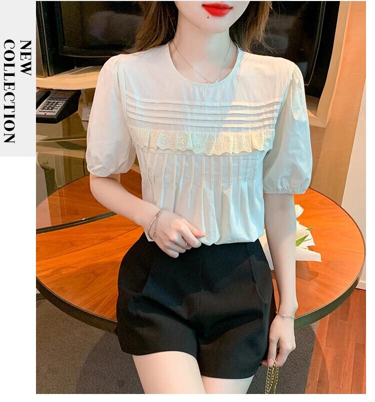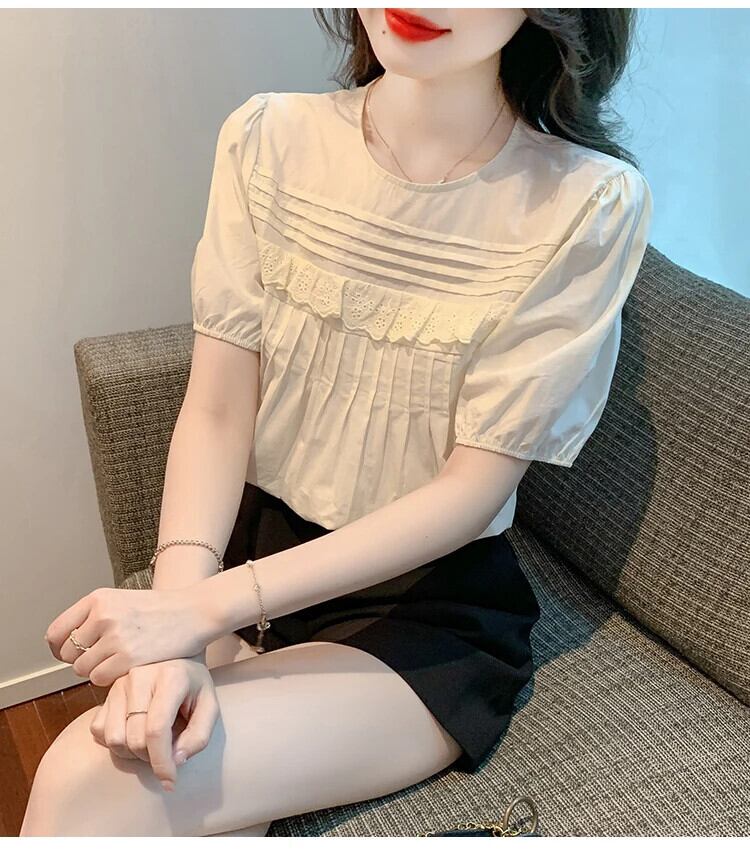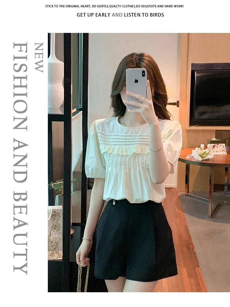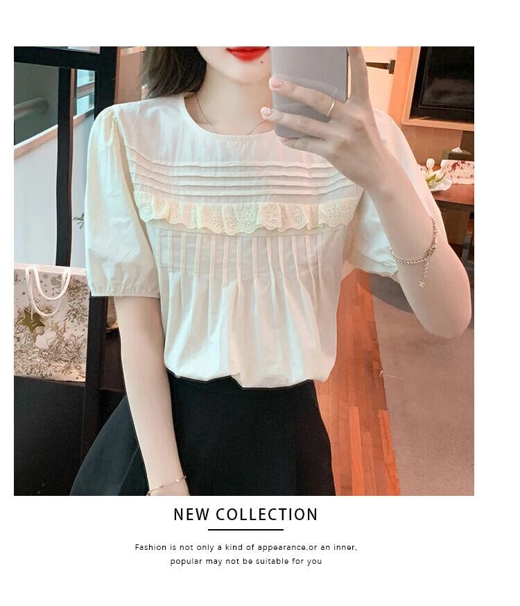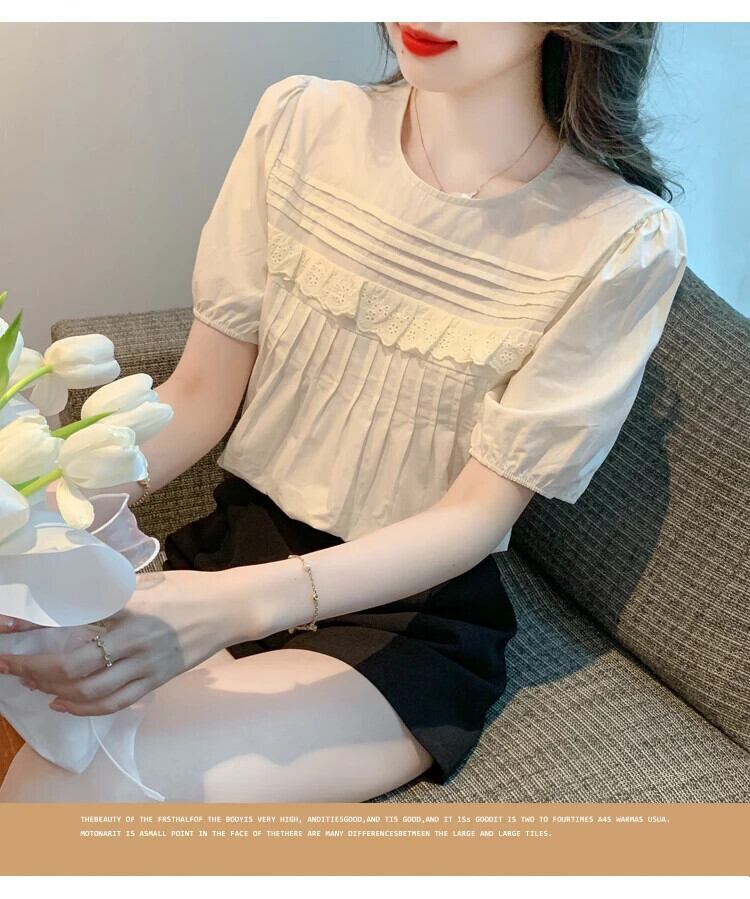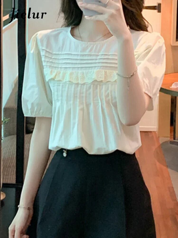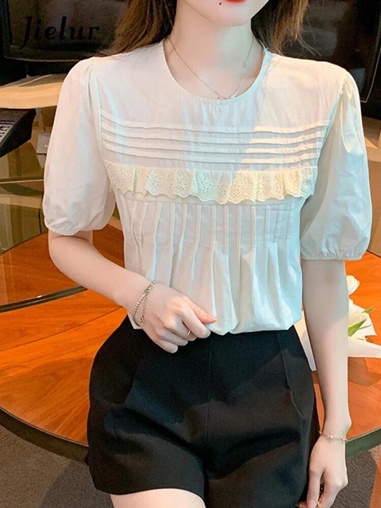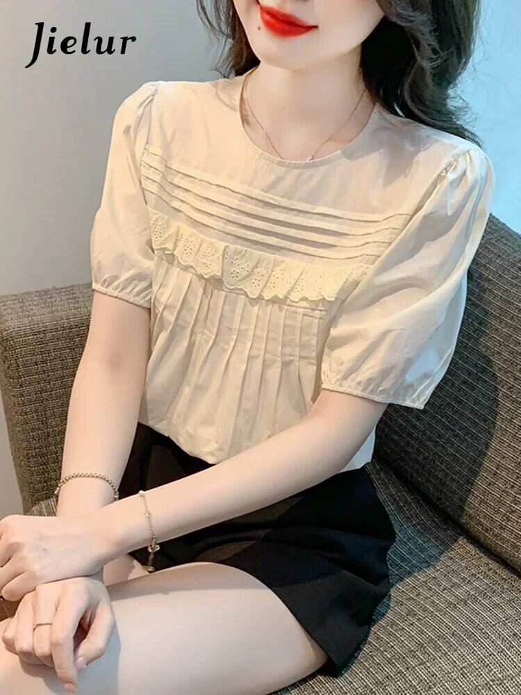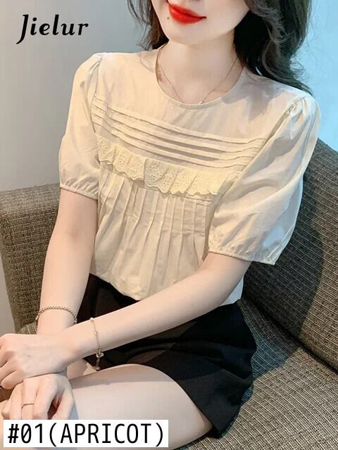 送料無料 Jielur 夏フレンチソリッドカラーの女性ブラウス甘いルーズスリムシックなブラウス女性アプリコット SlimO-ネックトップ 大人ガーリー スウィート キュート カジュアル サマー 夏物 Oネック AE1218878787405767227