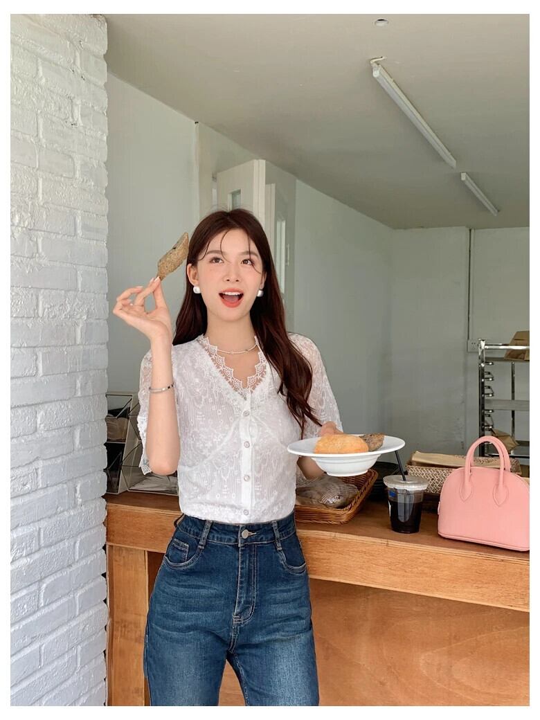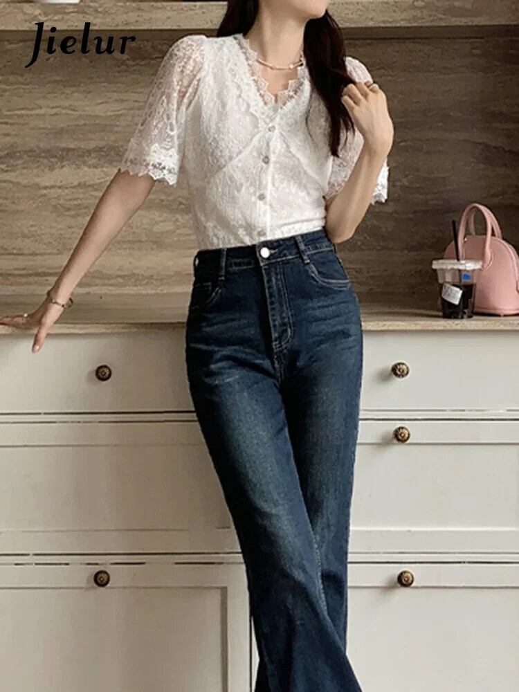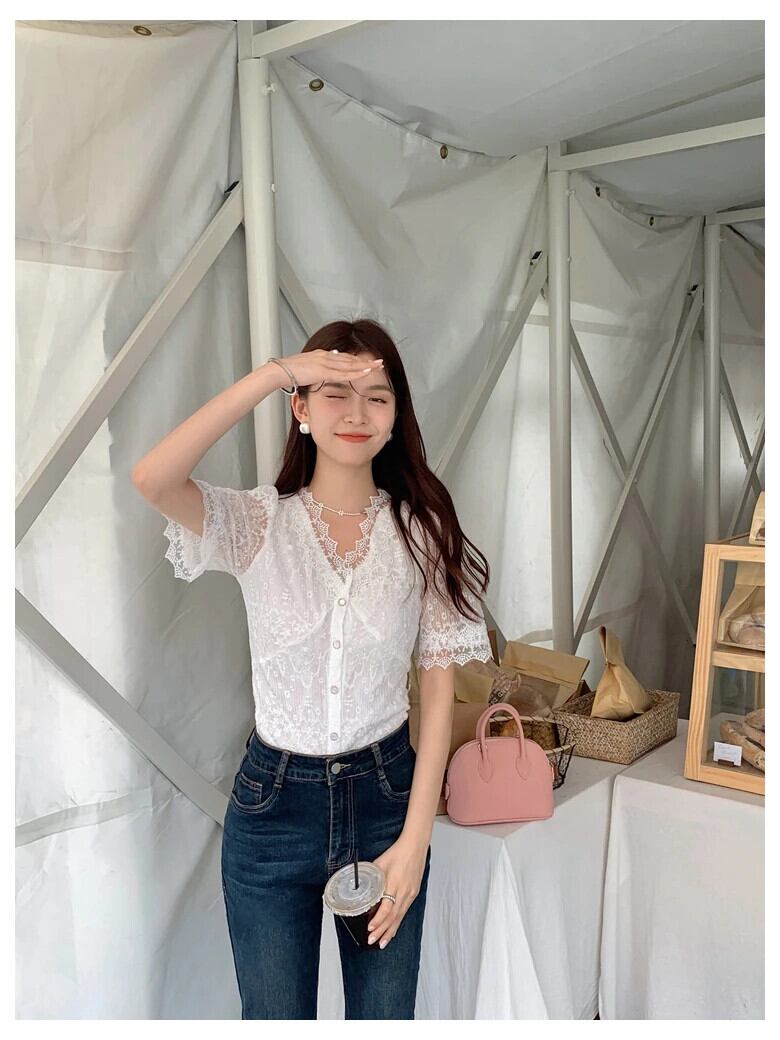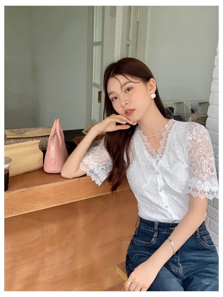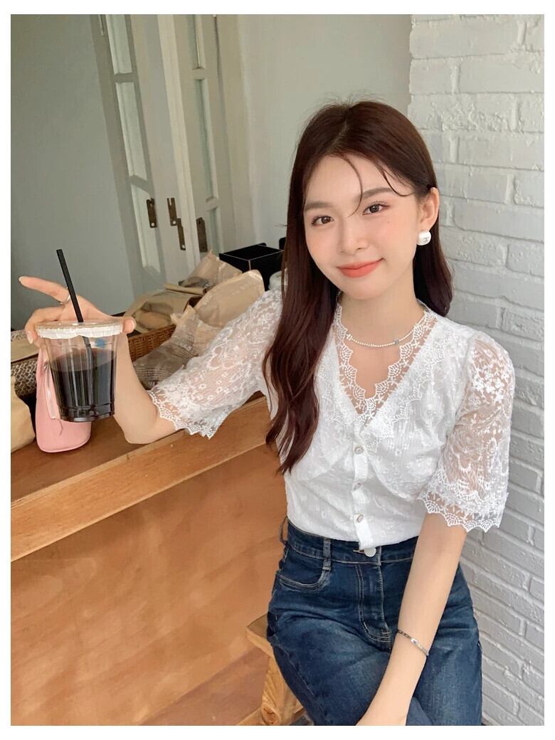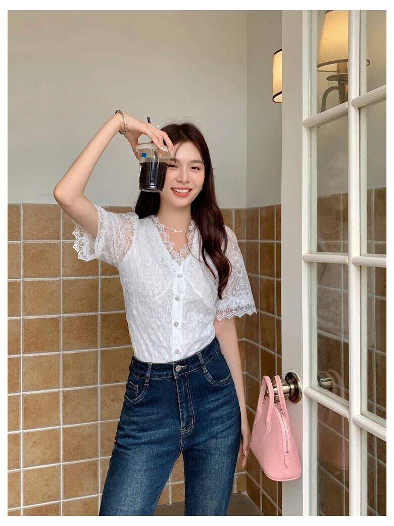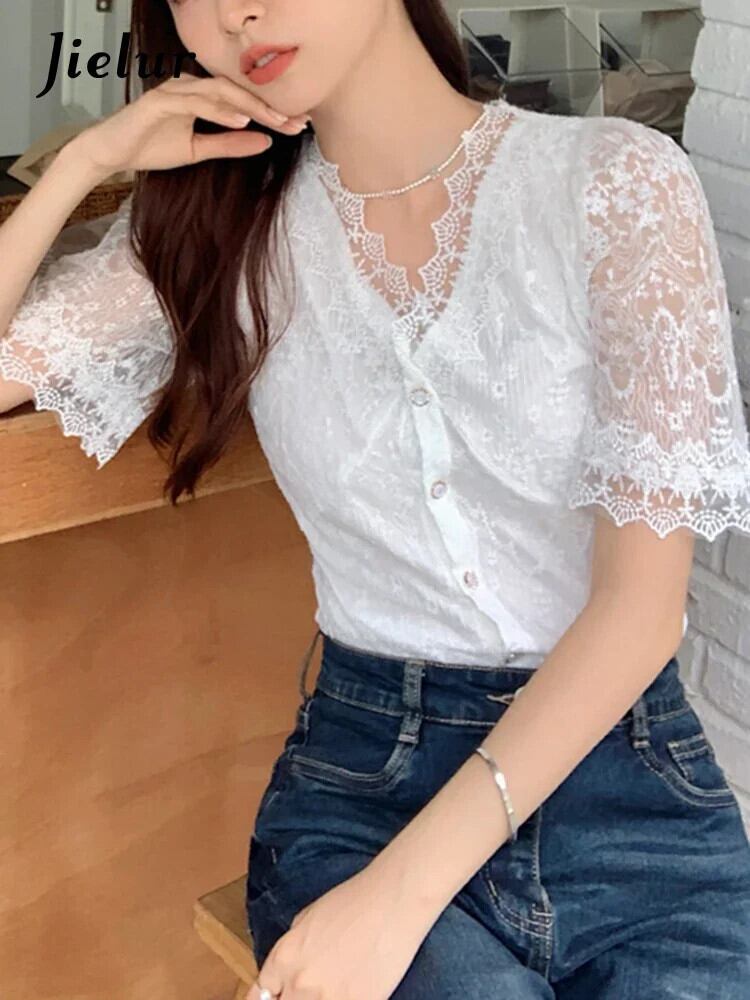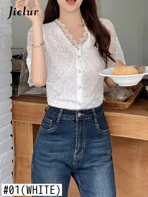 送料無料 Jielur 夏無地スリム女性ブラウスシックなレースのブラウス女性白甘い若いトップ ホワイト 大人ガーリー スウィート キュート カジュアル サマー 夏物 ソリッドカラー AE12188787815414074657
