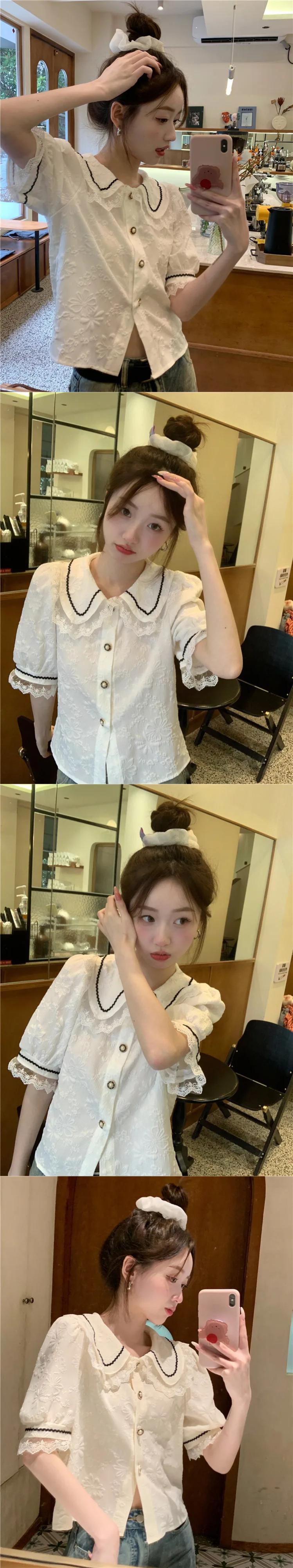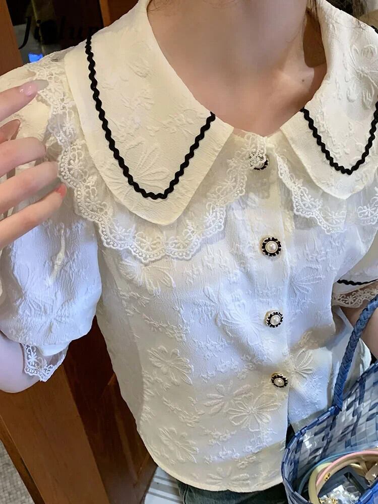 送料無料 Jielur 夏フレンチヴィンテージ女性シャツコントラストカラースリム甘いシャツ女性白アプリコットルーズパフスリーブトップ ホワイト 大人ガーリー スウィート キュート カジュアル サマー 夏物 ビンテージ AE12188787867976027108