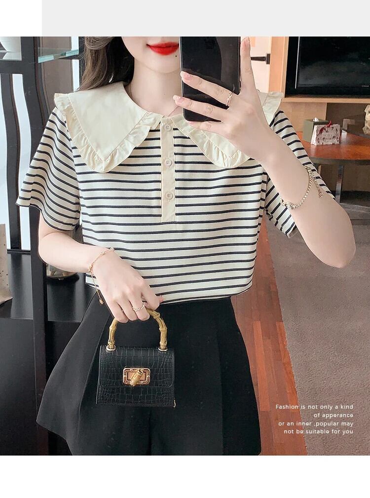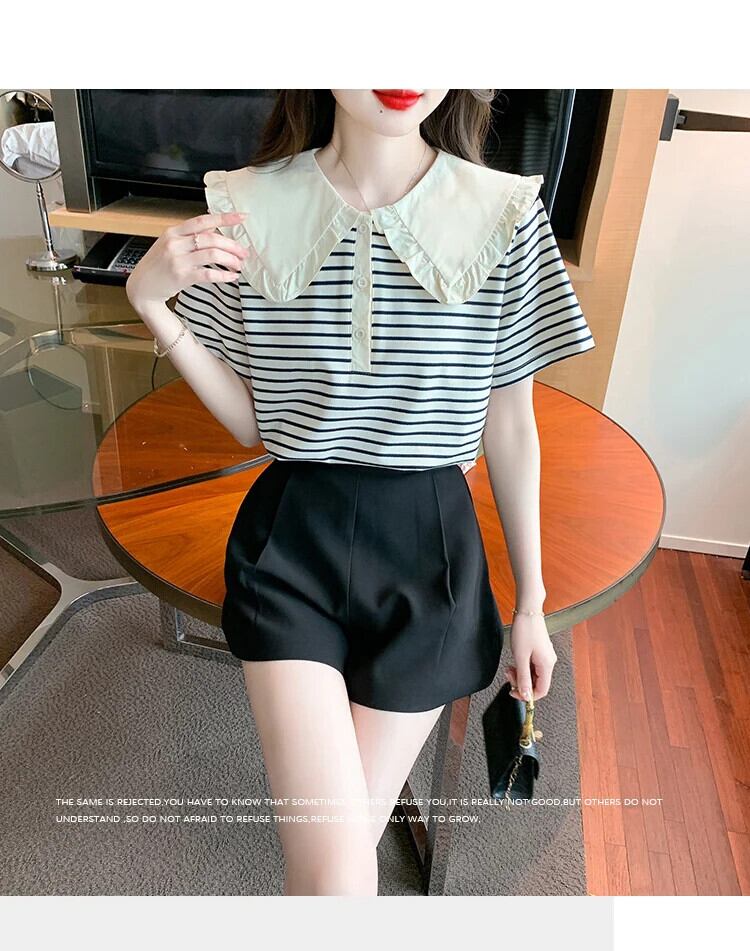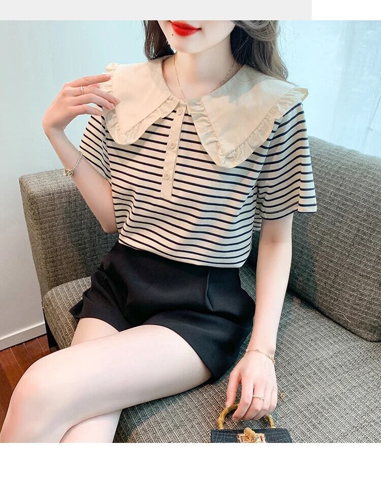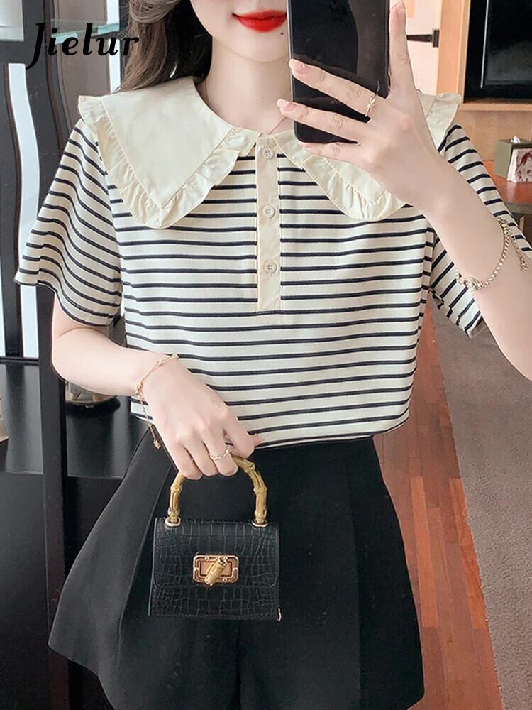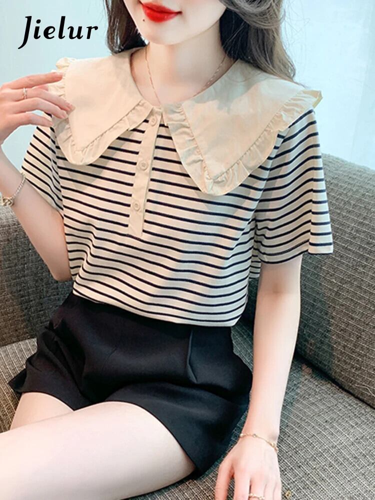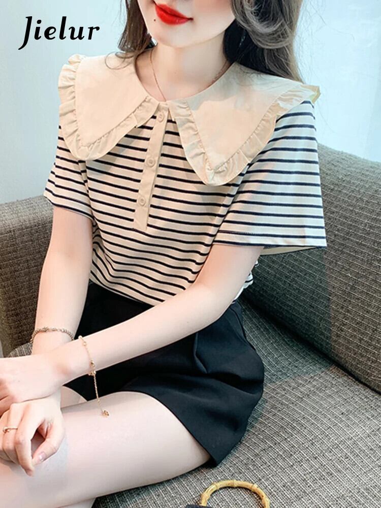 送料無料 Jielur 夏の女性のブラウスサイドストライプストリートルーズブラウス女性シックなスリムフリル甘いトップ 大人ガーリー スウィート キュート カジュアル サマー 夏物 AE12188787892257619823