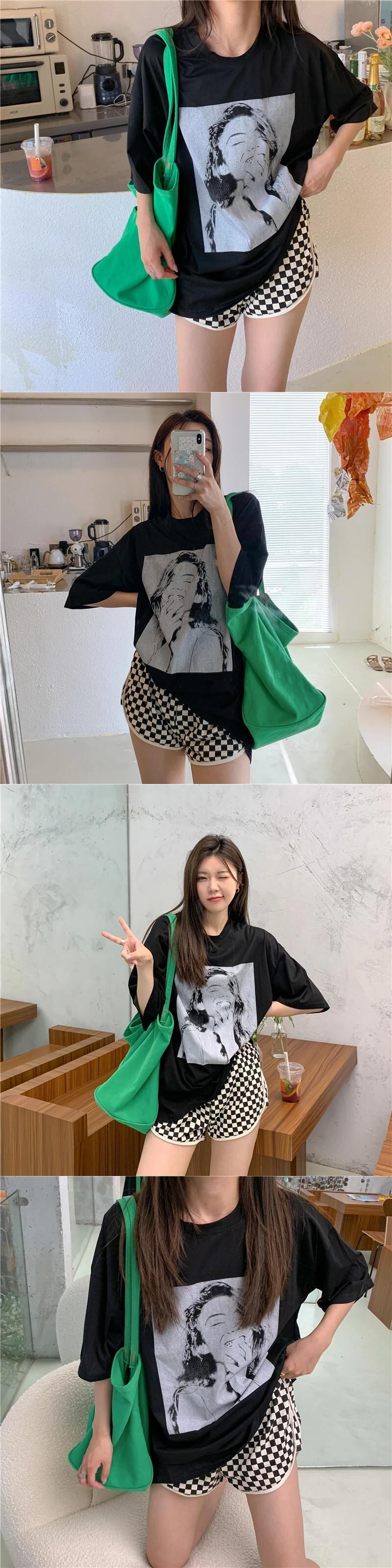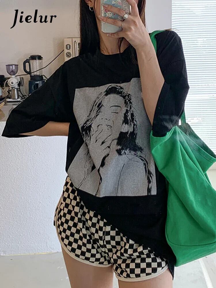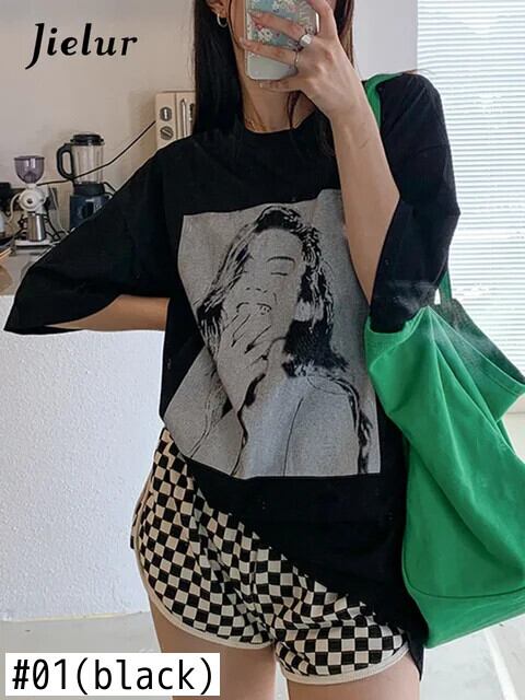 送料無料 Jielur クリエイティブポートレートプリント女性の Tシャツ白黒 Tシャツ夏の Tシャツ半袖レトロストリート ショート ホワイト ブラック ハーフスリーブ サマー 夏物 AE12188787826824869185