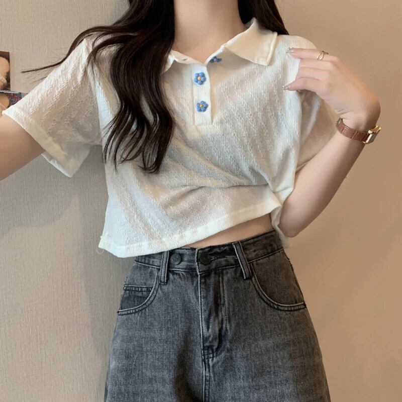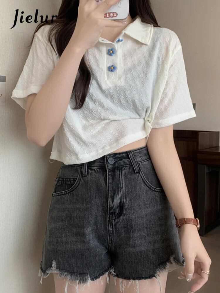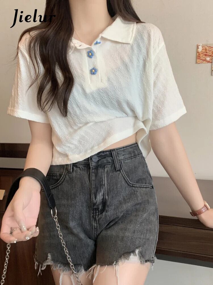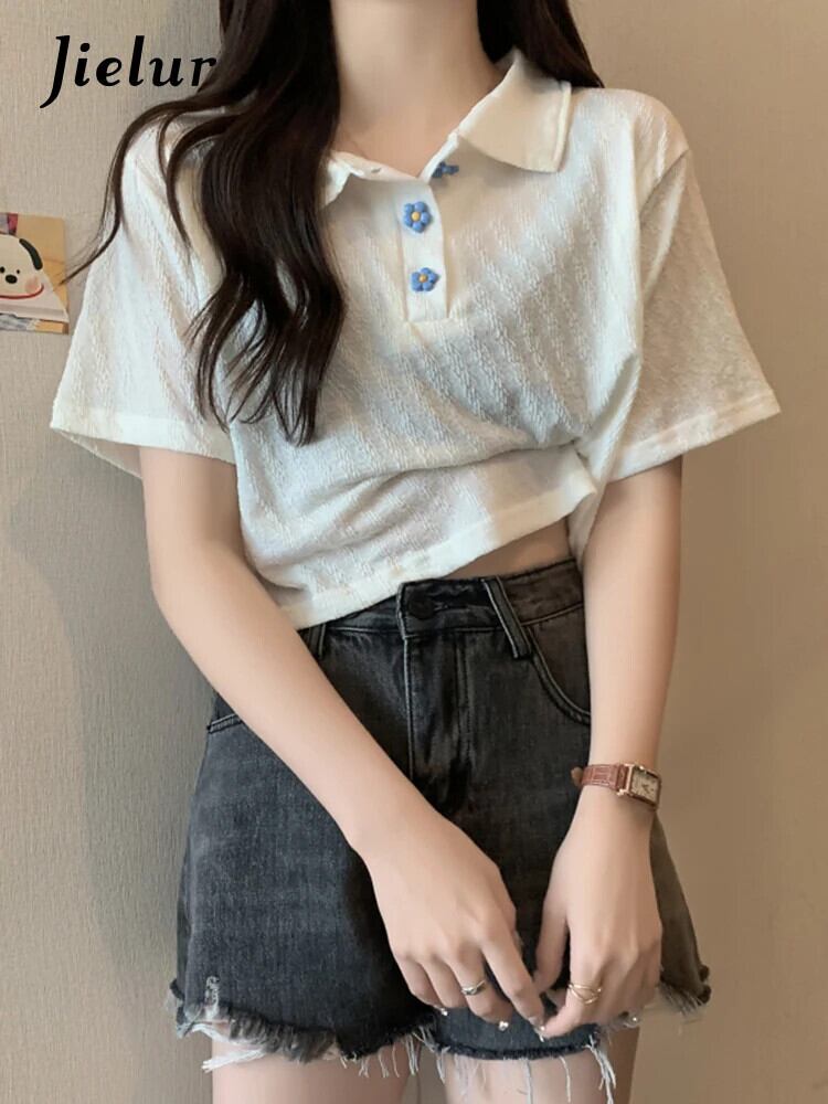 送料無料 Jielur ポロネック半袖 Tシャツ原宿スタイルトップ Tシャツジャカードアプリコット服女性 Tシャツ M-XL ショート ハーフスリーブ かわいい AE12188787873019182593