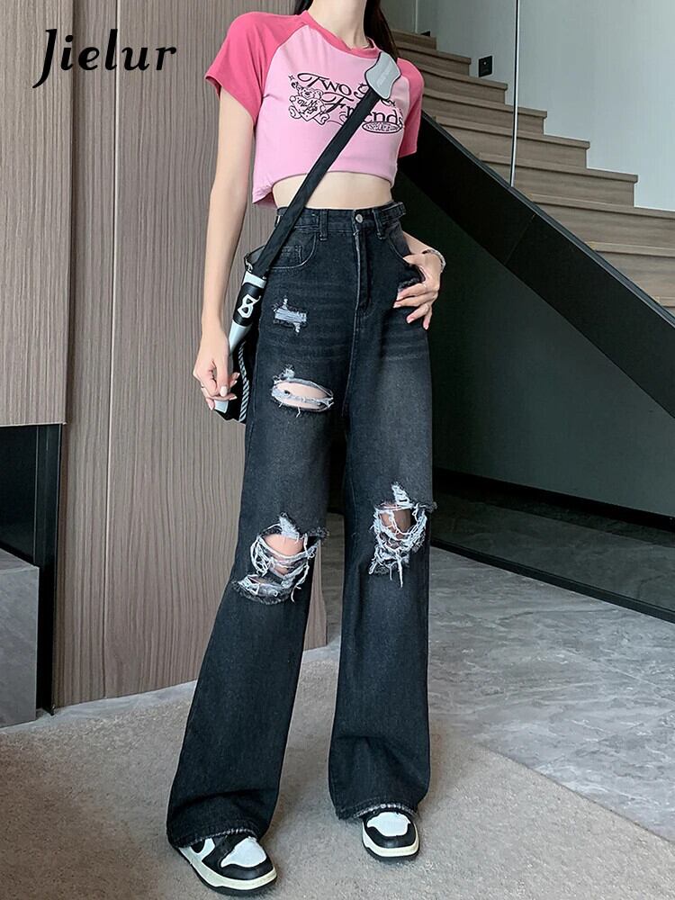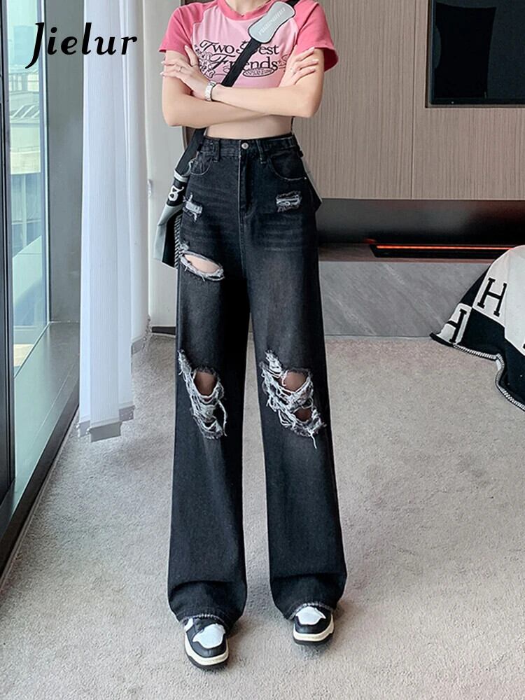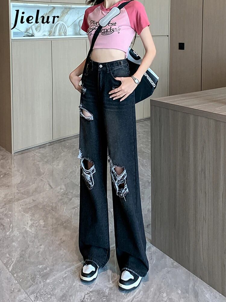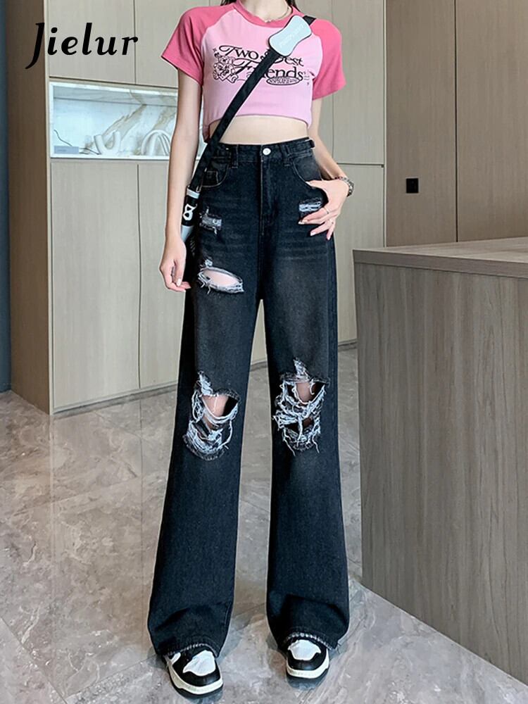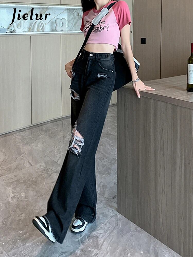 送料無料 Jielur 夏ウエスト穴女性のジーンズルーズインジーンズ女性黒シンプルなベーシック Chicly パンツ ブラック サマー 夏物 AE12188787877837414219