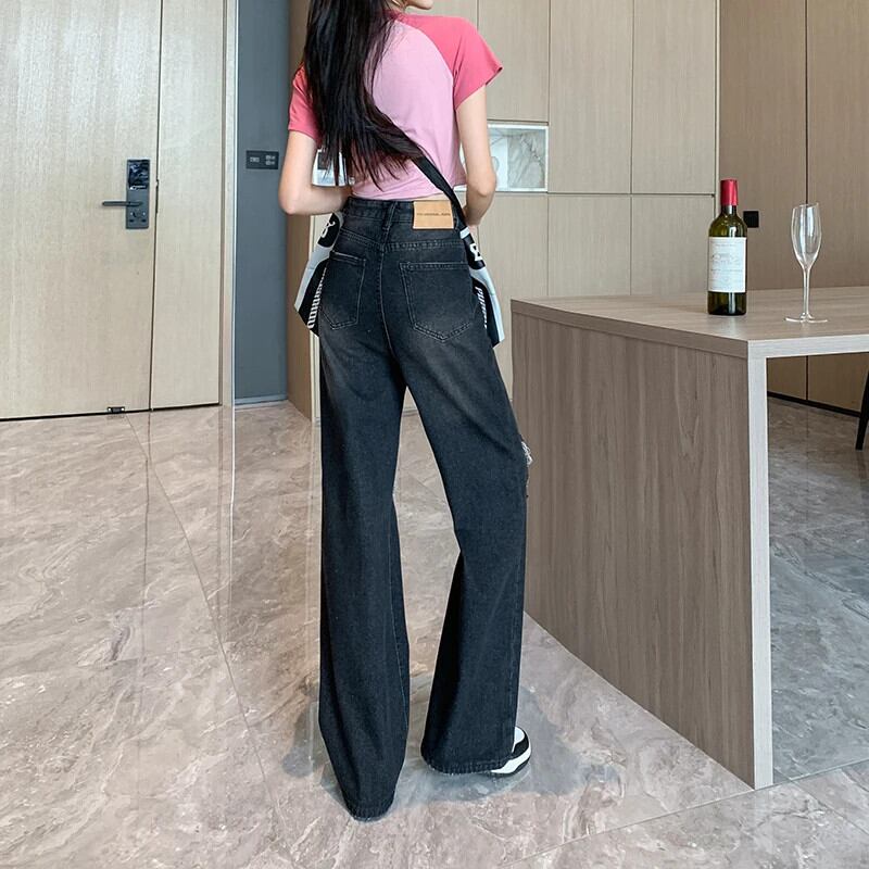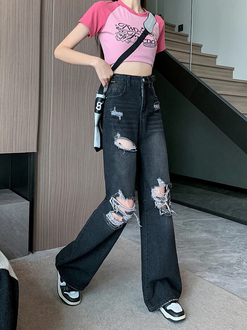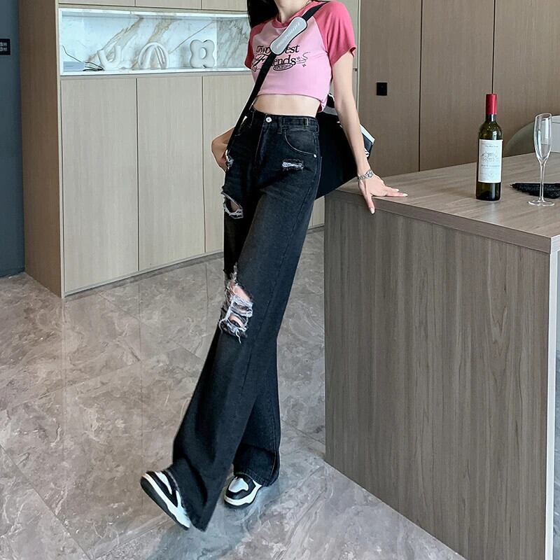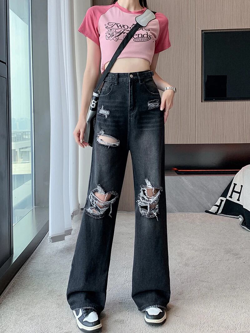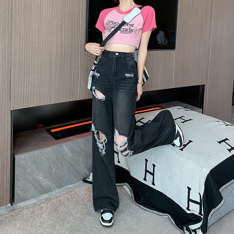 送料無料 Jielur 夏ウエスト穴女性のジーンズルーズインジーンズ女性黒シンプルなベーシック Chicly パンツ ブラック サマー 夏物 AE12188787877837414219